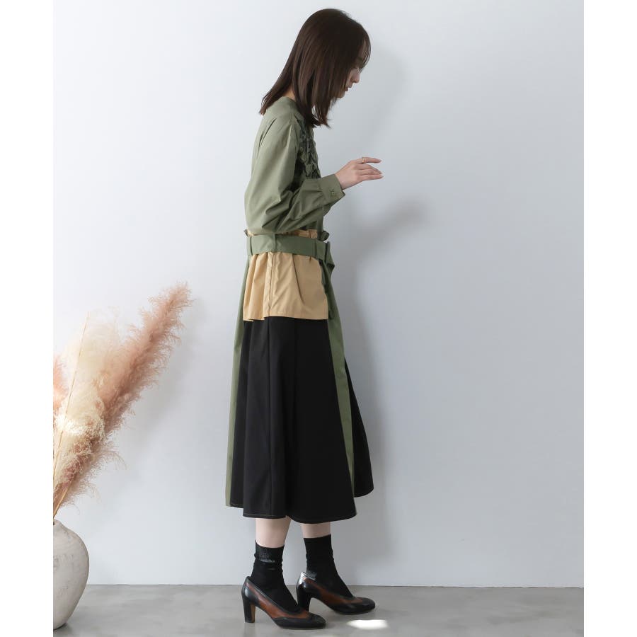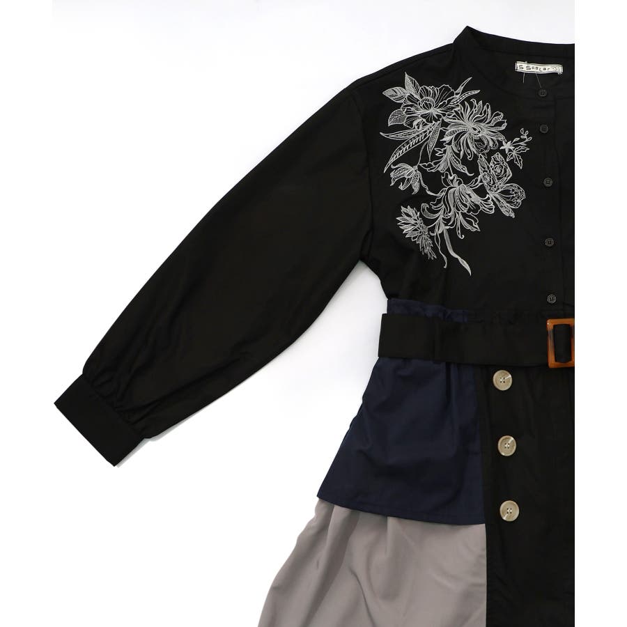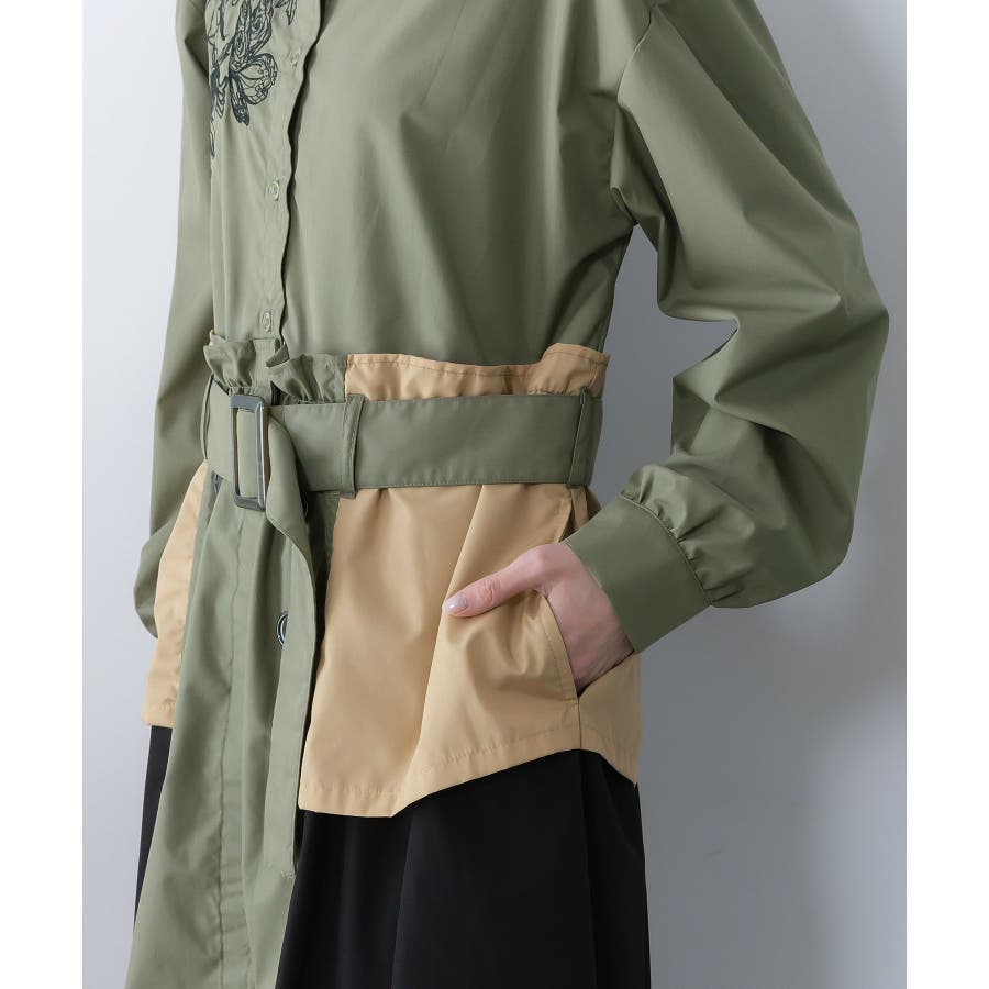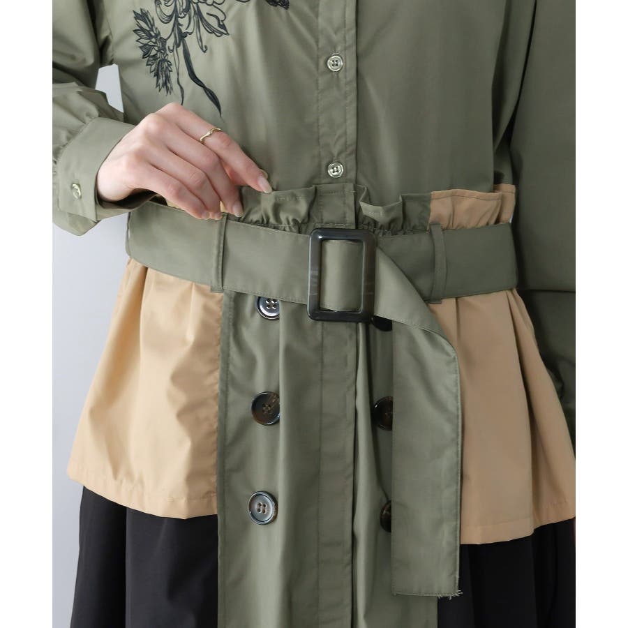 花刺繍トレンチコート風 異素材切替ワンピース