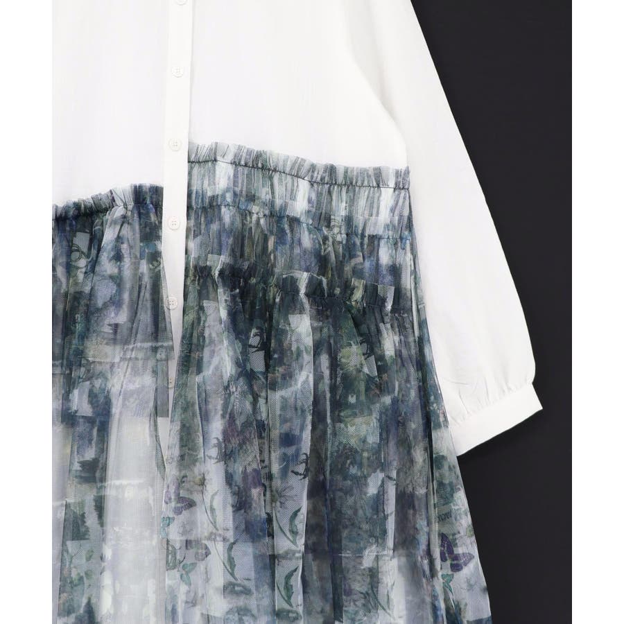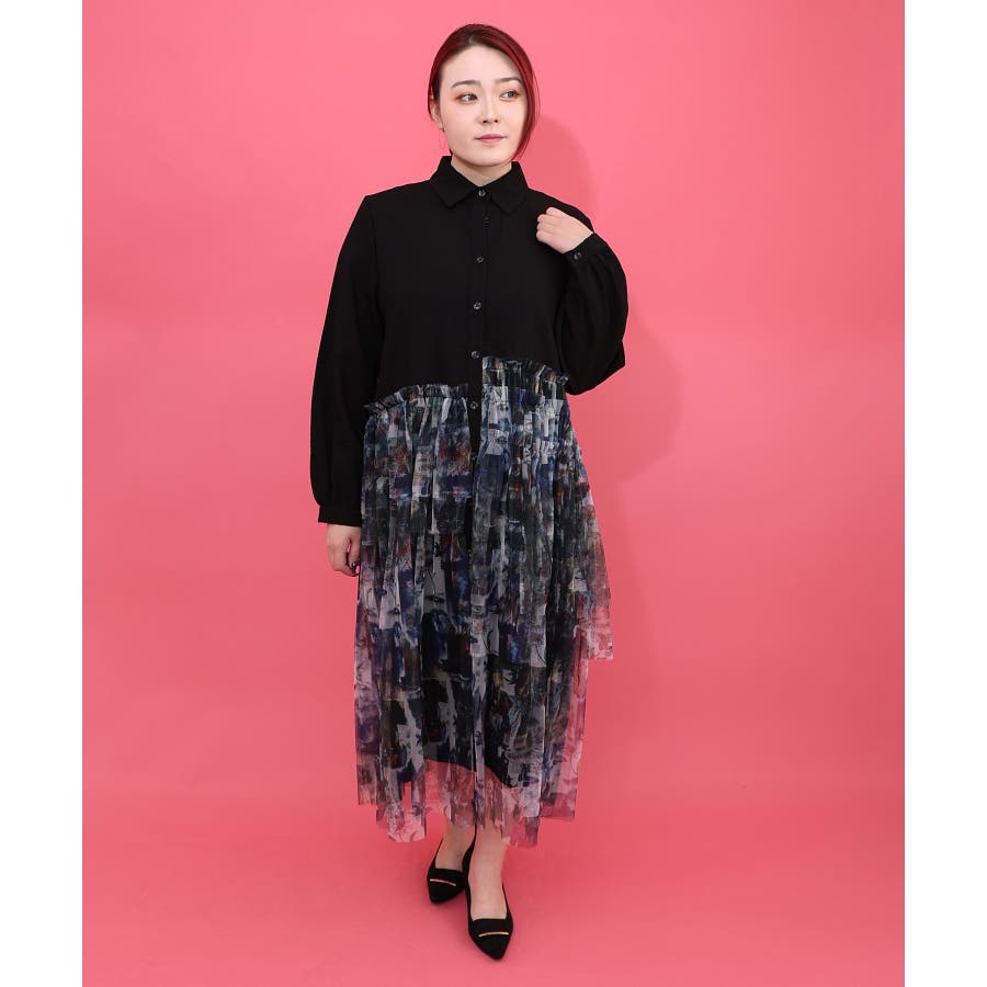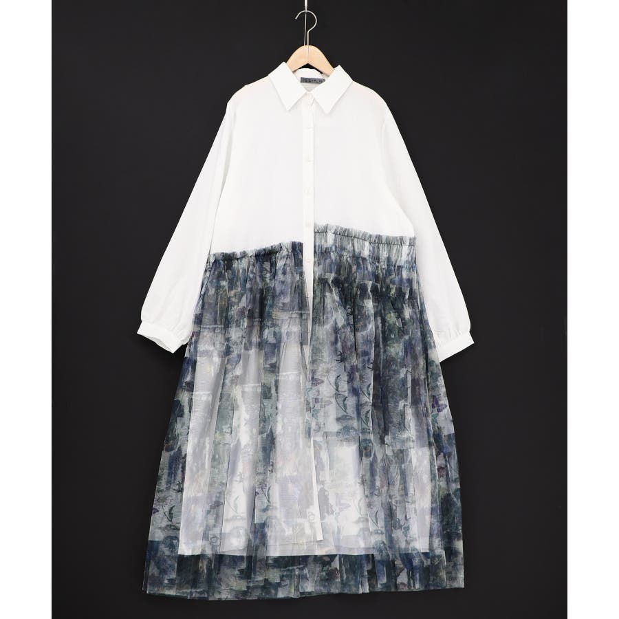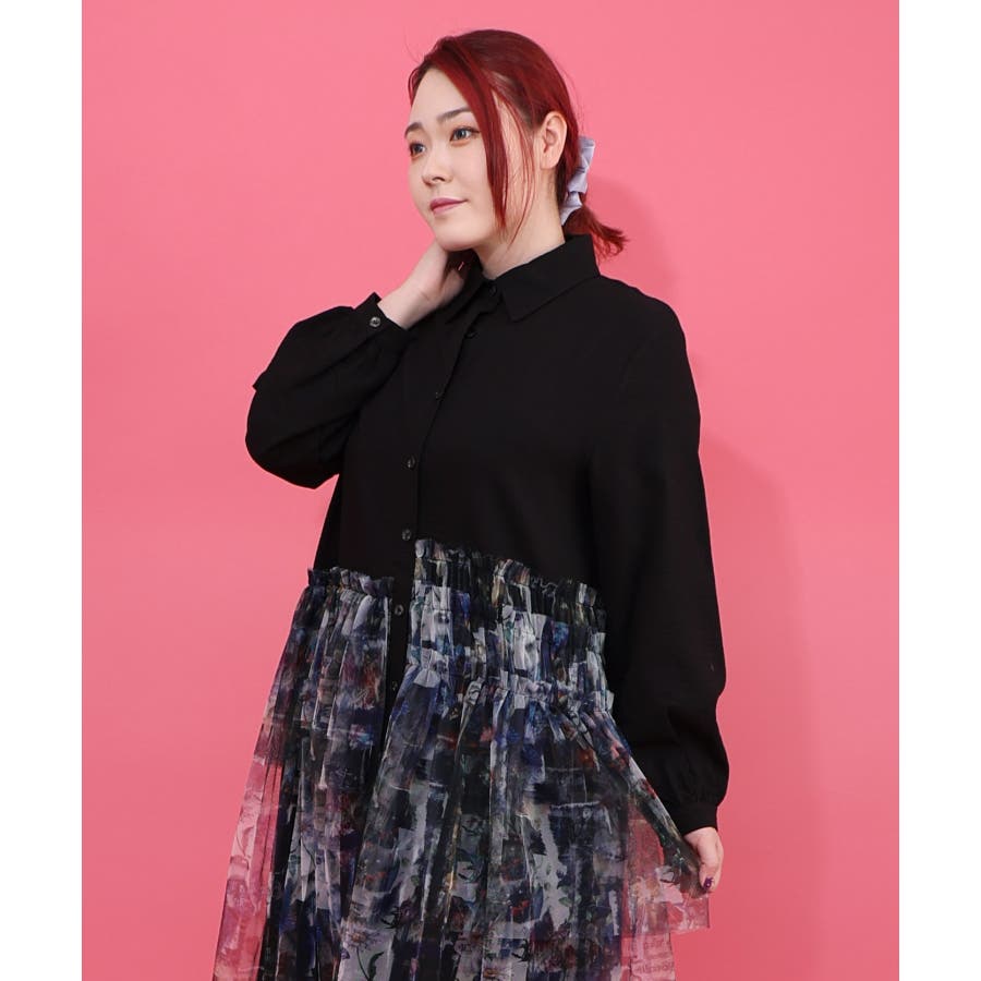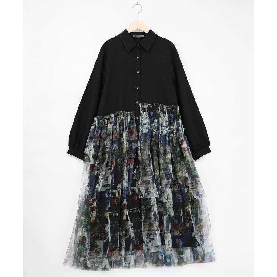 魔女の秘密柄チュール重ね異素材切替シャツワンピース