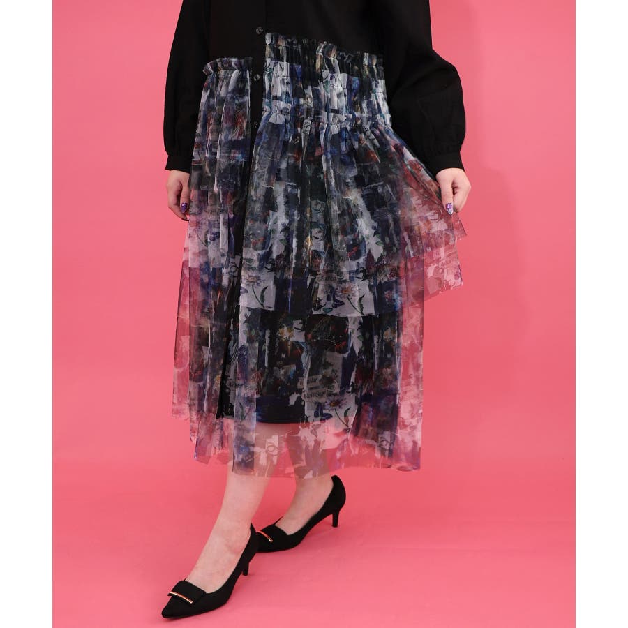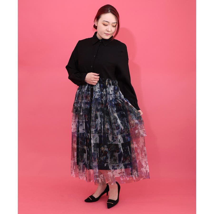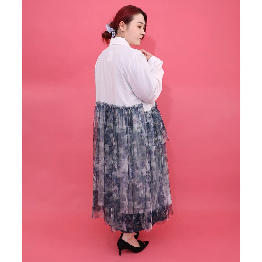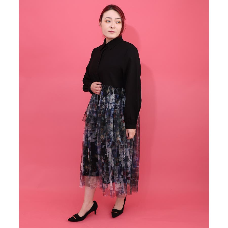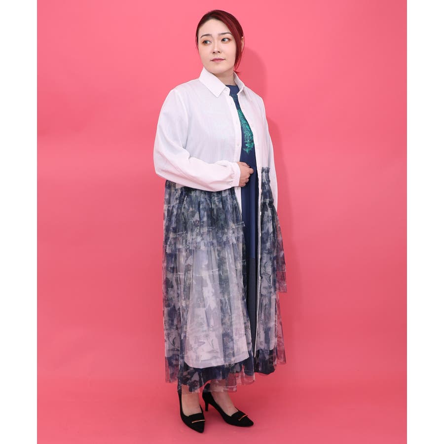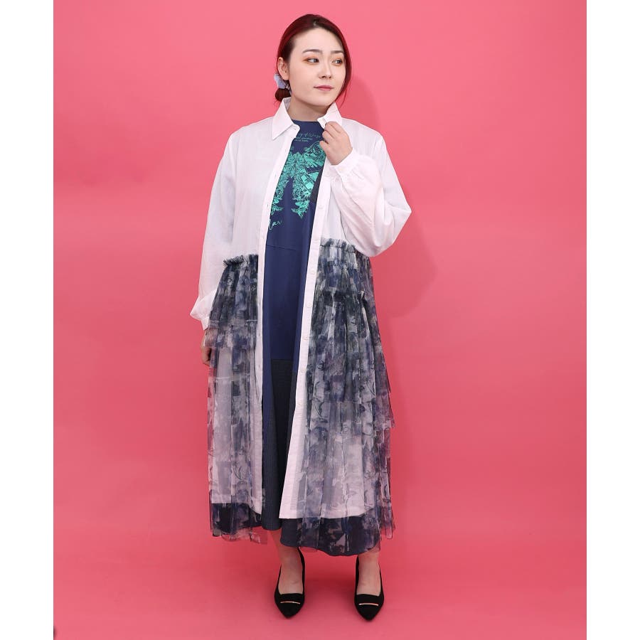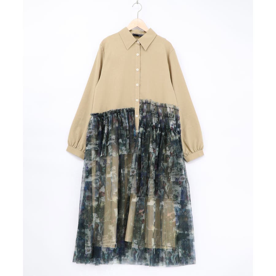 ・シャツワンピに、アシンメトリーに柄チュールを重ねた個性派デザイン