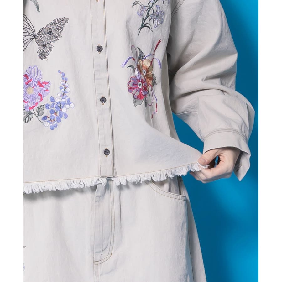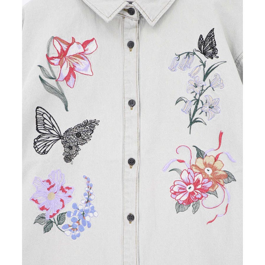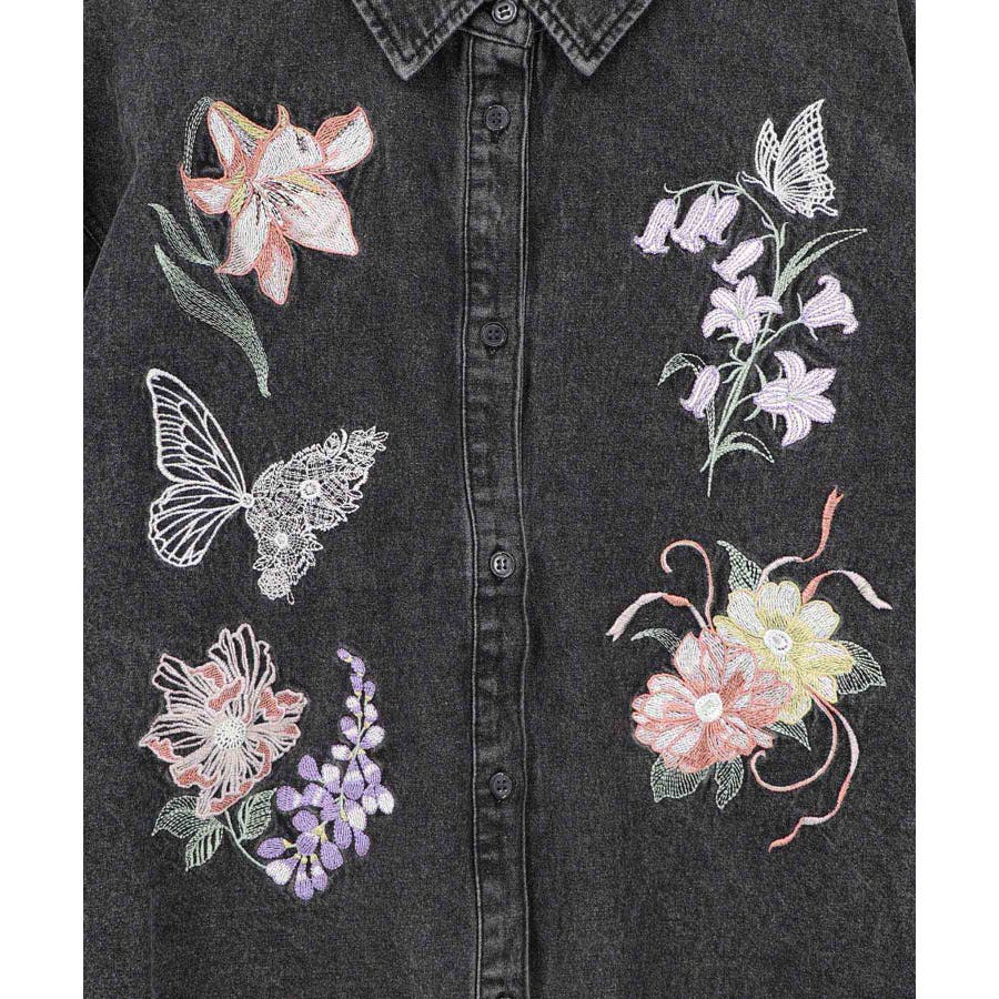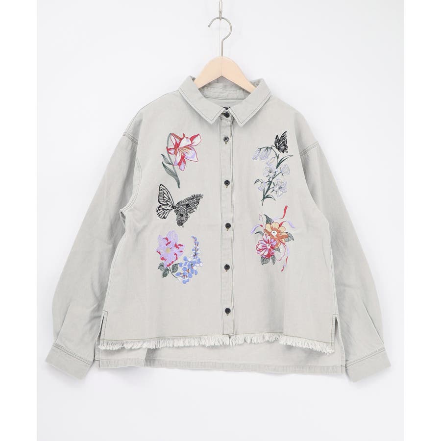 花蝶刺繍すそフリンジ入りデニムシャツ
