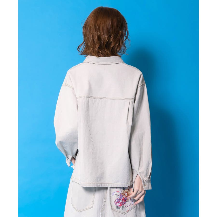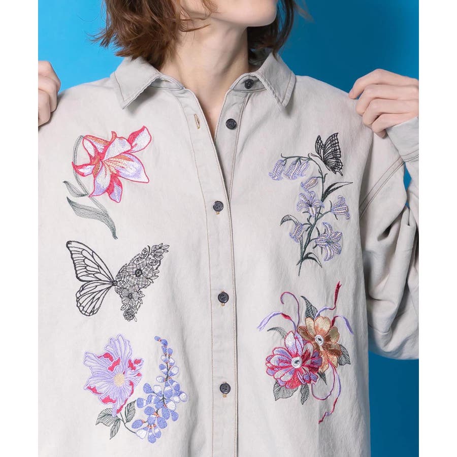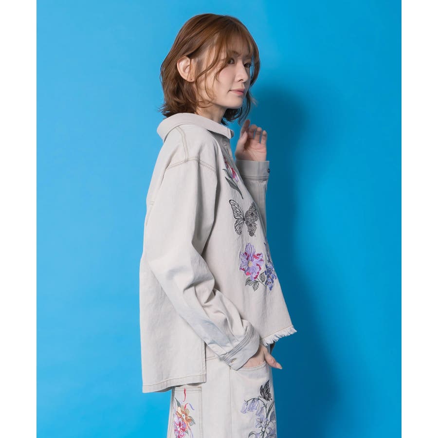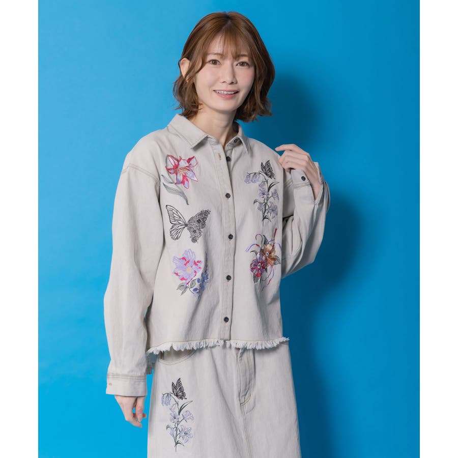 花蝶刺繍すそフリンジ入りデニムシャツ