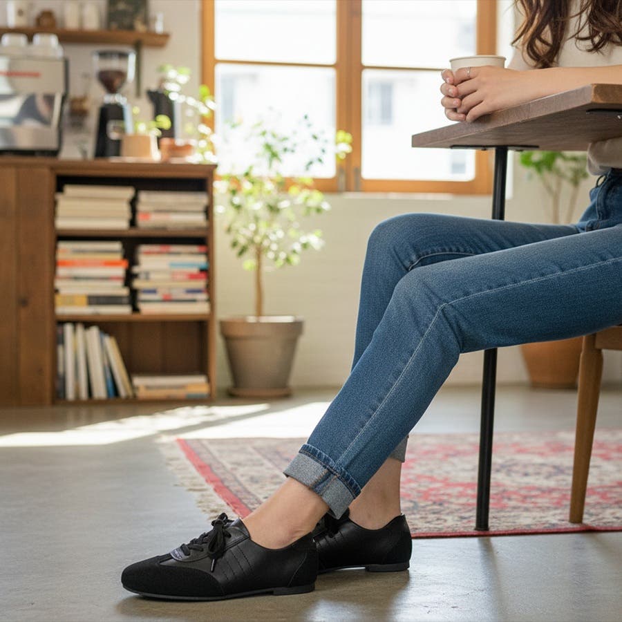 大人カジュアルの決定版。スニーカー感覚で履ける、上品レザータッチ・フラットシューズ