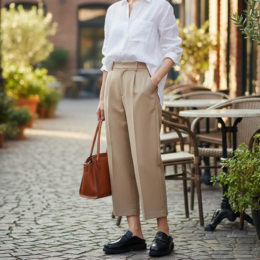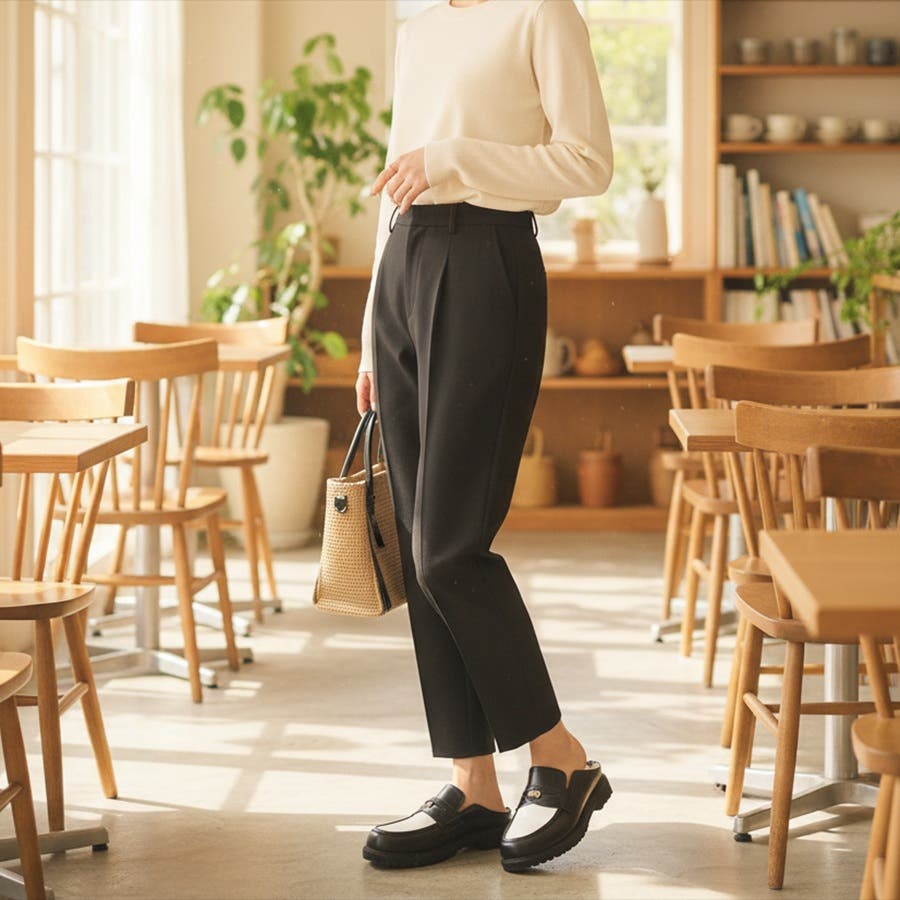 きれいめカジュアル: アンクル丈のテーパードパンツに合わせて、足首を見せた抜け感のあるスタイルに。