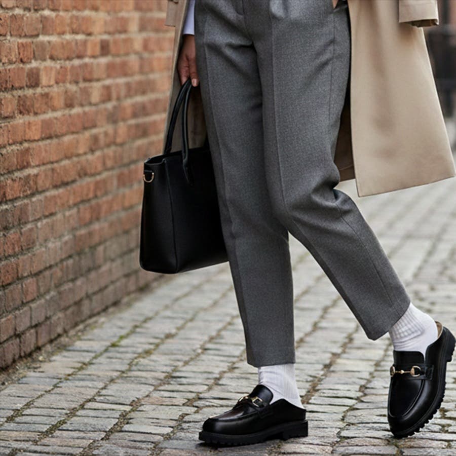きれいめオフィス: センタープレスのパンツに合わせて、サンダル禁止の職場でも「きちんと感」をキープ。