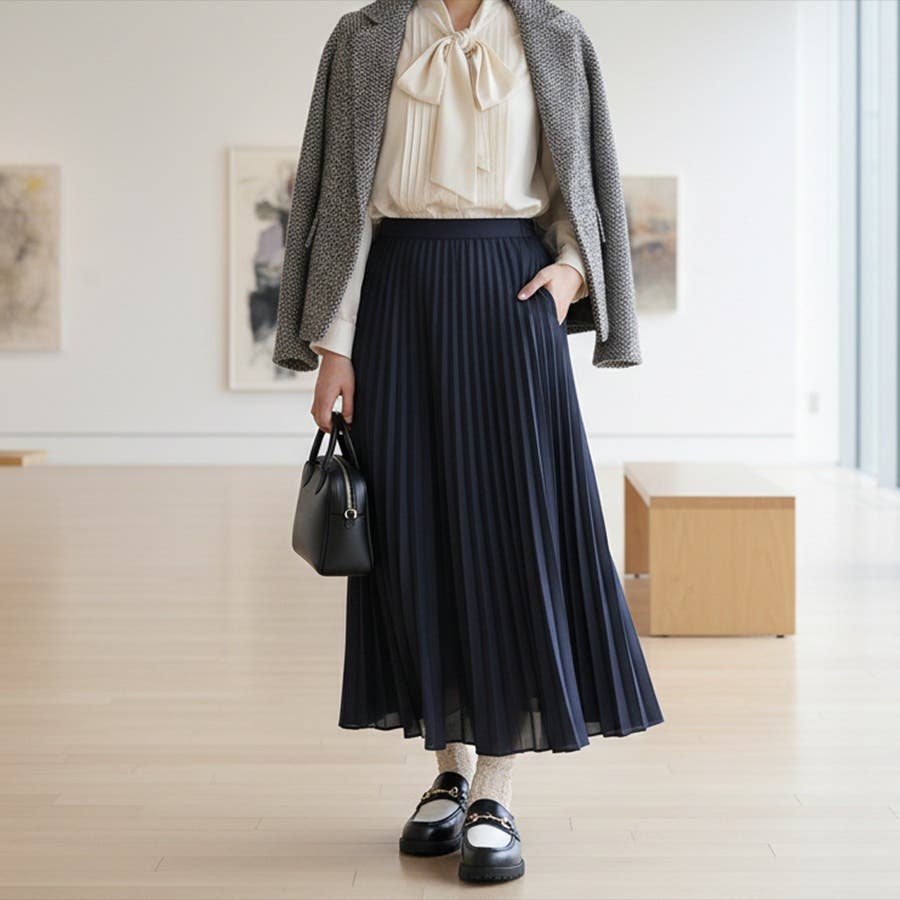 休日カジュアル: ロングスカートの裾からビットを覗かせて、足元を引き締めるアクセントに。