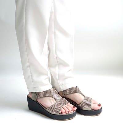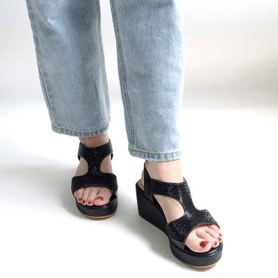 フロント部分にビジューをあしらったウェッジソールサンダル