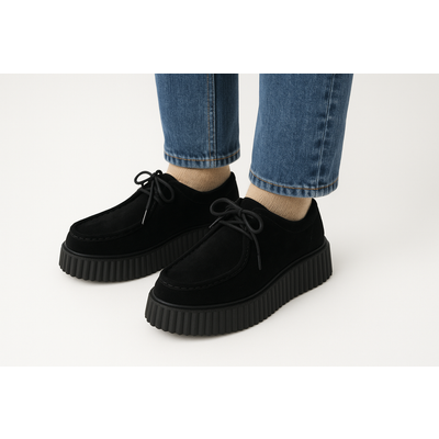 ■ ブラック (黒)アッパー、ソールともにブラックで統一された、クールでマニッシュな印象。ワイドパンツやロングスカートと合わせて、重厚感のある足元に。