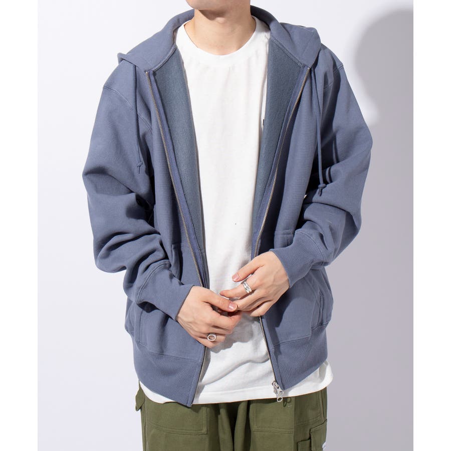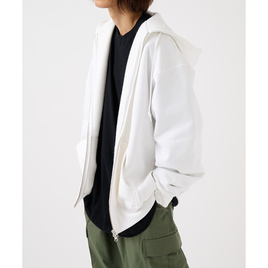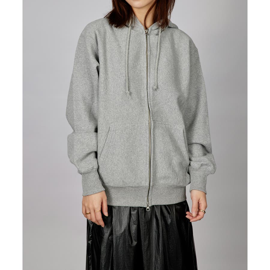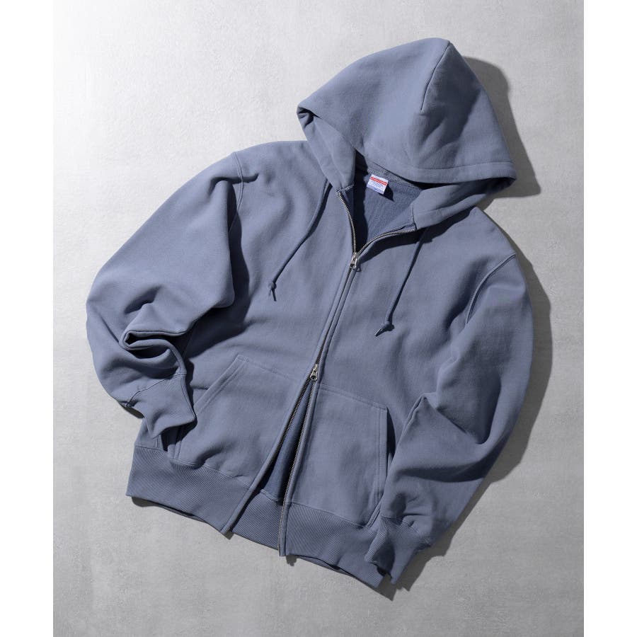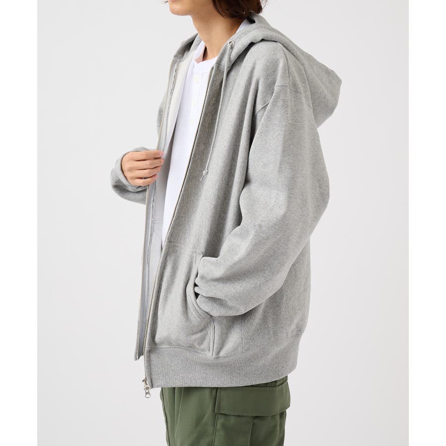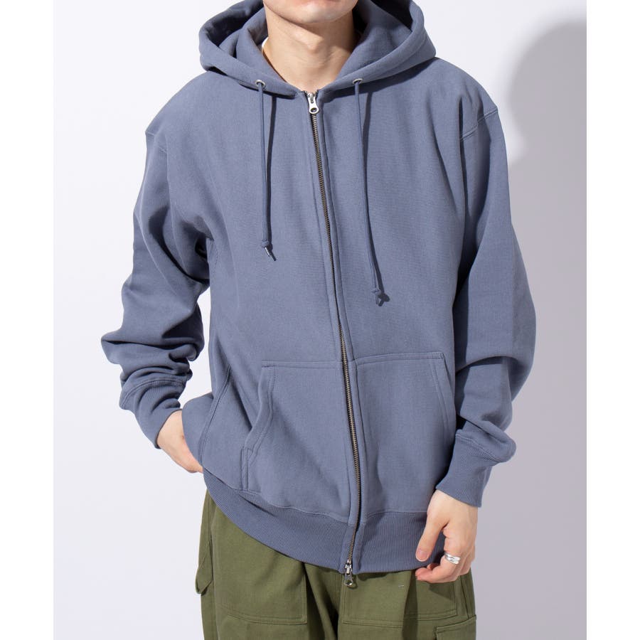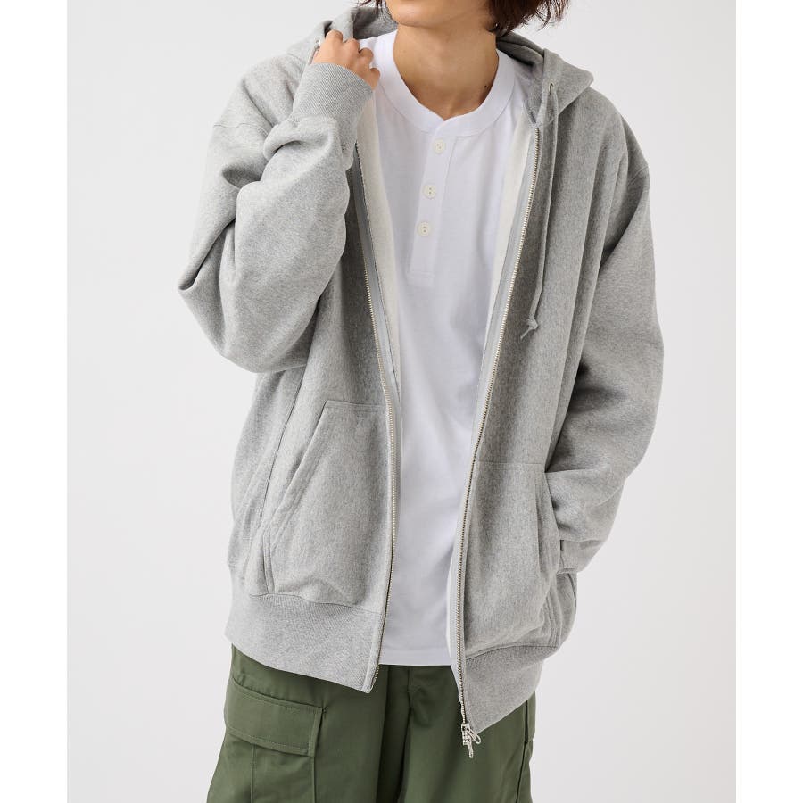オープンエンド糸特有のドライな質感が特徴の12.0オンス裏起毛フルジップパーカー。