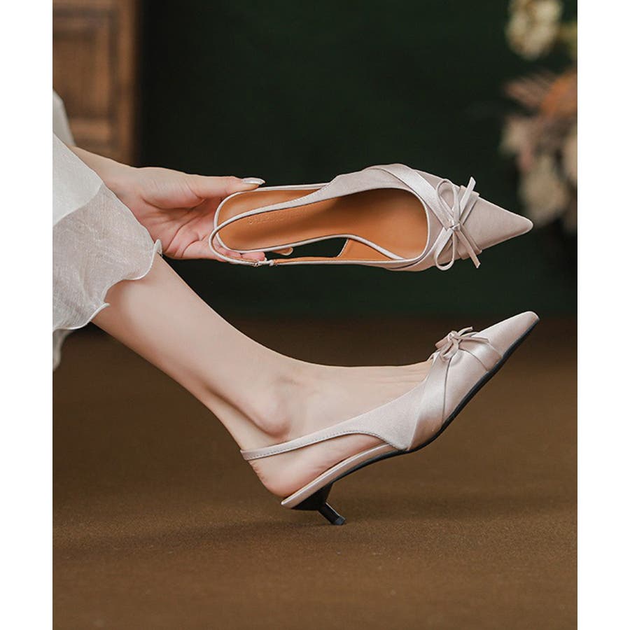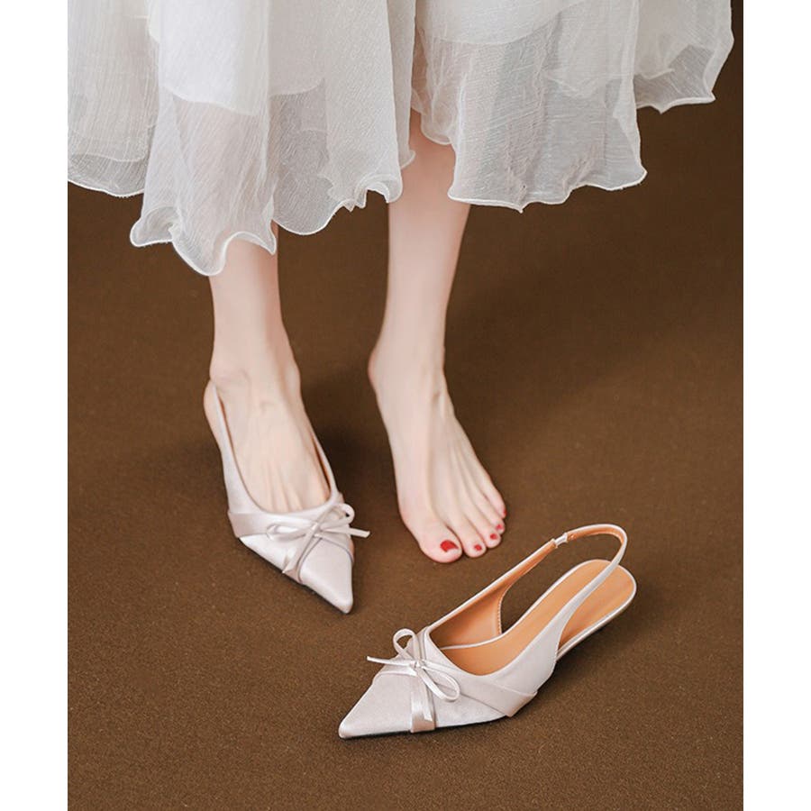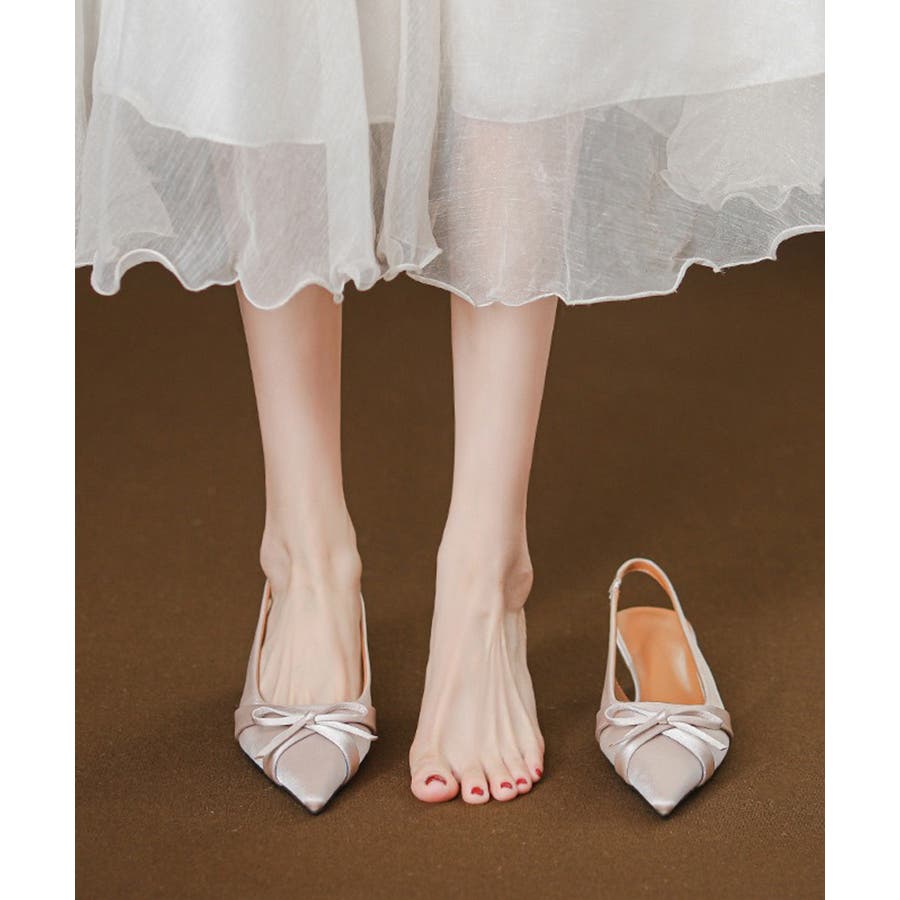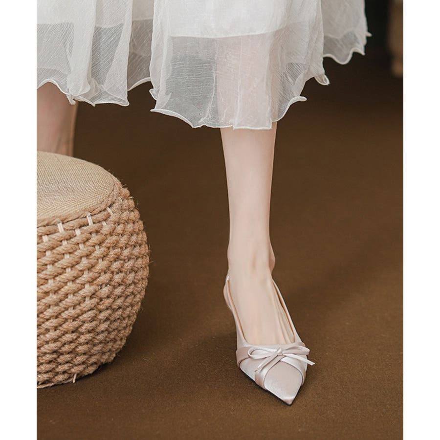 艶のあるポリエステルサテン素材を使用し、足元に上品な華やかさをプラスするポインテッドトゥデザインに仕上げました。