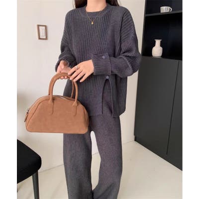 サイドボタンとスリットがさりげないアクセントのリブニットセットアップ