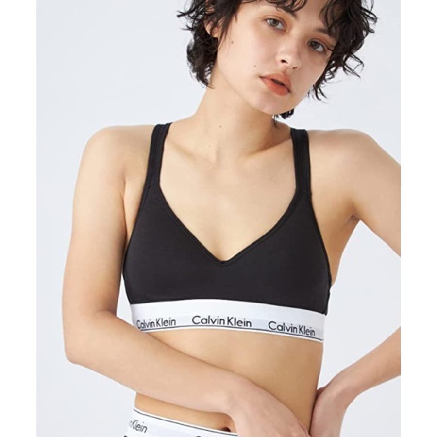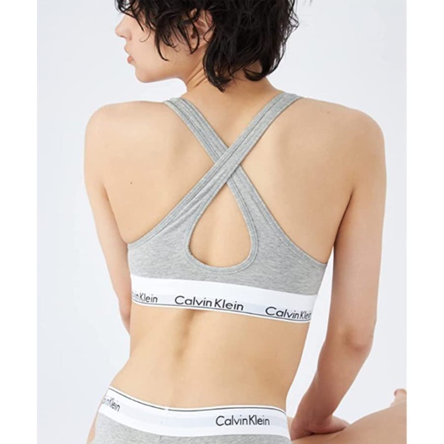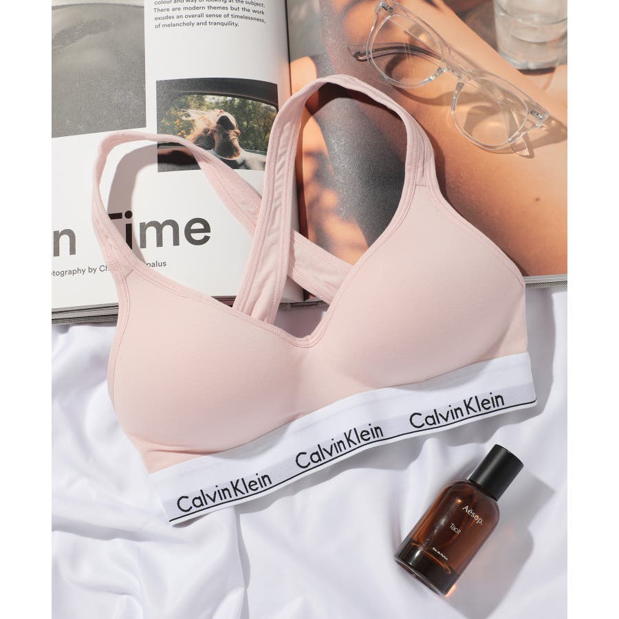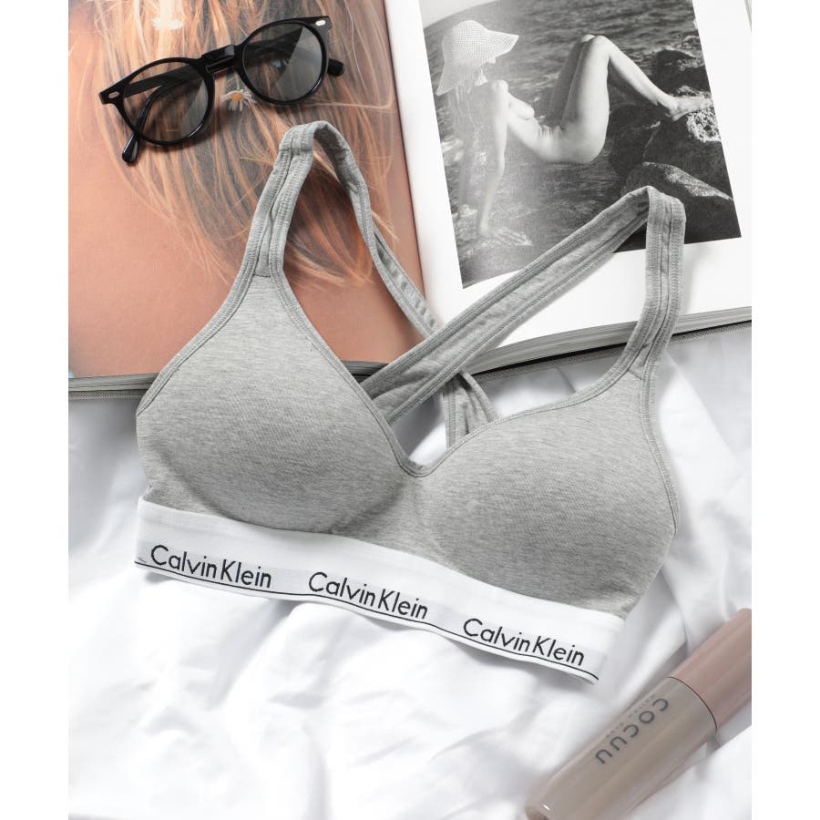 リフトアップ効果のある薄地の裏地付きカップ、クロスバックストラップとバックのカットアウトが特徴のCalvin Klein ブラレット。