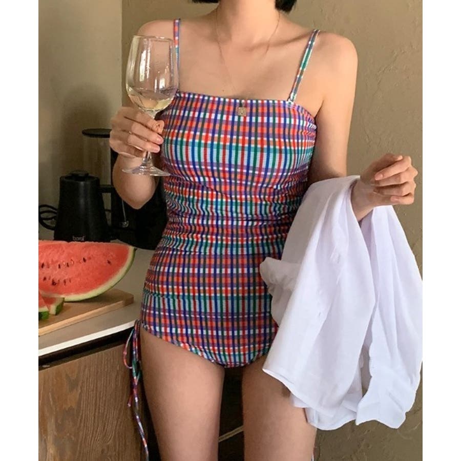爽やかなカラフルモザイクチェック柄のワンピース水着。