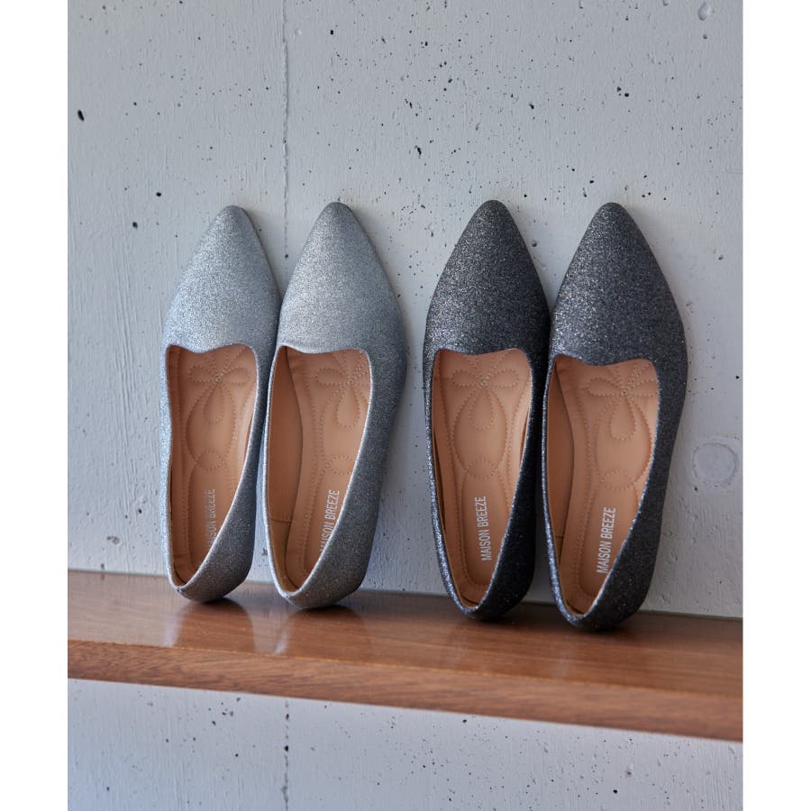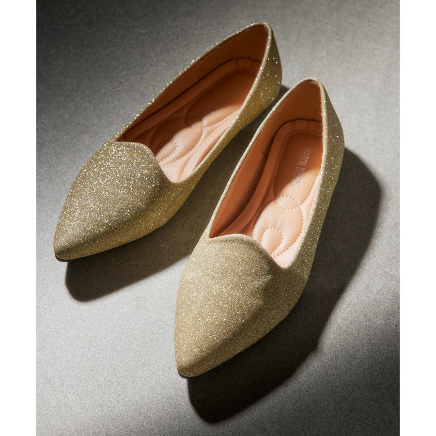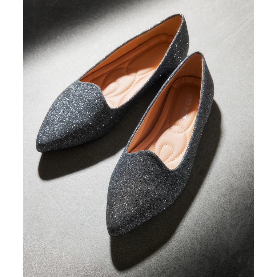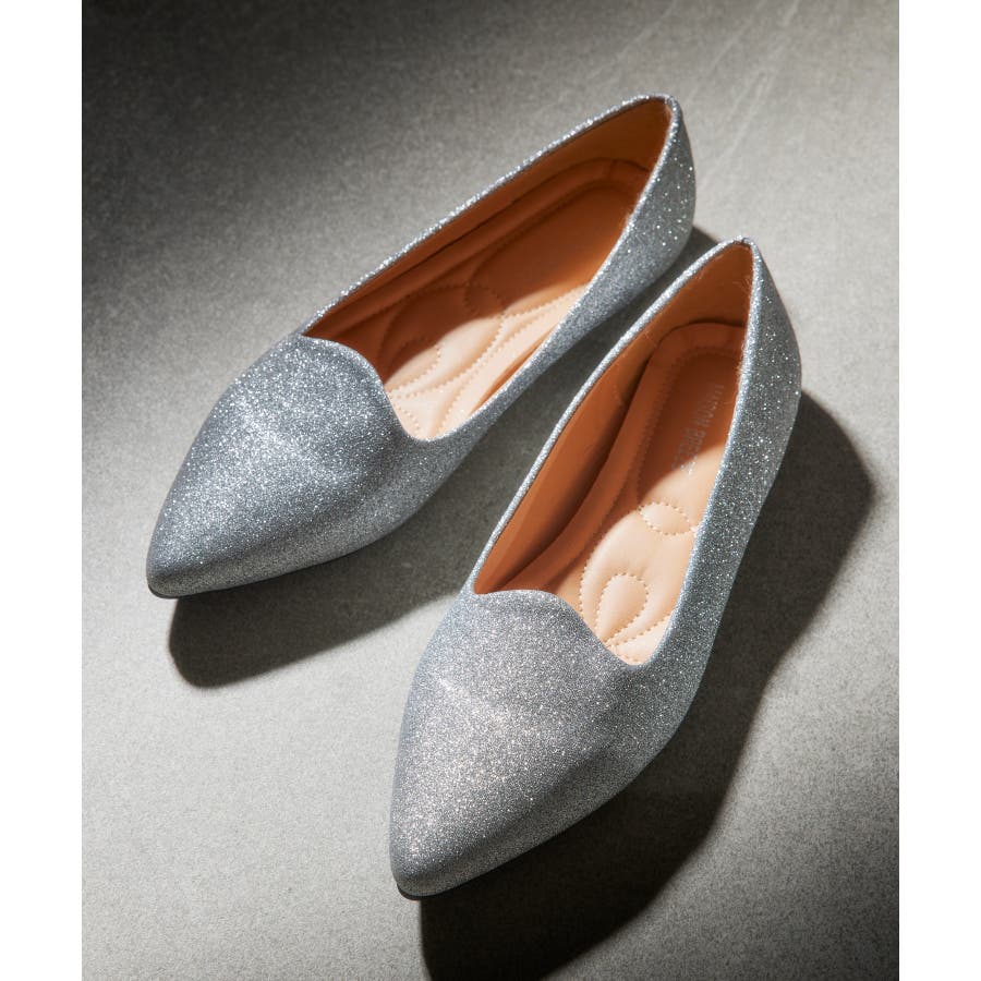 カジュアルダウンした着用もおすすめのトレンド感あふれるグリッターラメのフラットパンプスが入荷◎
