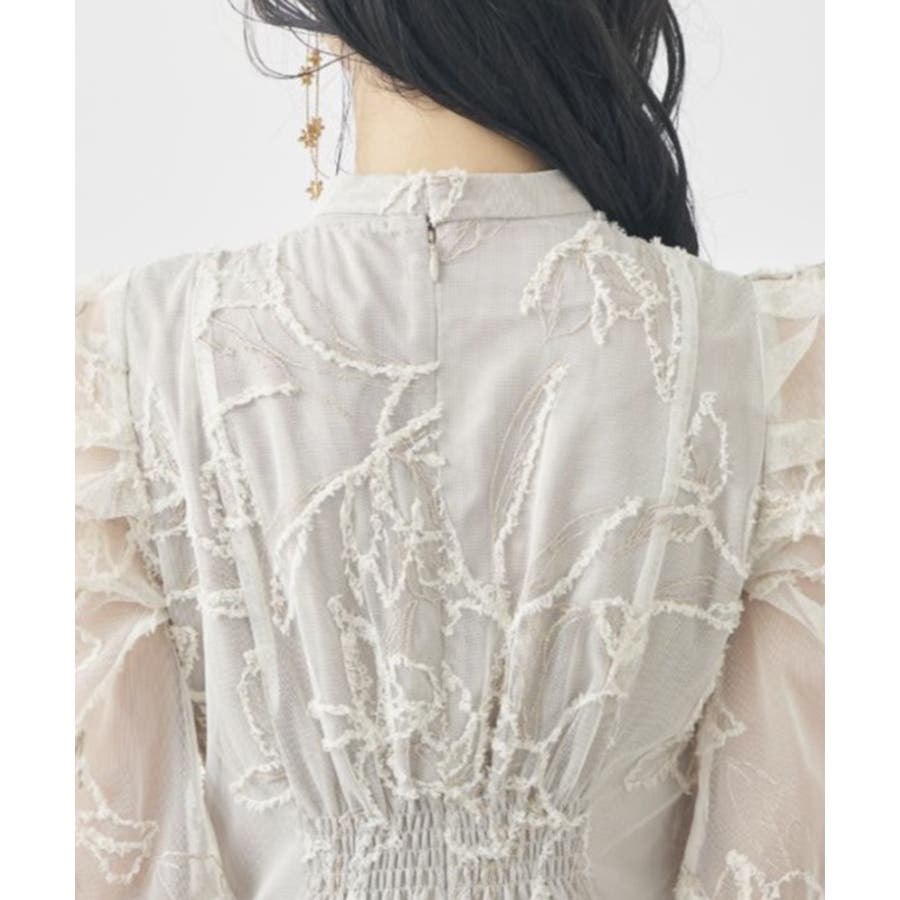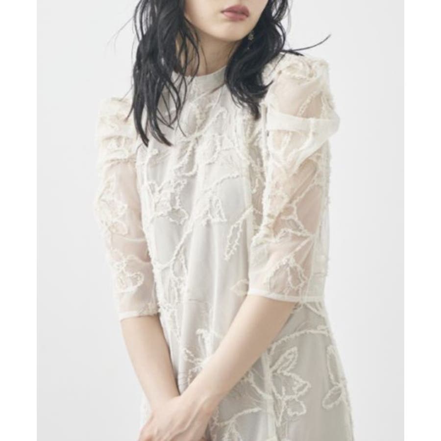 首元のカッティング風デザイン部分はチュールを被せた程よい肌見せで、着用しやすくトレンドライクな仕上がりに。