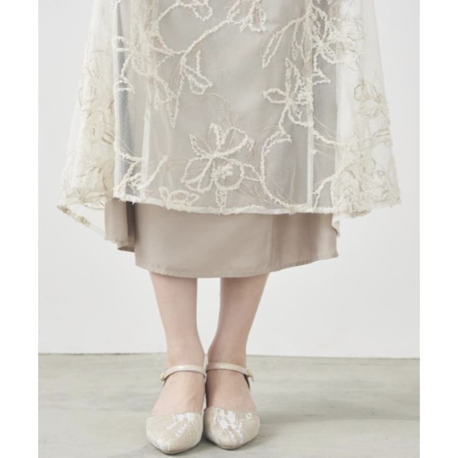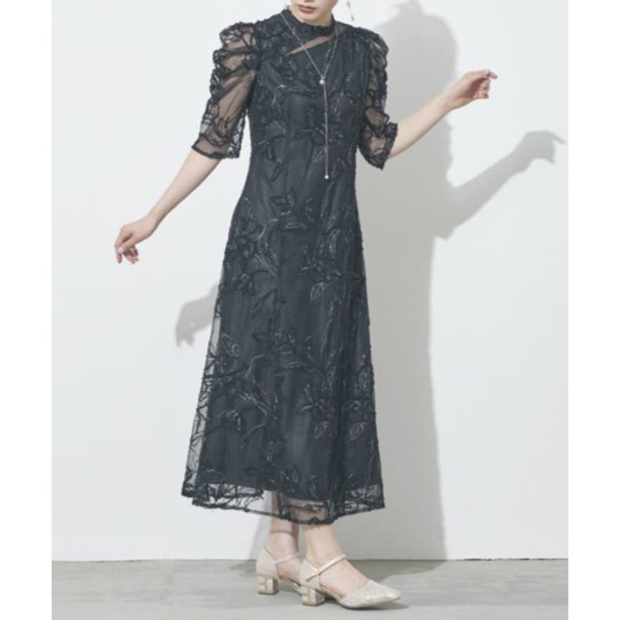 フリンジアクセントラインの素材感とラメ入り刺繍が華やかなチュールレース生地を全身に使用したワンピースドレス。
