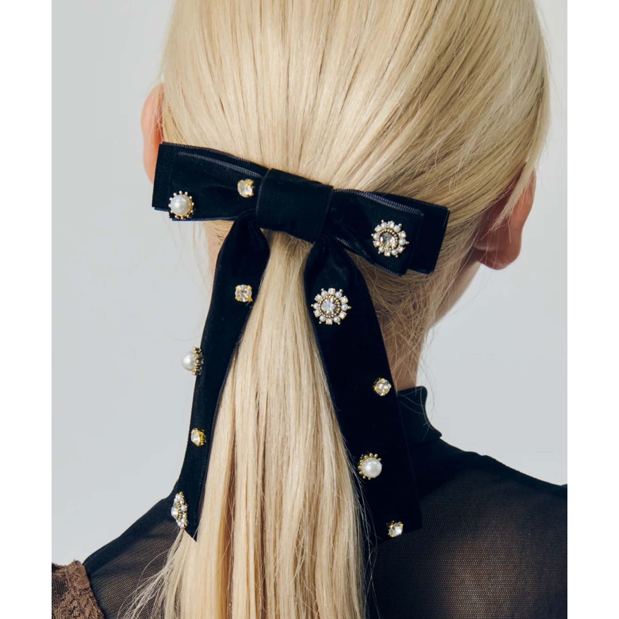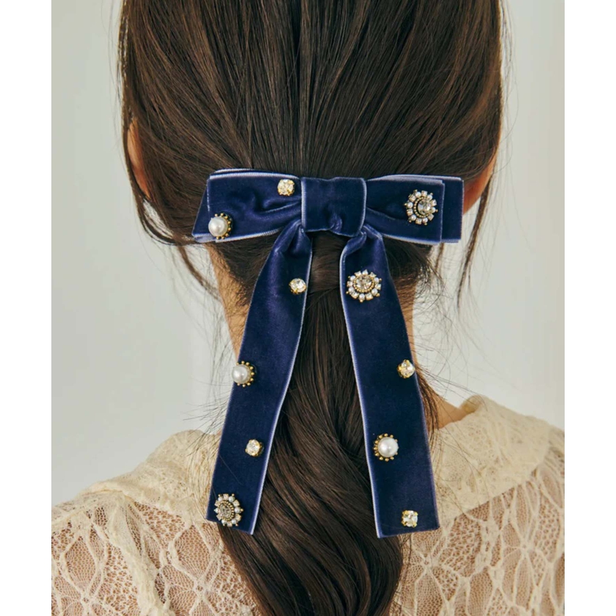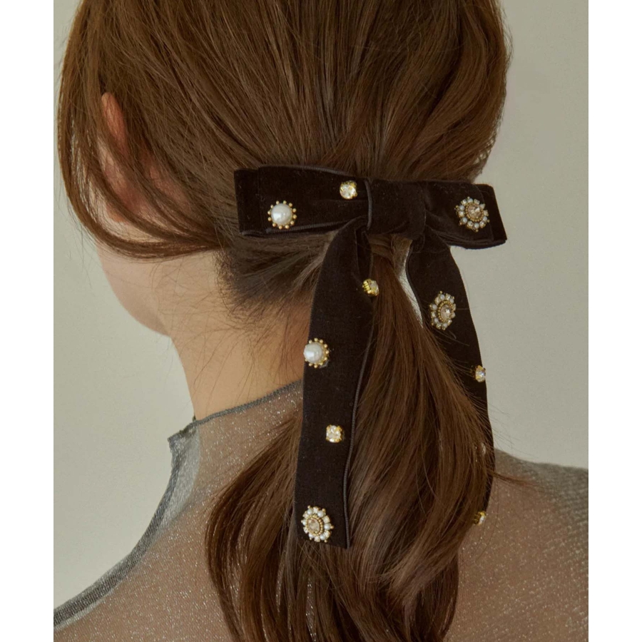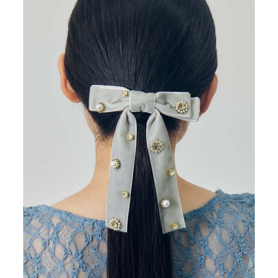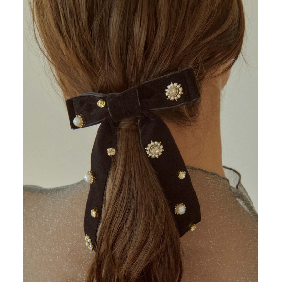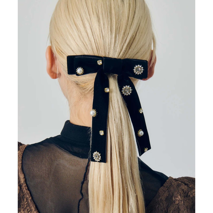 華やかなうしろ姿を演出する、GOLDYのバレッタです。ベロアのリボンに様々なビジューが散りばめられた存在感のあるデザイン。