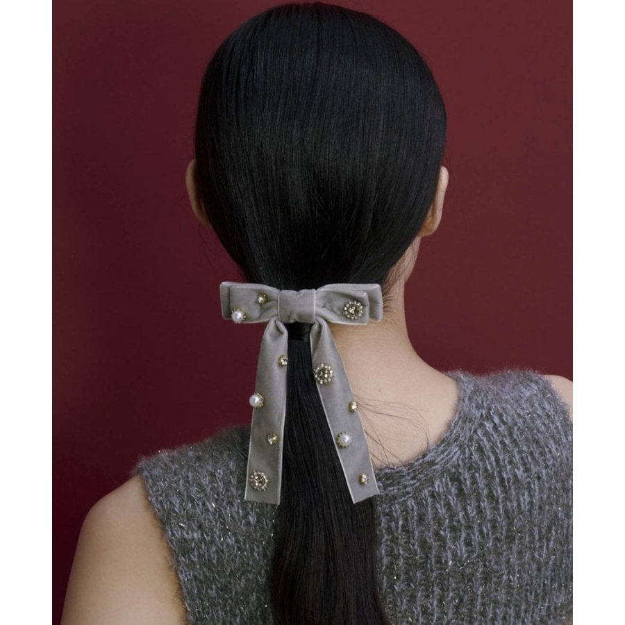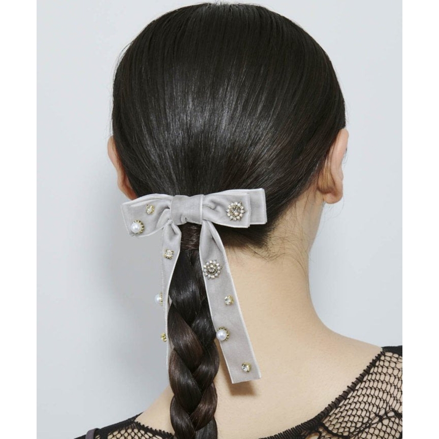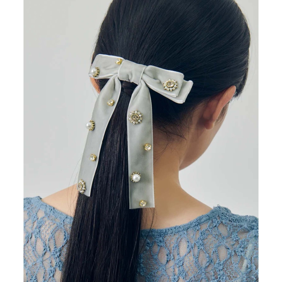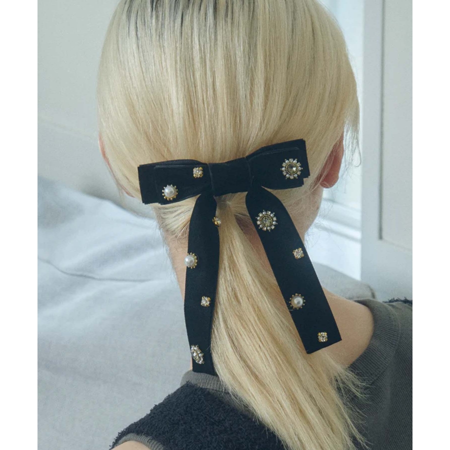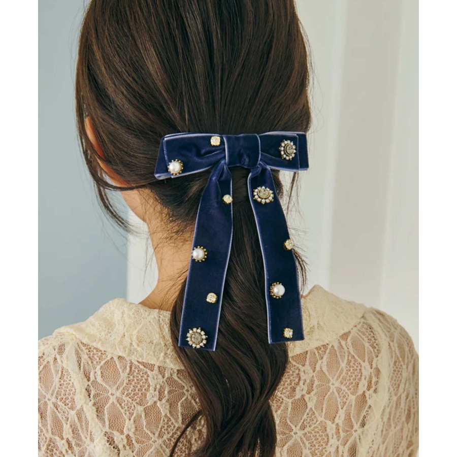 華やかなうしろ姿を演出する、GOLDYのバレッタです。ベロアのリボンに様々なビジューが散りばめられた存在感のあるデザイン。