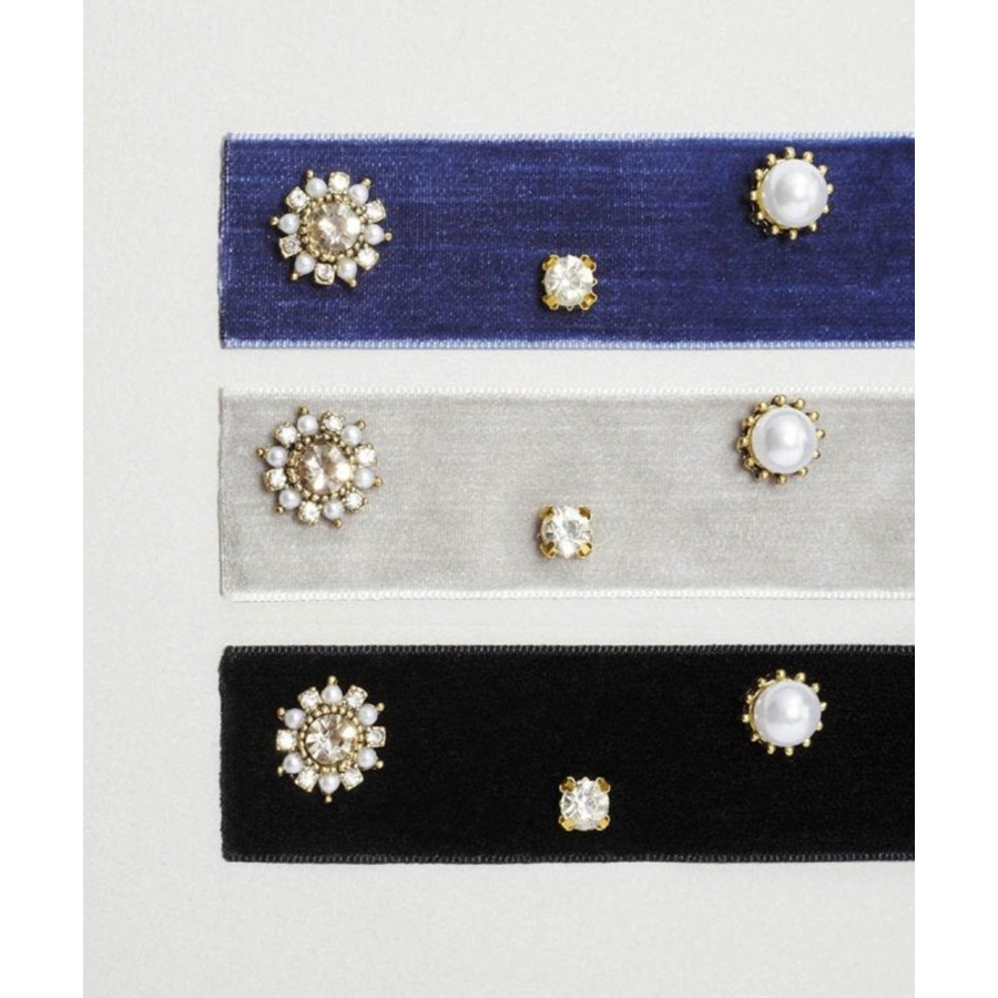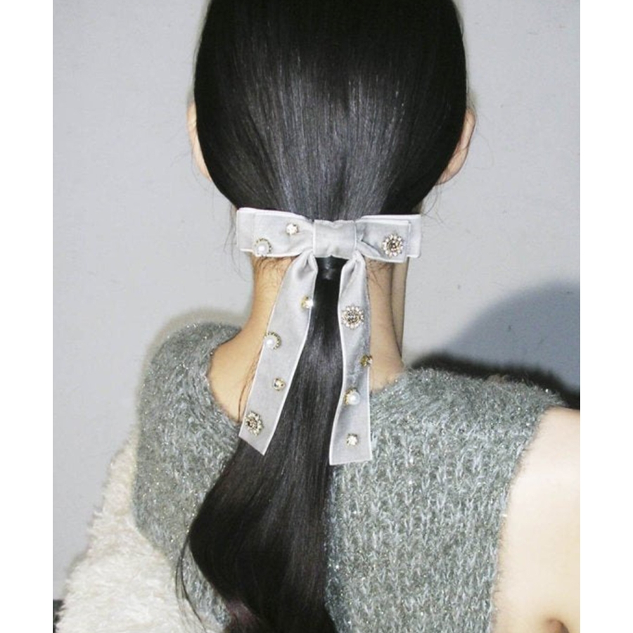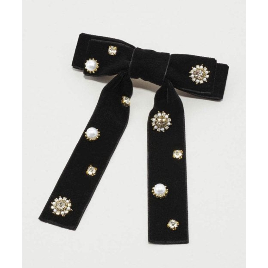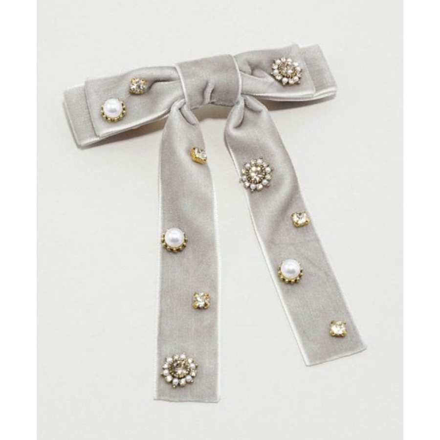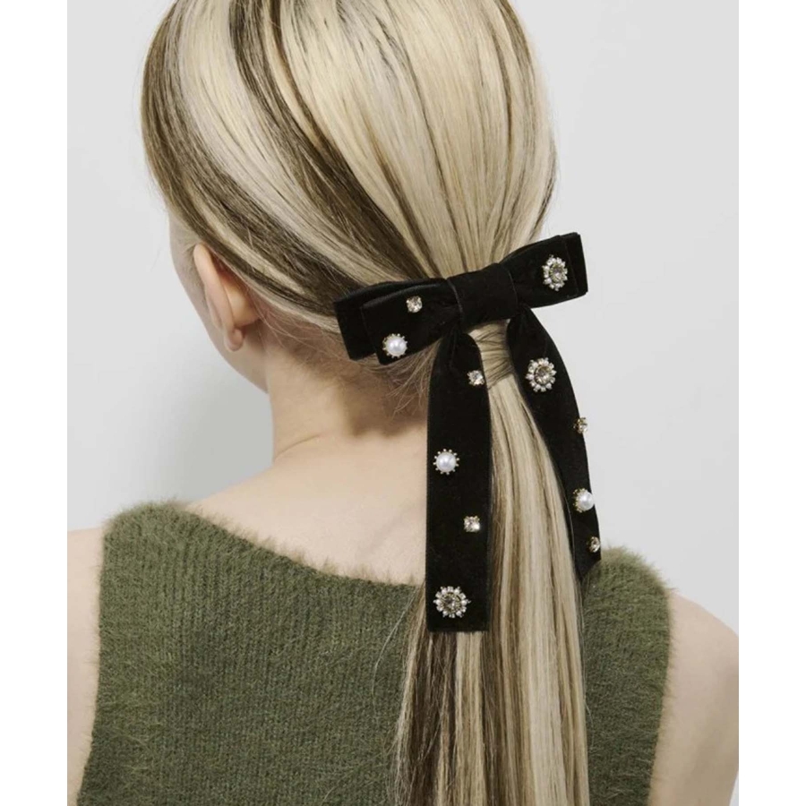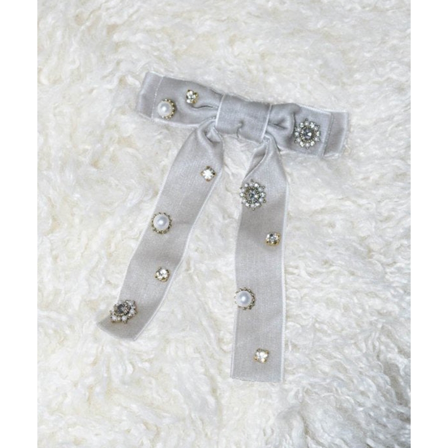 華やかなうしろ姿を演出する、GOLDYのバレッタです。ベロアのリボンに様々なビジューが散りばめられた存在感のあるデザイン。