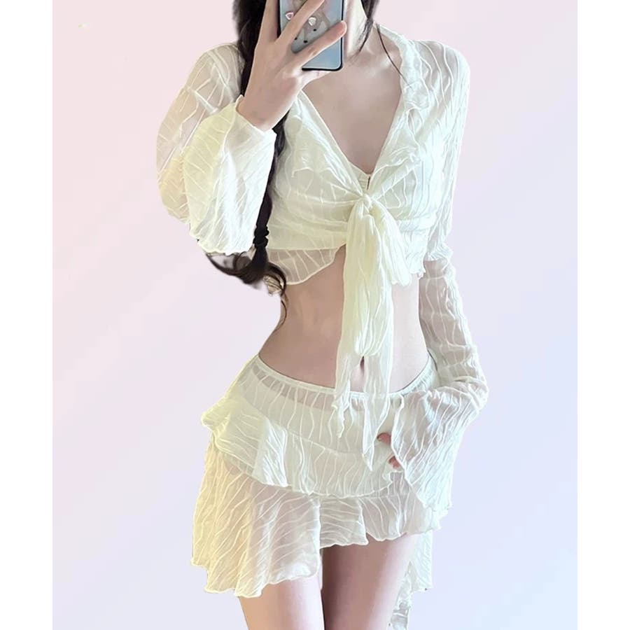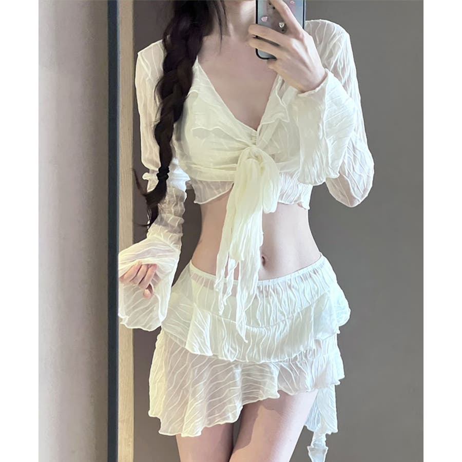 女性らしいシルエットにこだわった水着に、ふわりと透けるシアーカーディガンをレイヤード。