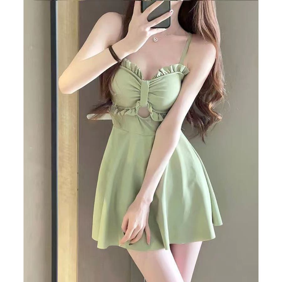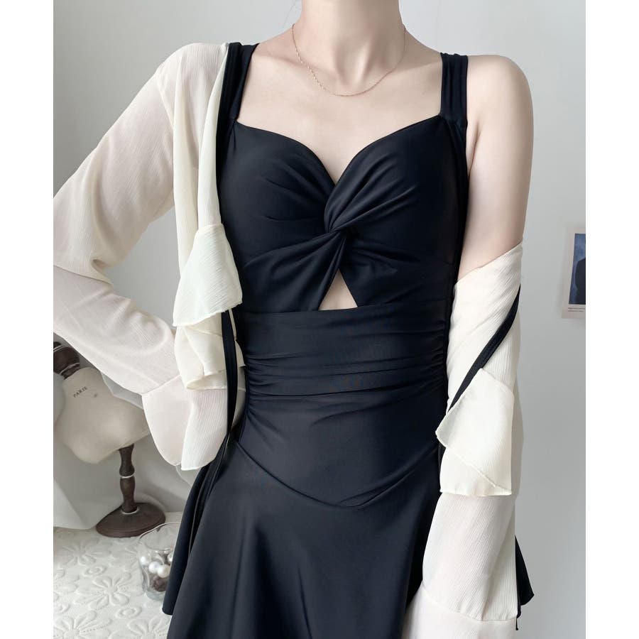 肌馴染みの良いカラーや、女性らしいシルエットにこだわったワンピース水着に、ふわりと透けるシアーカーディガンをレイヤード。