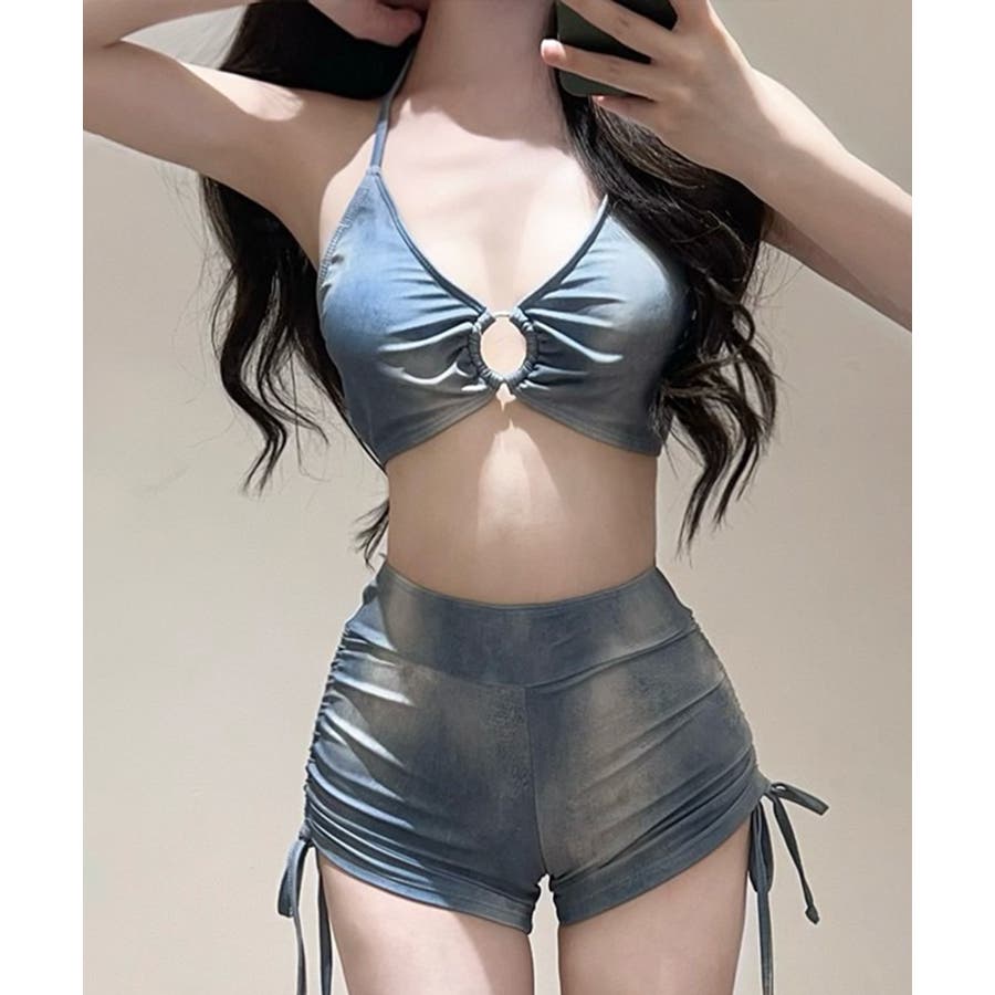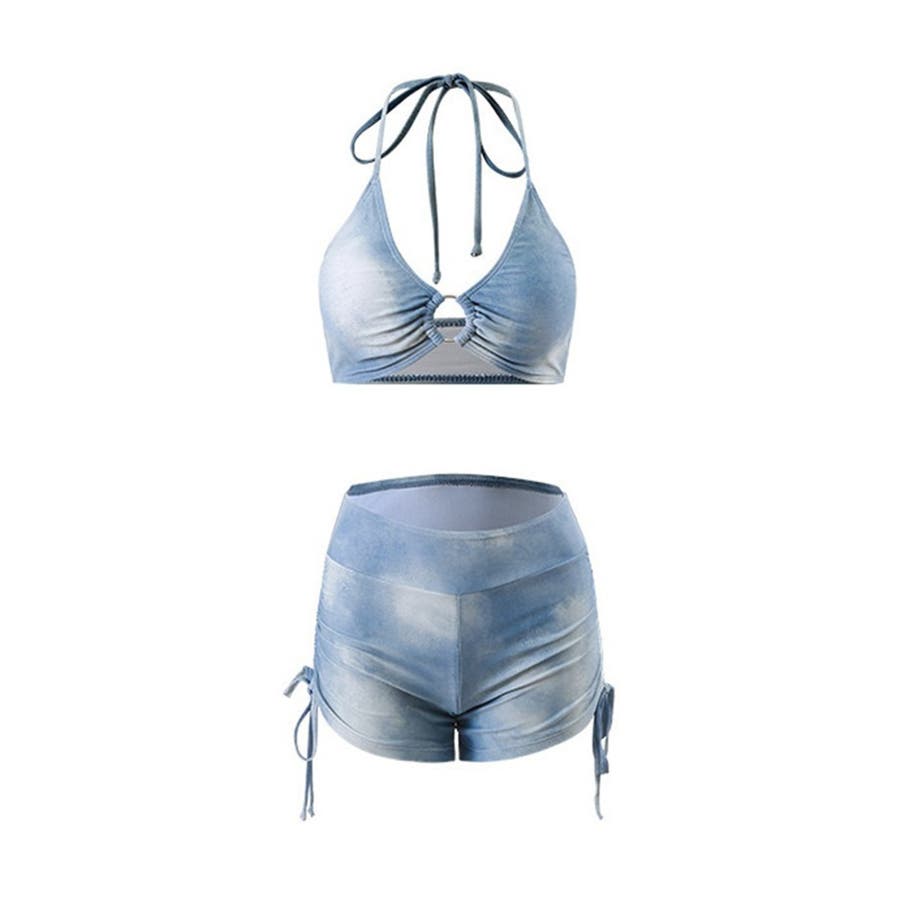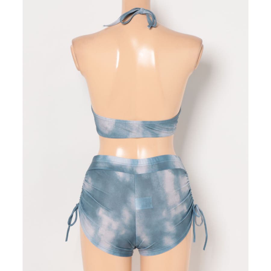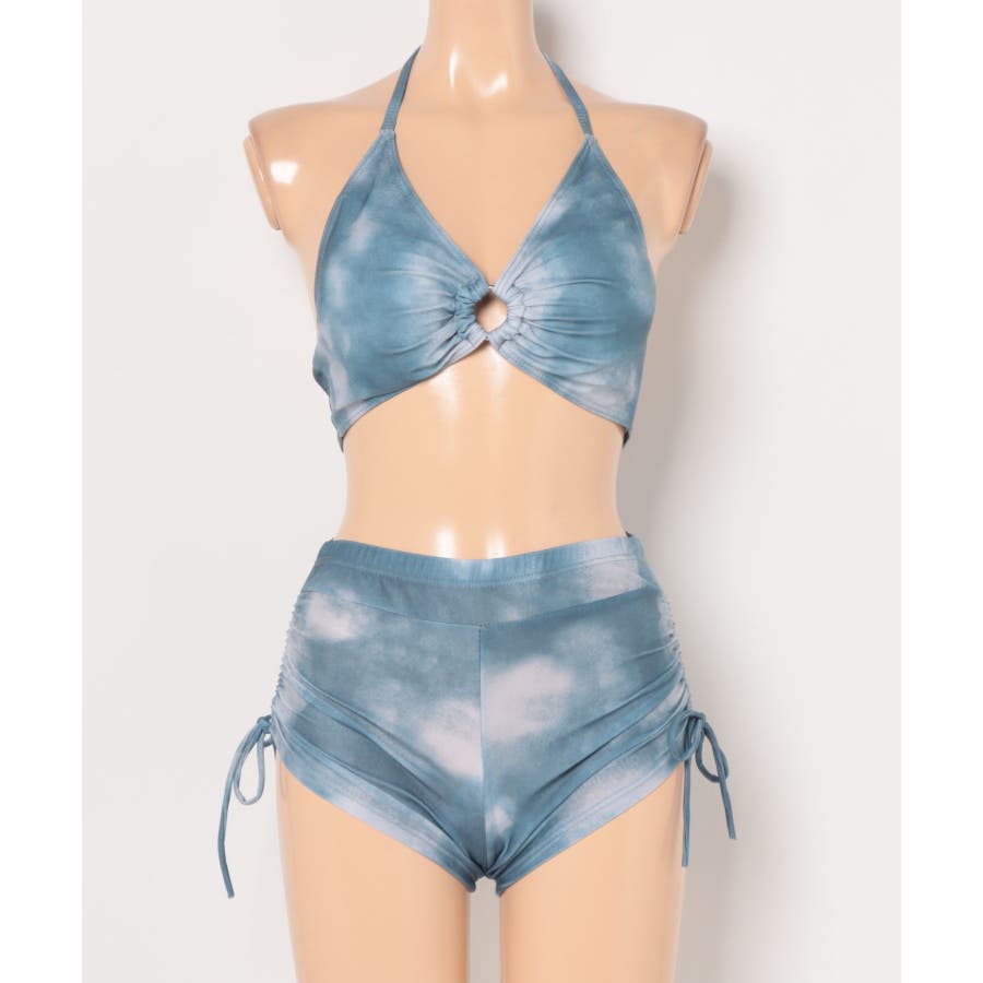 鮮やかなブルーのタイダイ柄が目を惹く、ビキニ・ショーツ・カバーアップトップスの3点セット水着。