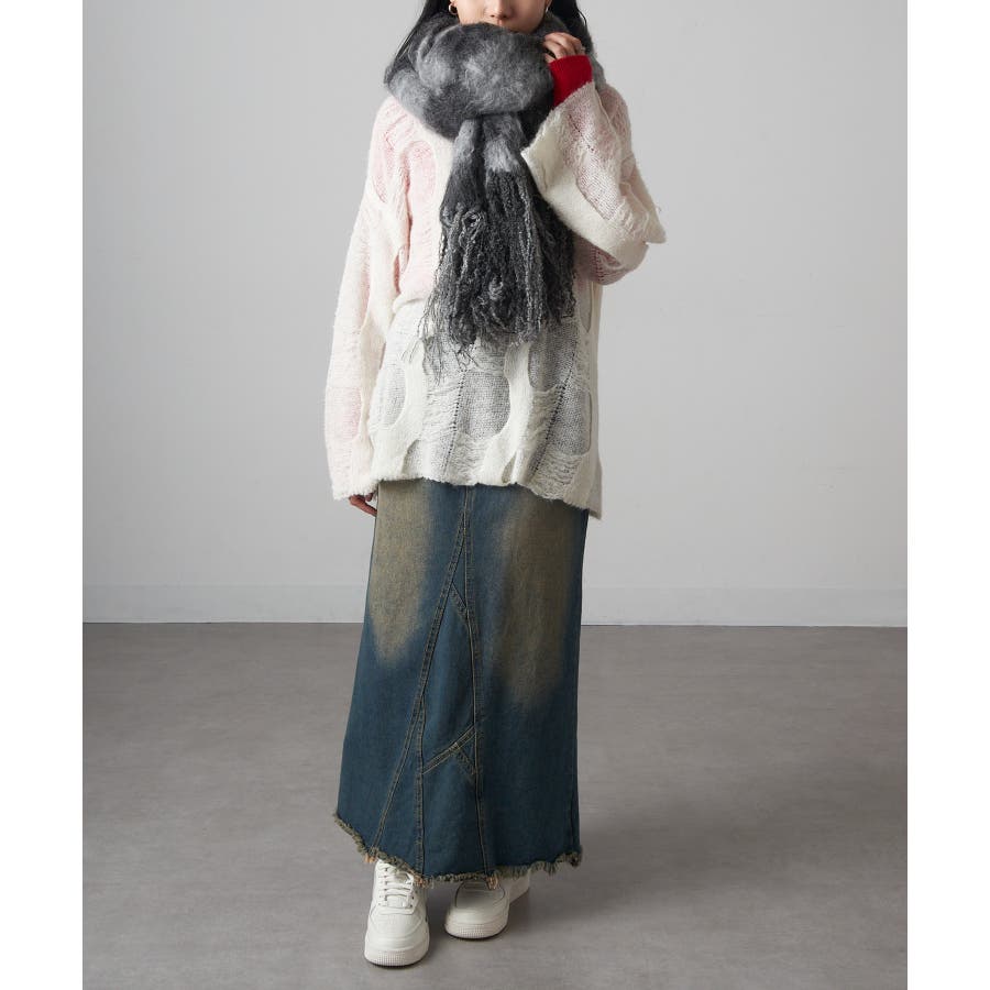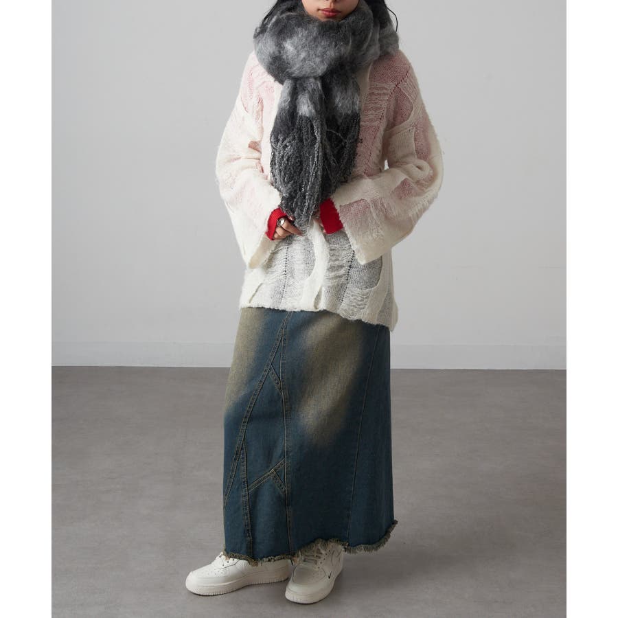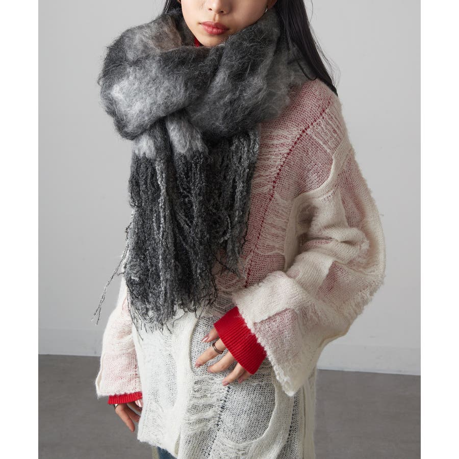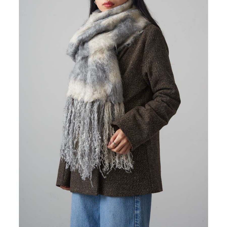 ワンピースやきれいめなスカートのフェミニンな装いに。マフラーをショールのように羽織り、素材感と配色を活かした上品なアクセントと使用。
