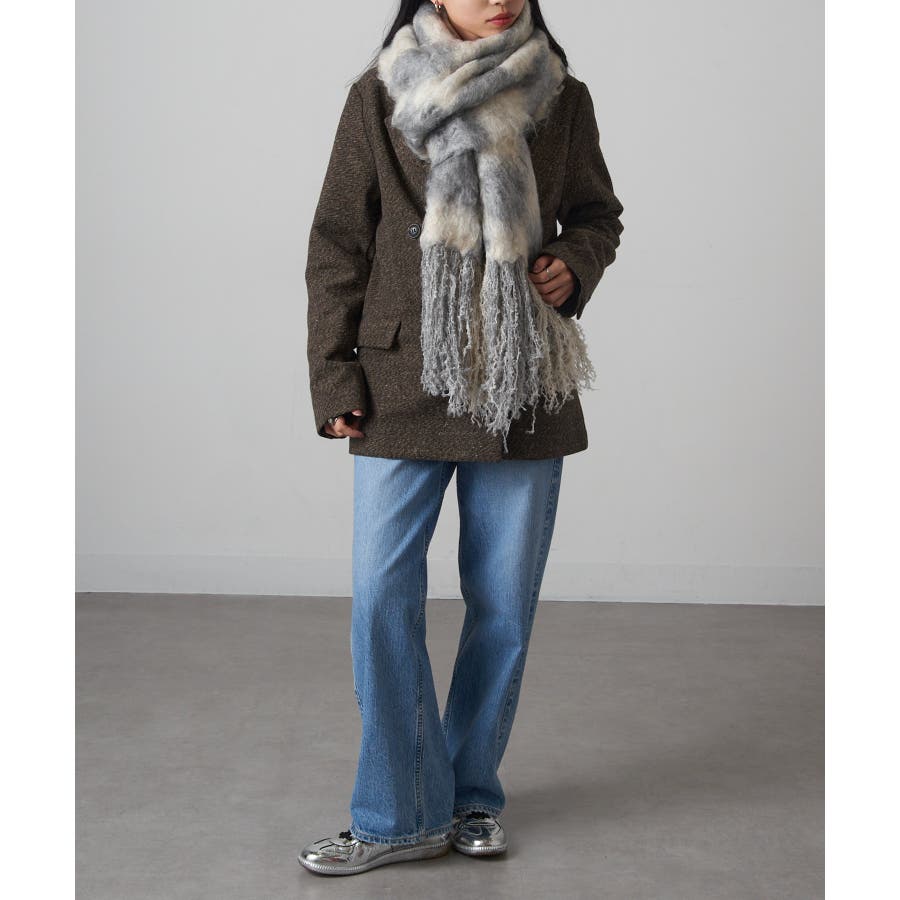 ライダースジャケットやクールなアウターに、柔らかな起毛マフラーを合わせることで、甘辛ミックスの旬な着こなしに。