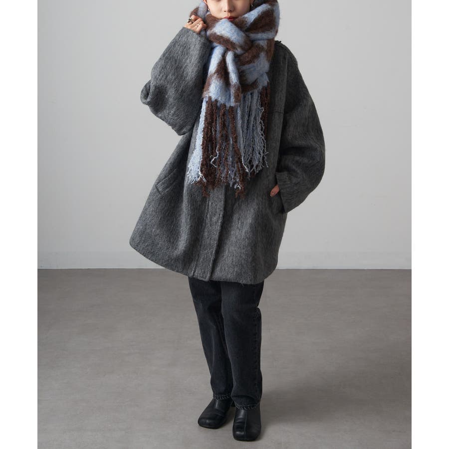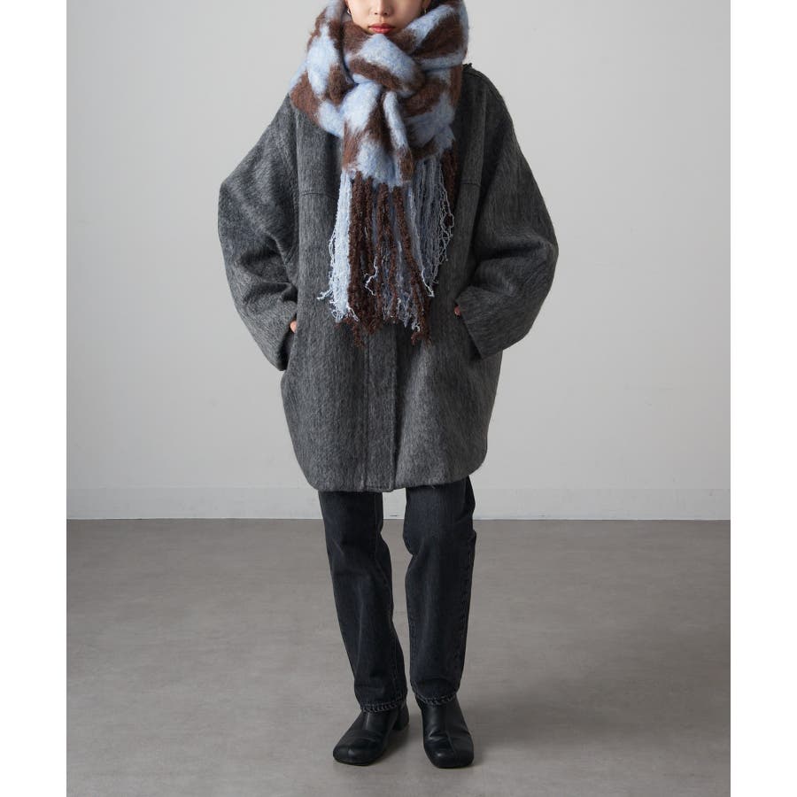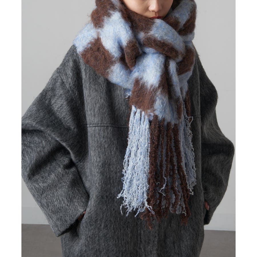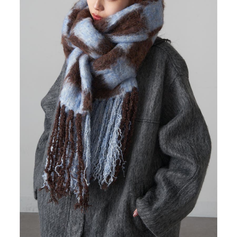 大胆な配色と大きなチェック柄が特徴的で、シンプルなアウターに華やかなアクセントをプラス。