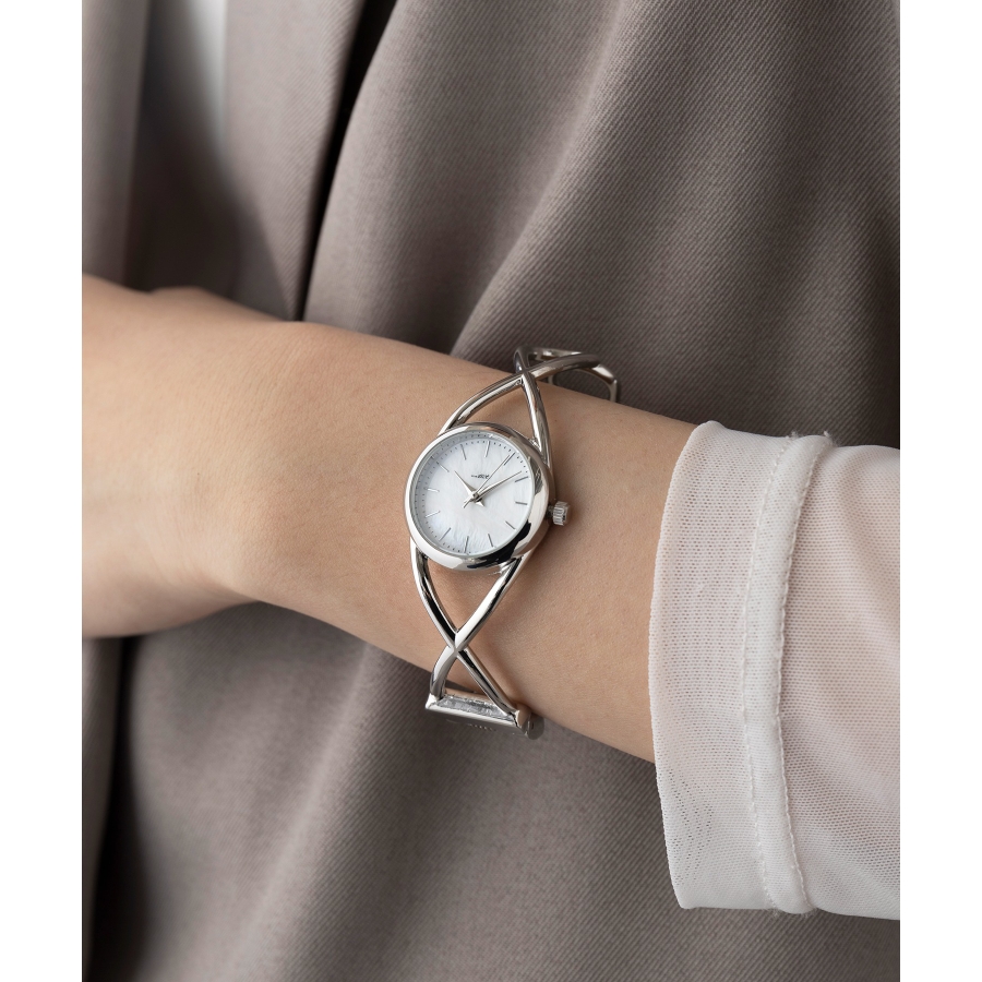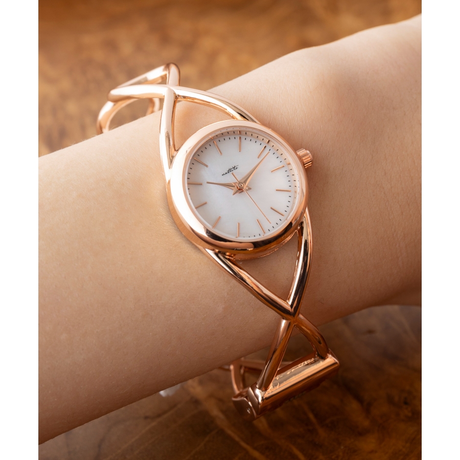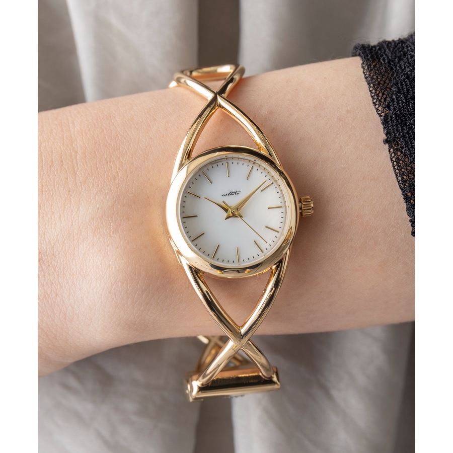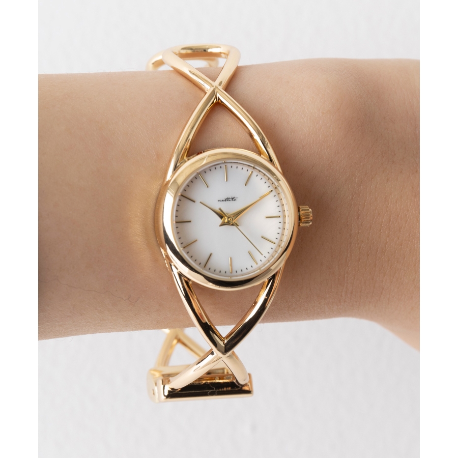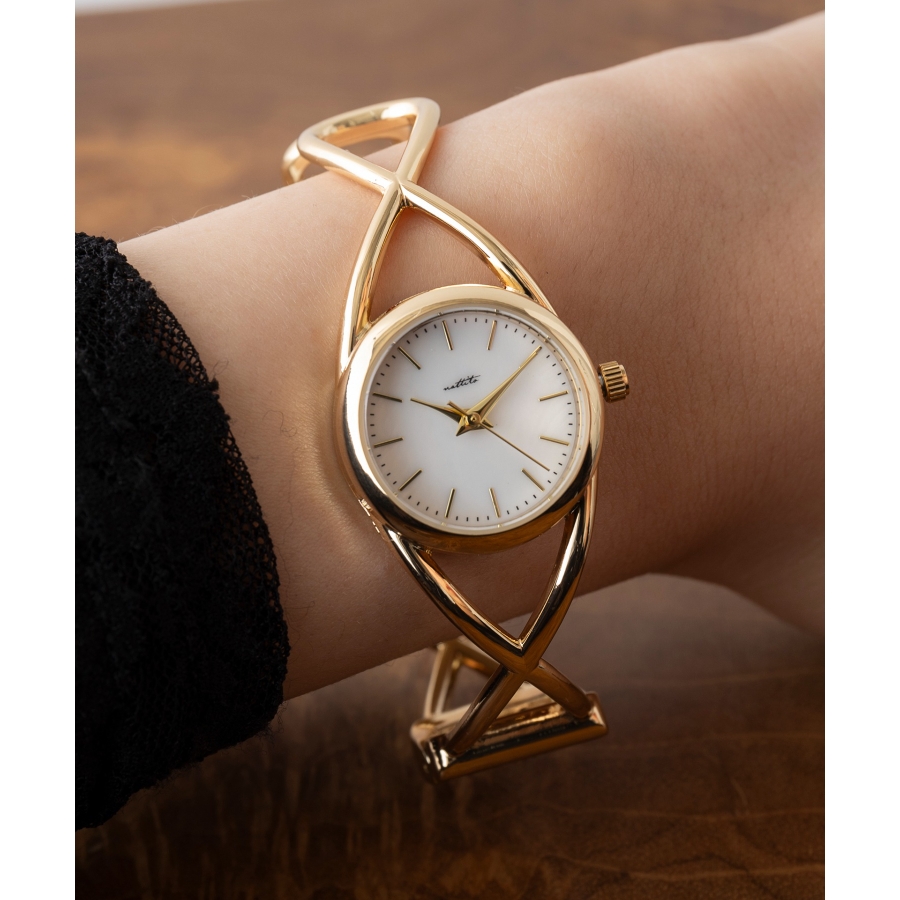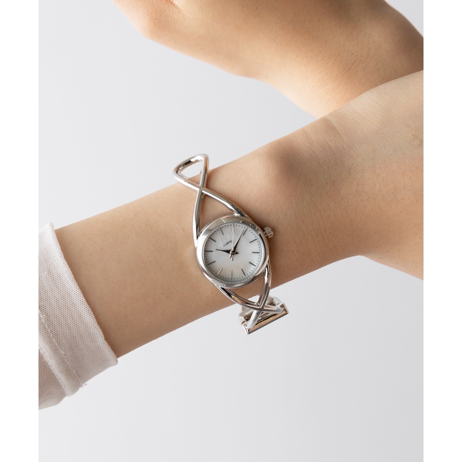 シンプルな文字盤と、特徴的なバングルデザインが魅力の腕時計。
