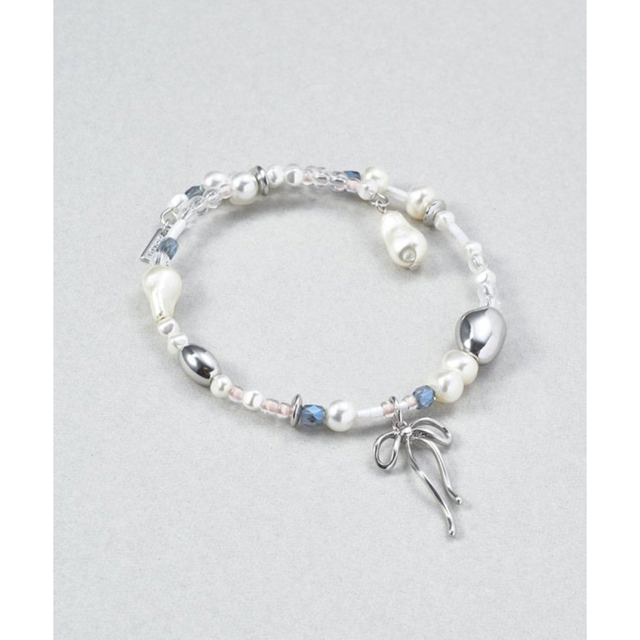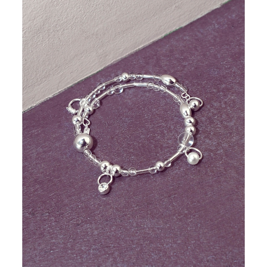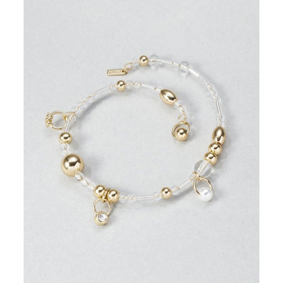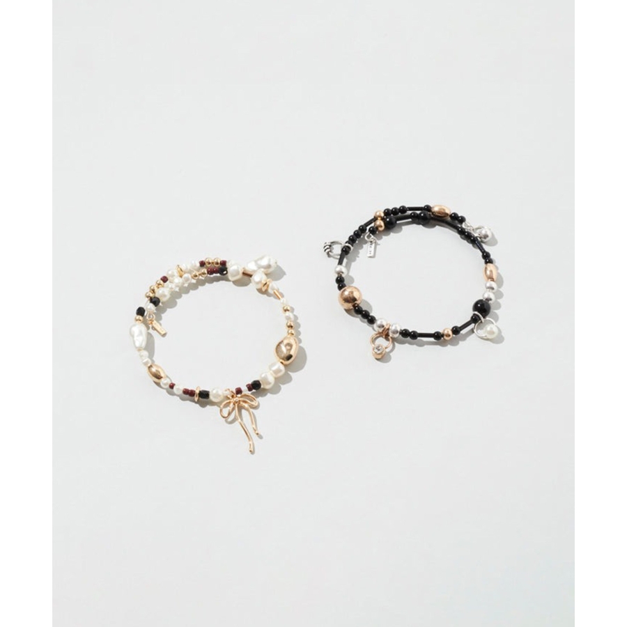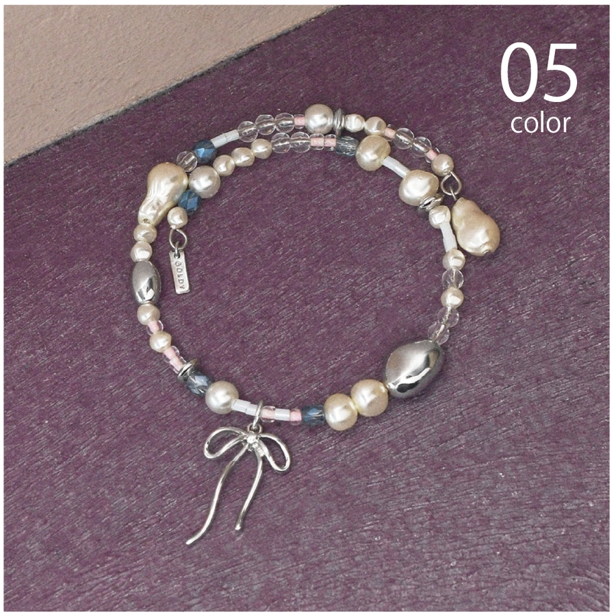 パールやビーズをあしらったバングルに、さまざまなモチーフのチャームを組み合わせたデザイン。