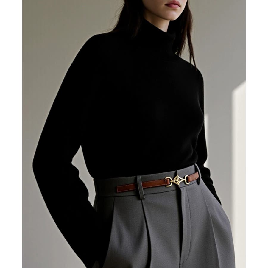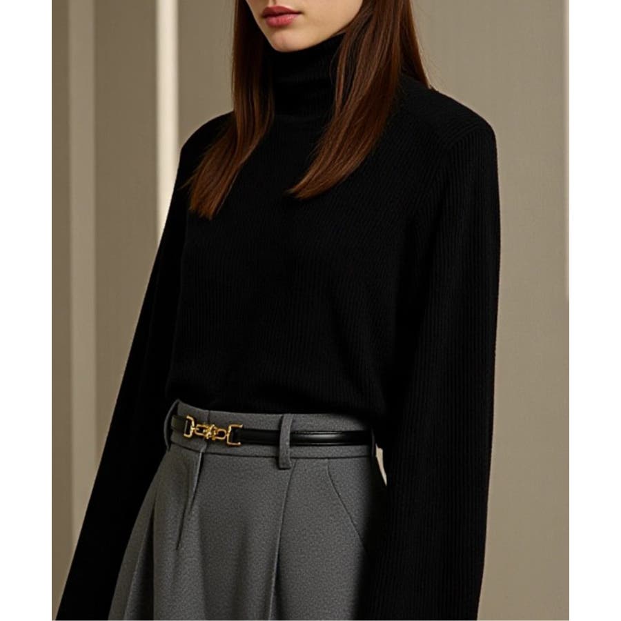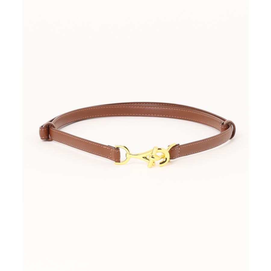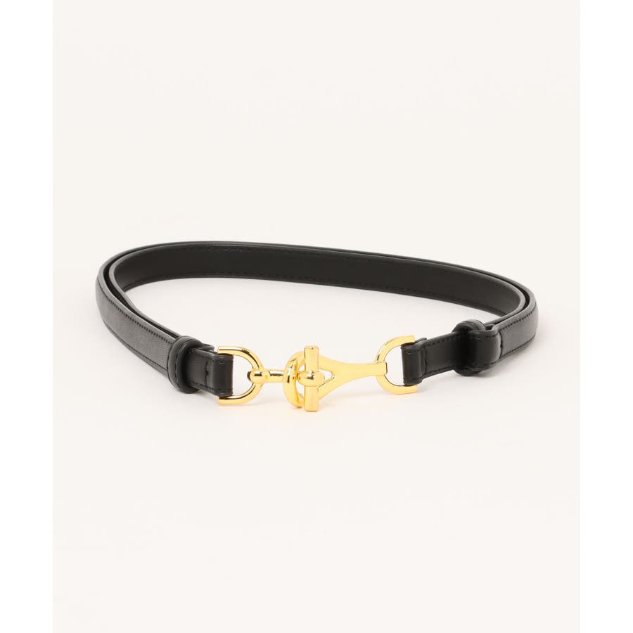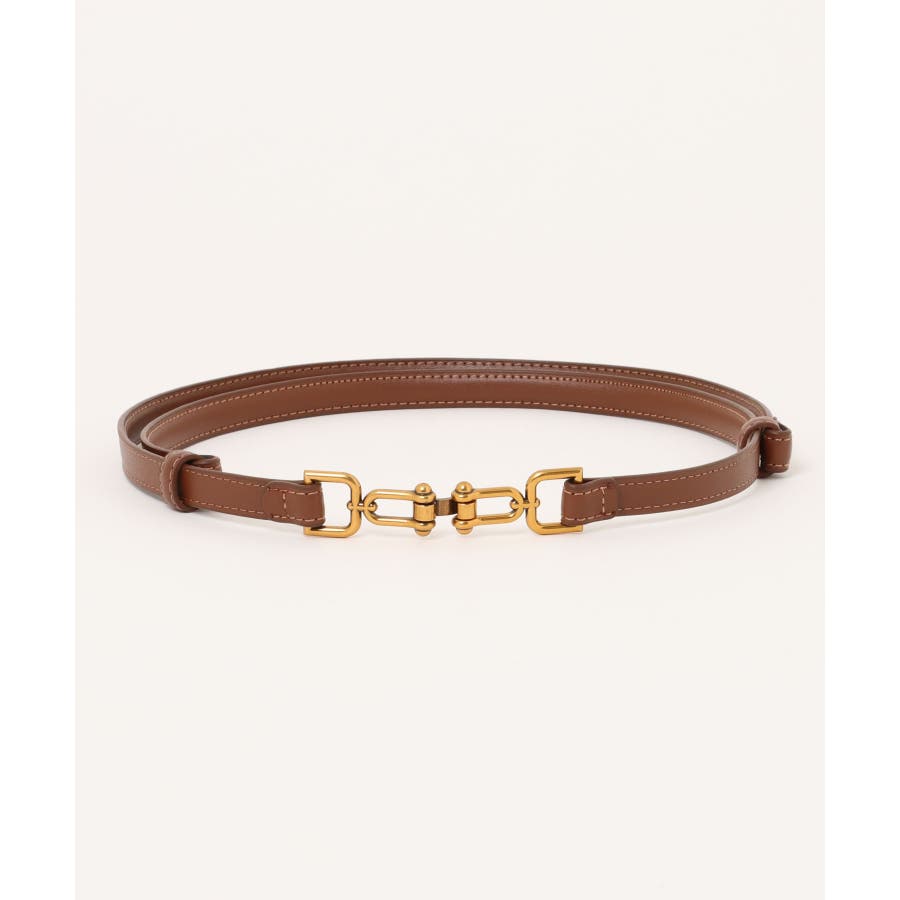 細身のベルトラインに、輝きを放つゴールドのメタルバックルがエレガントなアクセントを添えています。