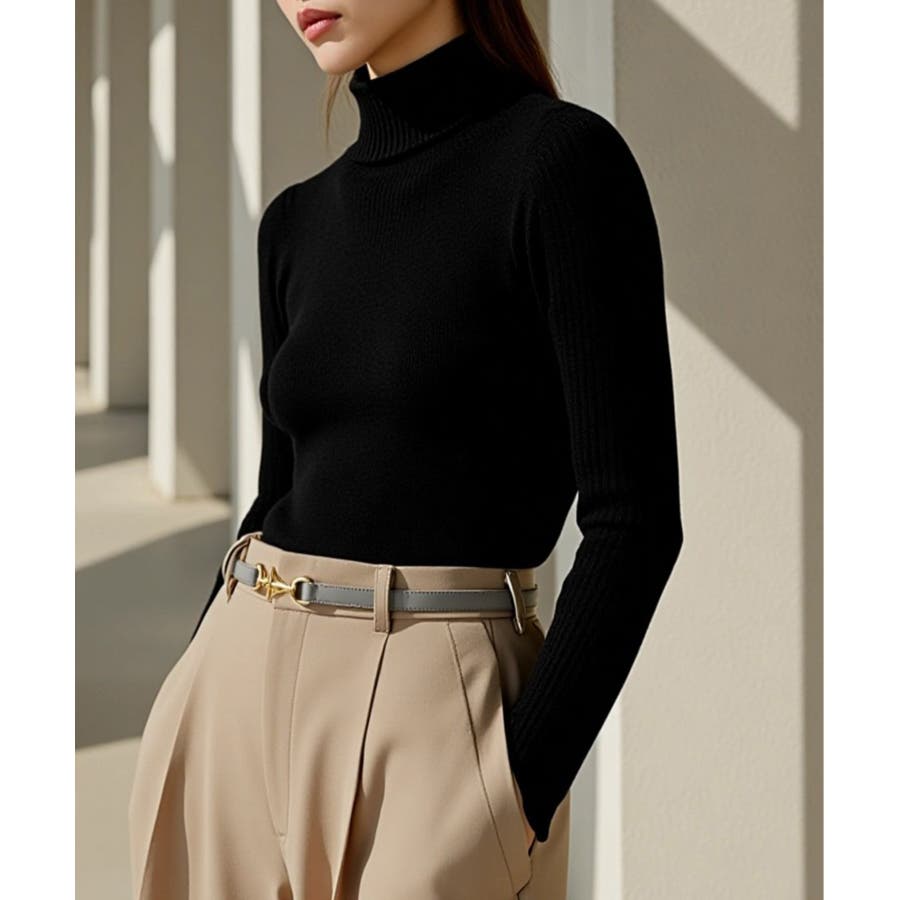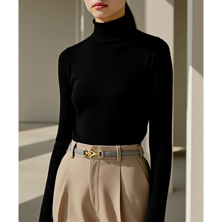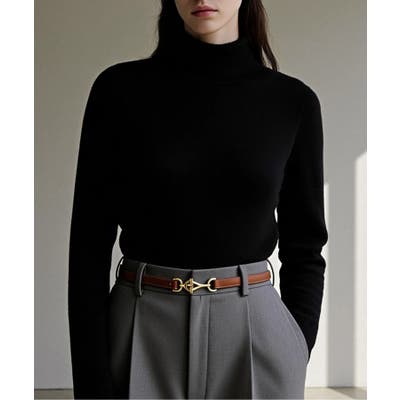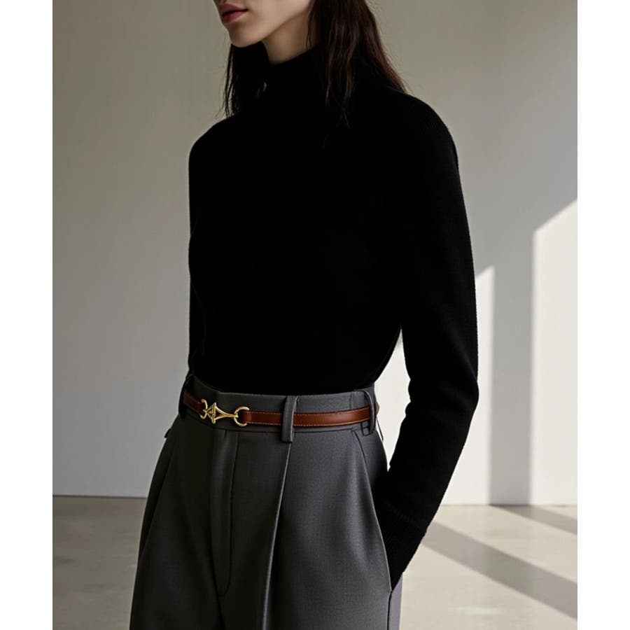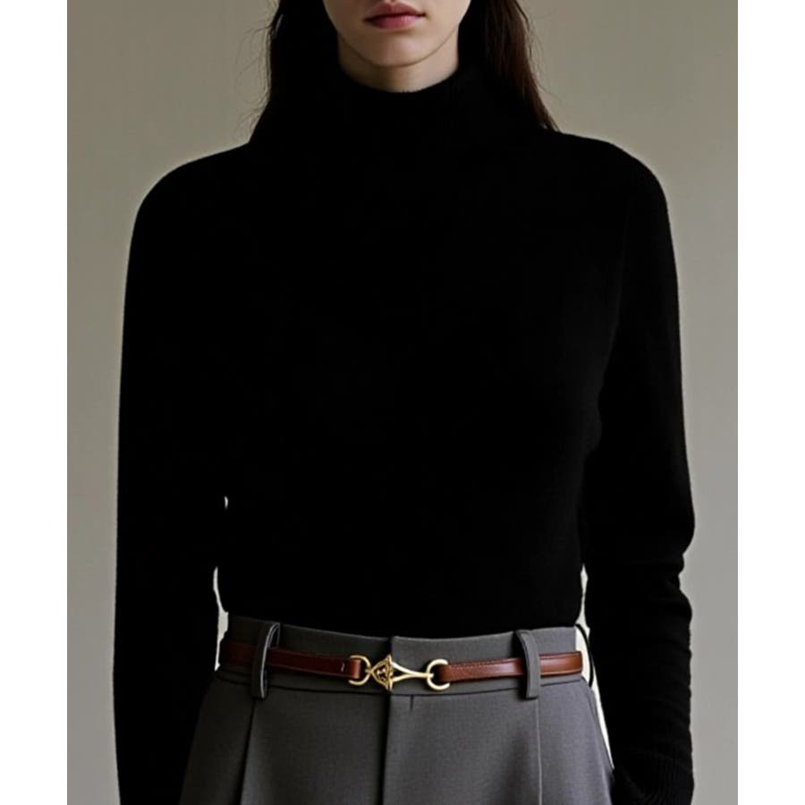 細身のベルトラインに、輝きを放つゴールドのメタルバックルがエレガントなアクセントを添えています。
