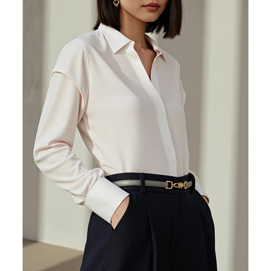 平日は、白シャツにテーパードパンツを合わせたきれいめスタイルに。全体を上品なトーンでまとめれば、ゴールドが控えめに輝き、知的で洗練された印象に。