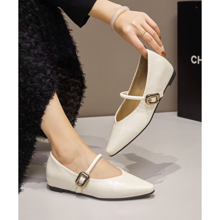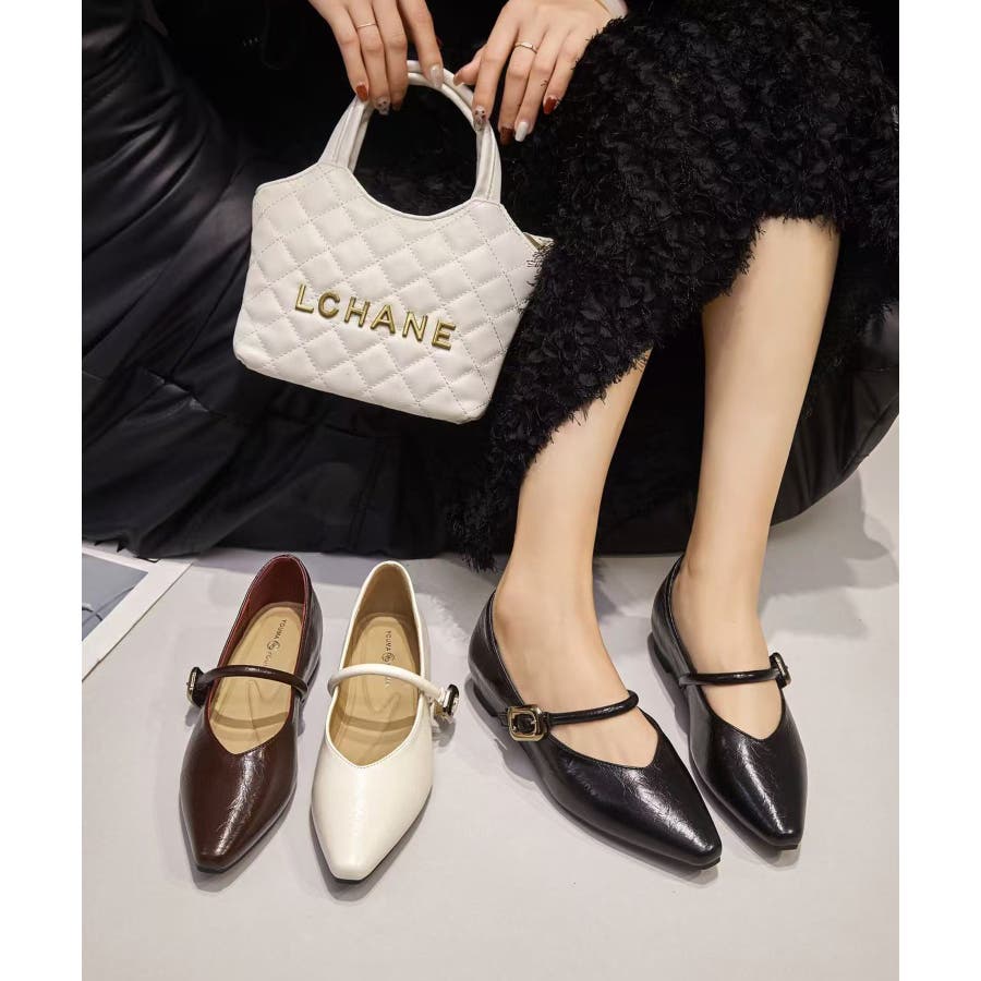 Vカットのシャープなシルエットとサイドに輝くメタルパーツが上品なフラットシューズ。