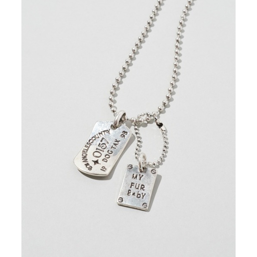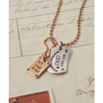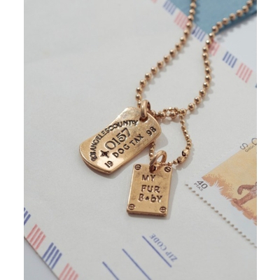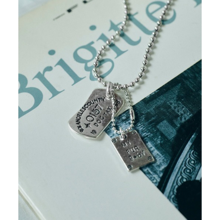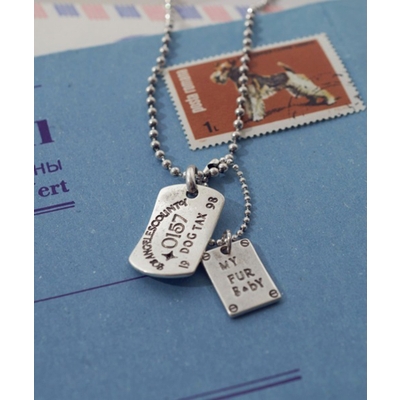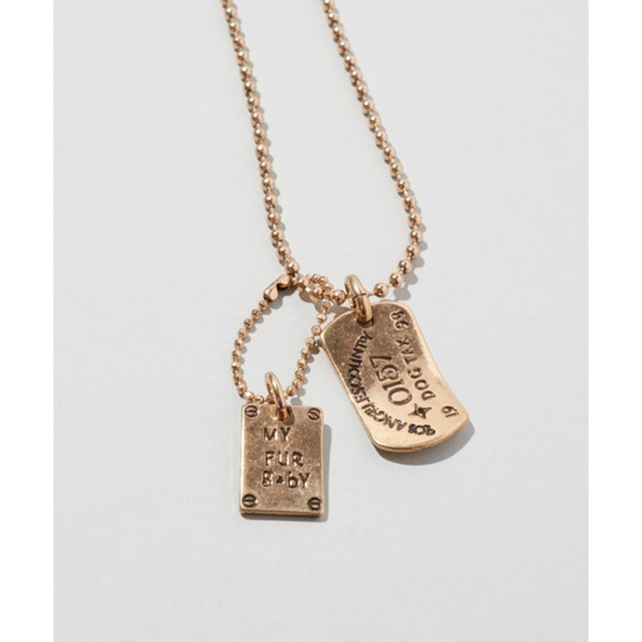 サイズの異なる2種類のドッグタグ風刻印プレートを組み合わせたマルチチャームデザイン。