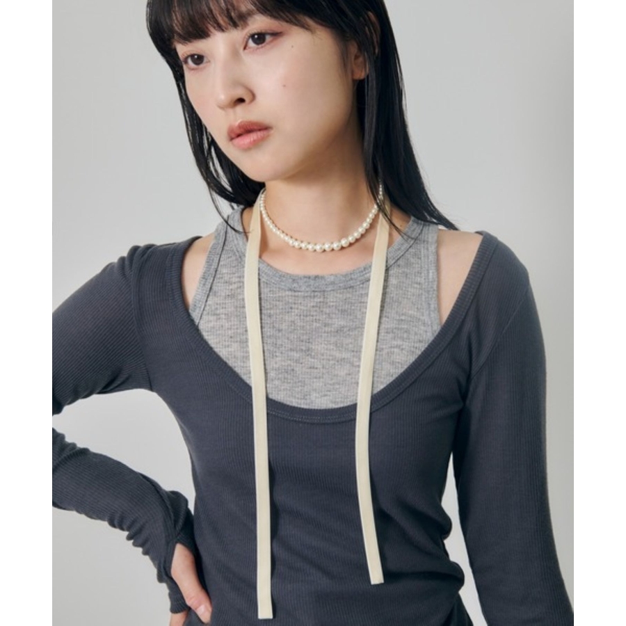 ・リボンをチョーカーのように短く結び、他のネックレスとレイヤードしてトレンド感のあるスタイルに。