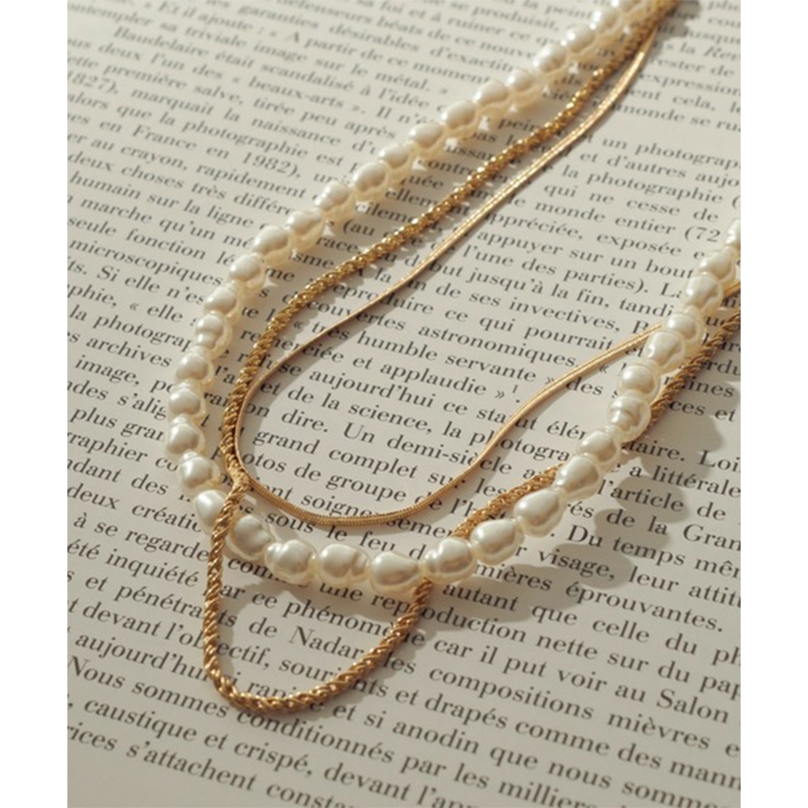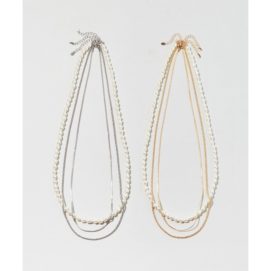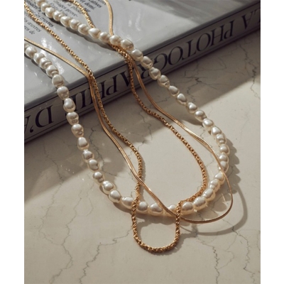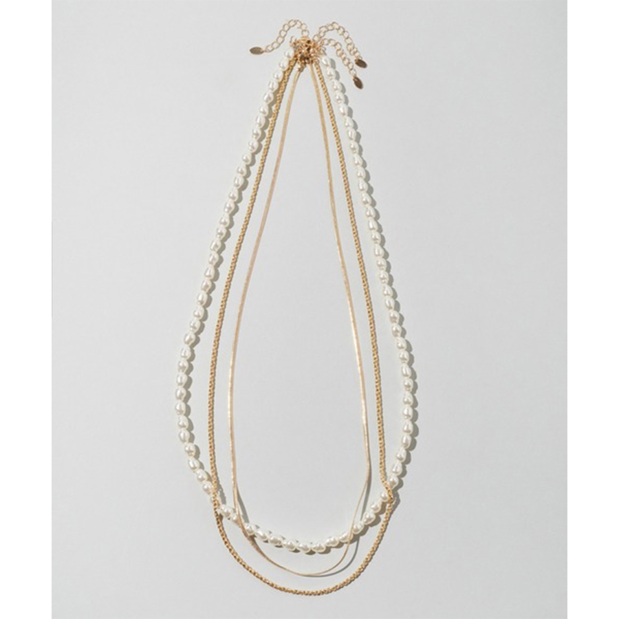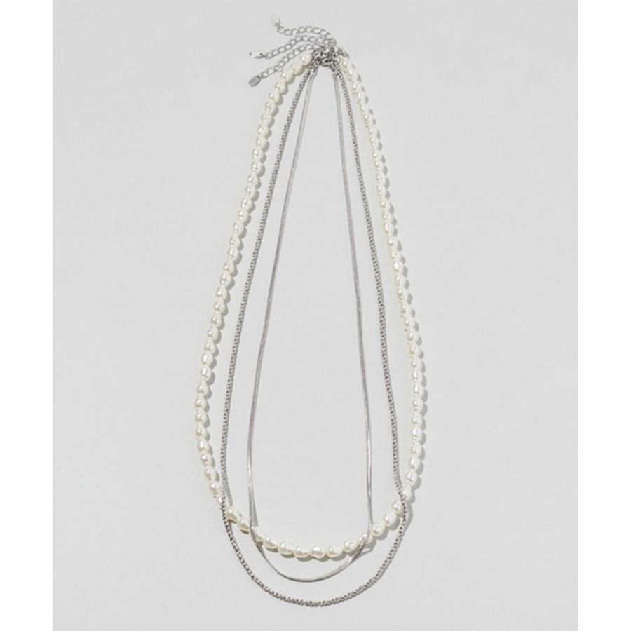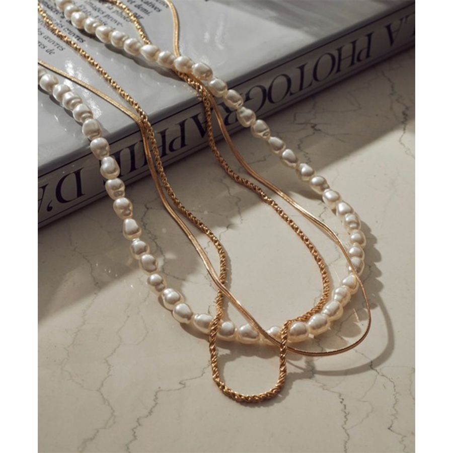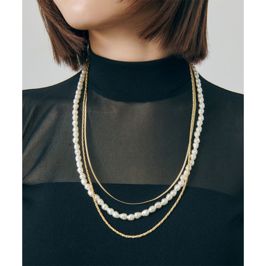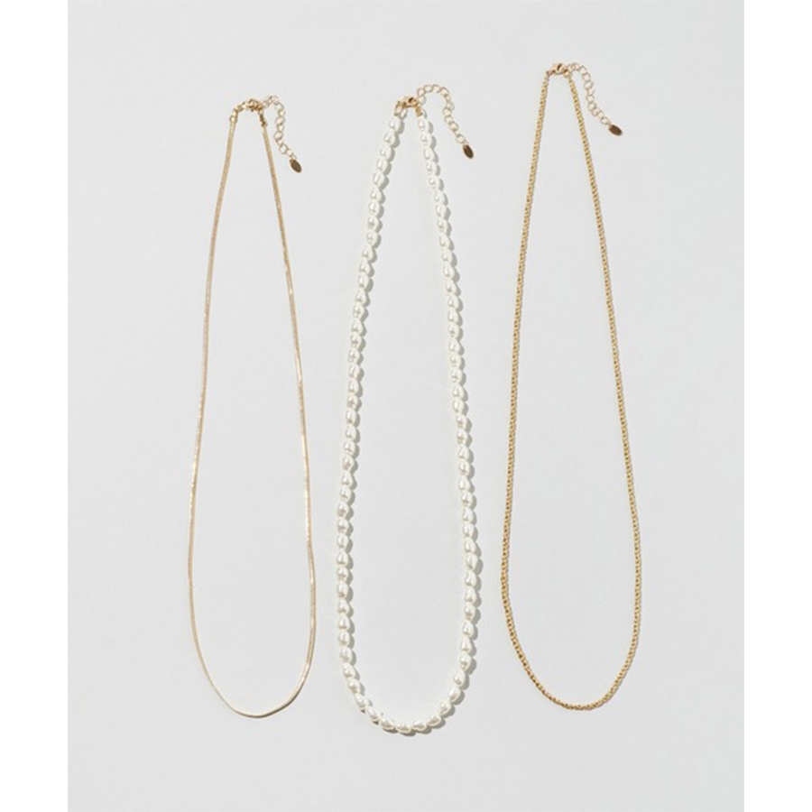 パールネックレス、ロープチェーン、スネークチェーンという、デザインと質感の異なる3種類のネックレスを組み合わせたセットです。