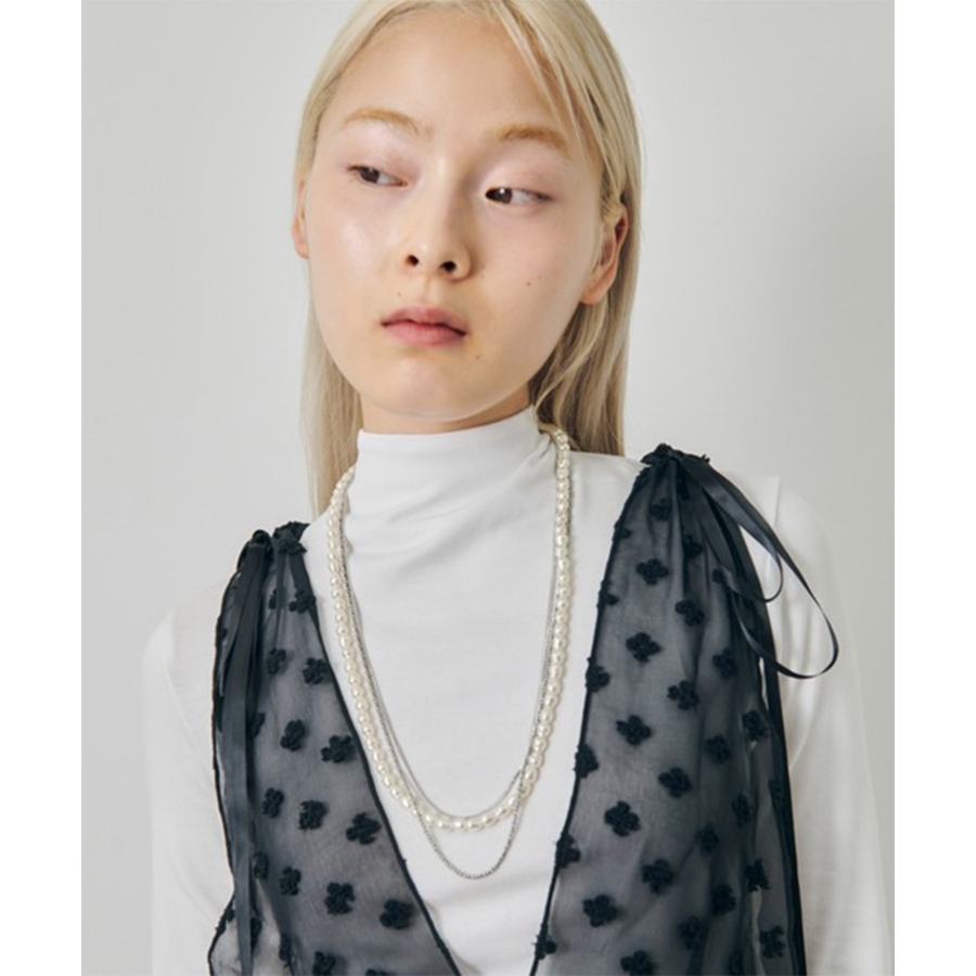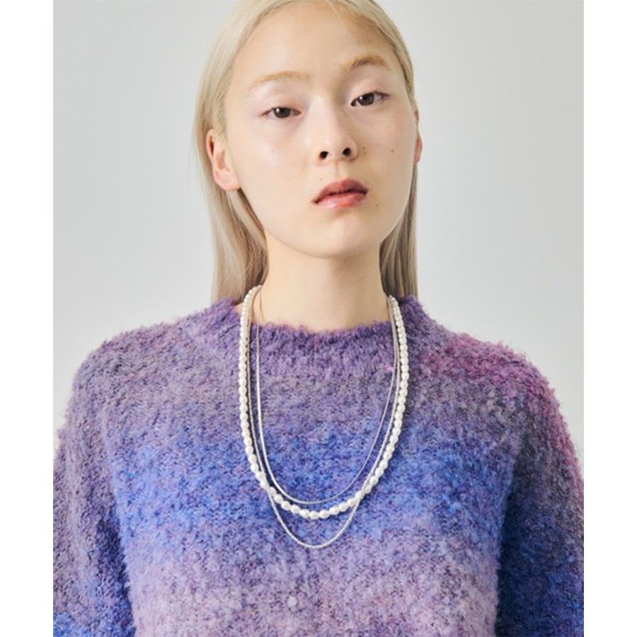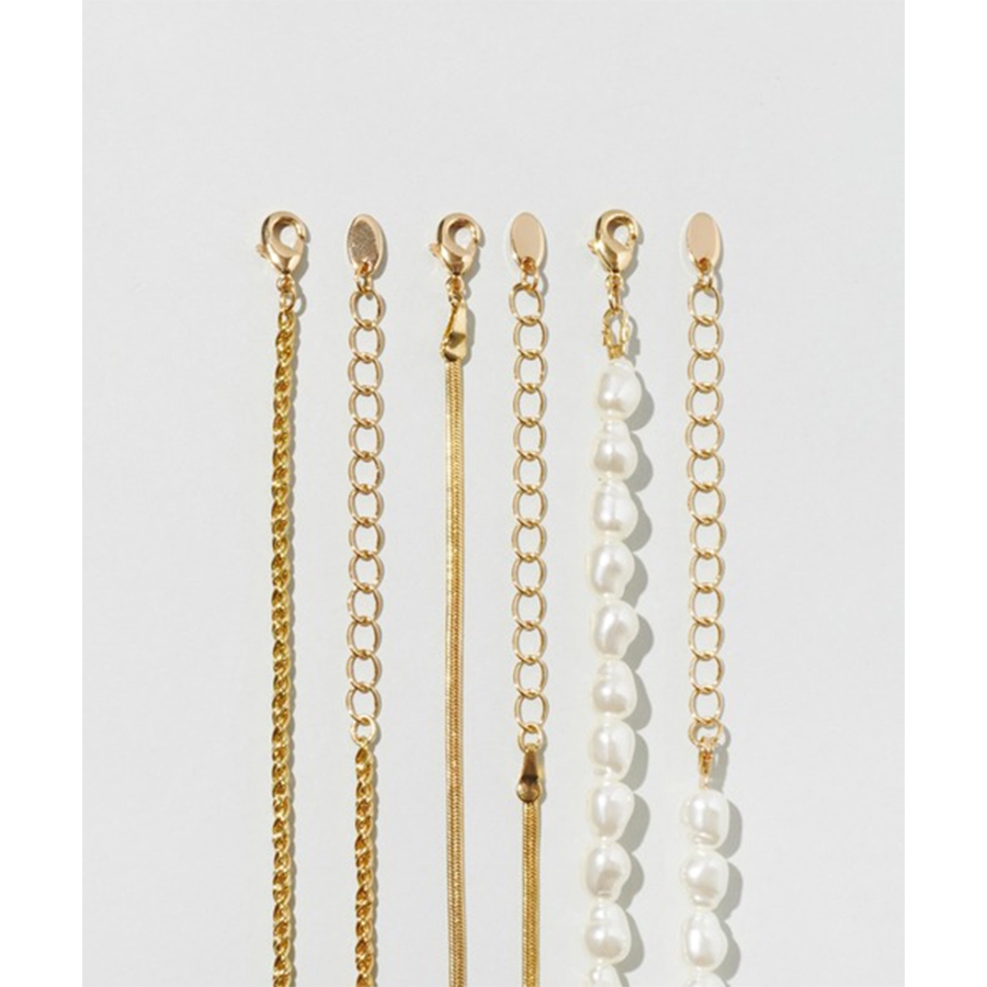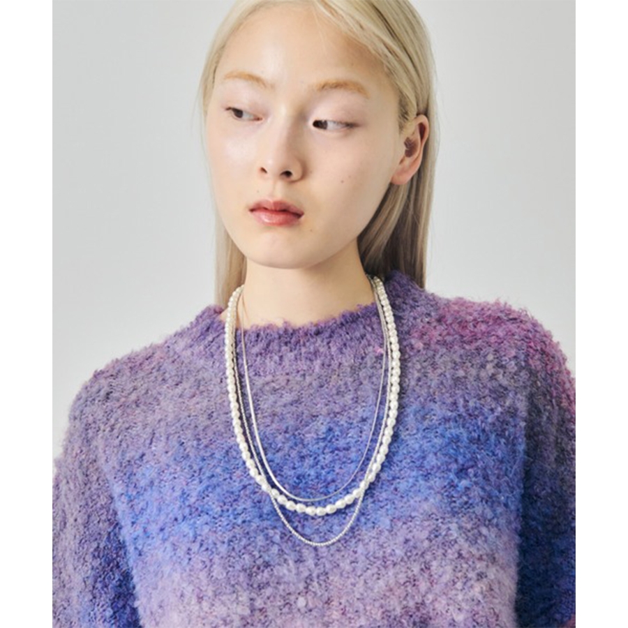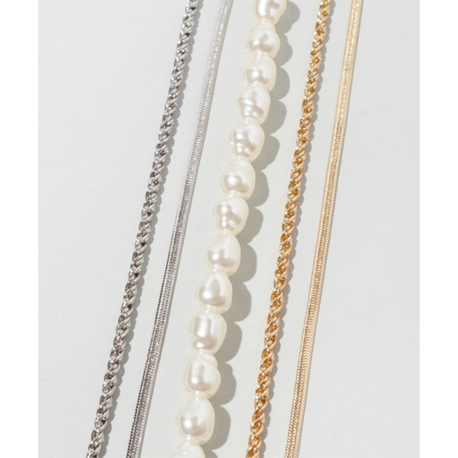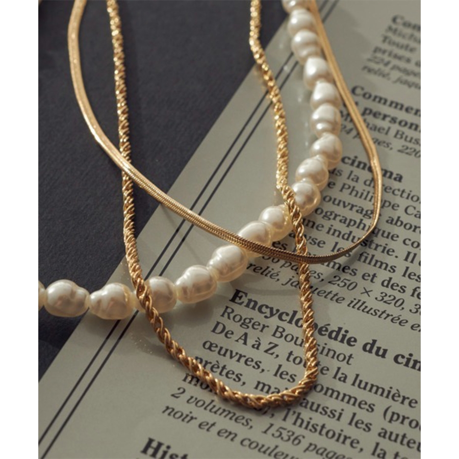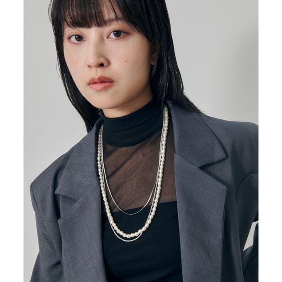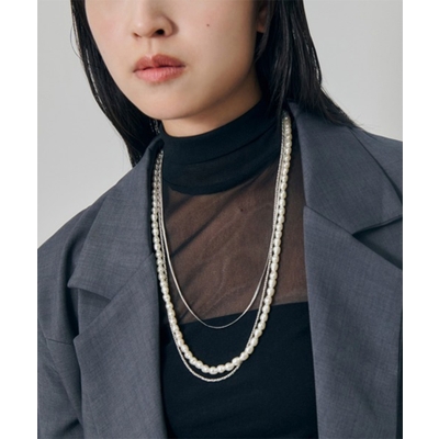 パールネックレス、ロープチェーン、スネークチェーンという、デザインと質感の異なる3種類のネックレスを組み合わせたセットです。