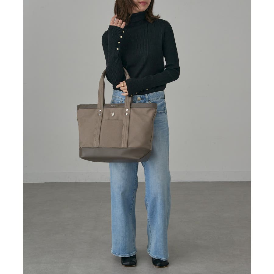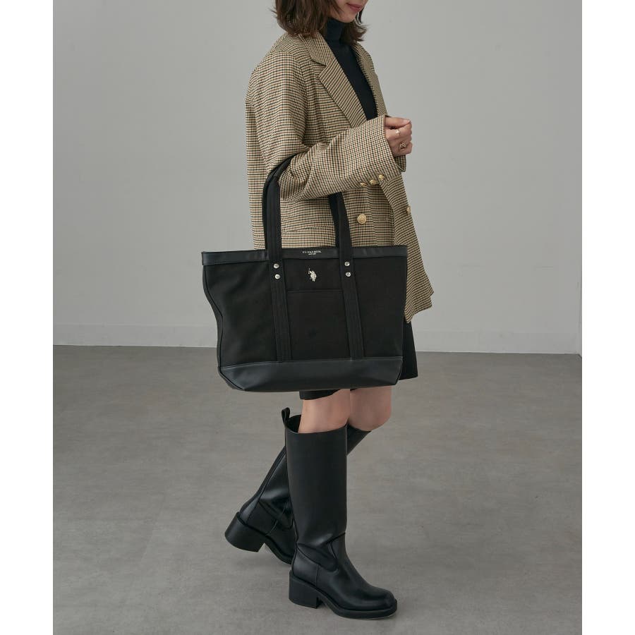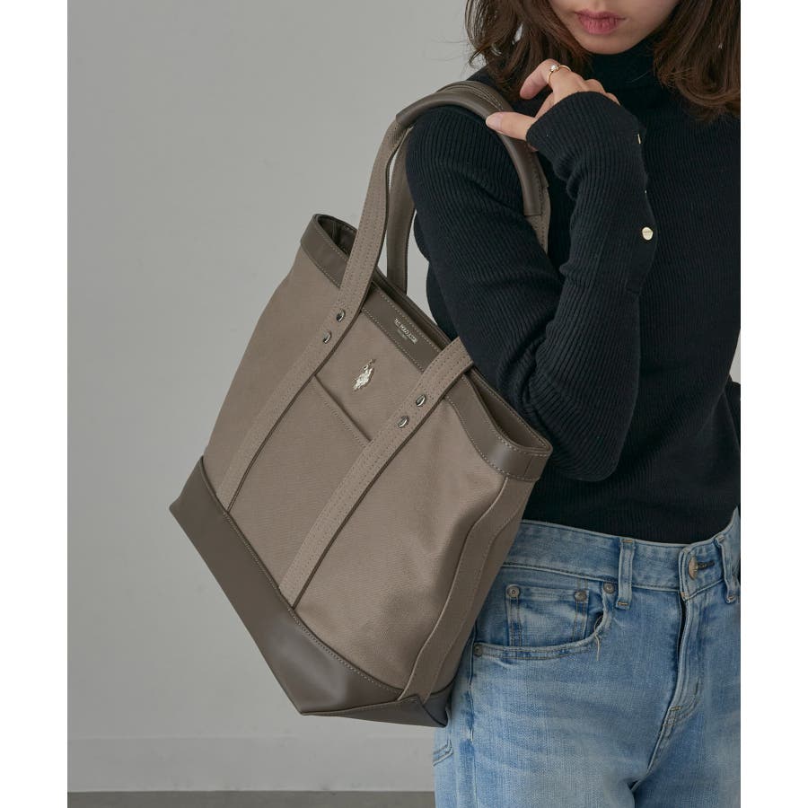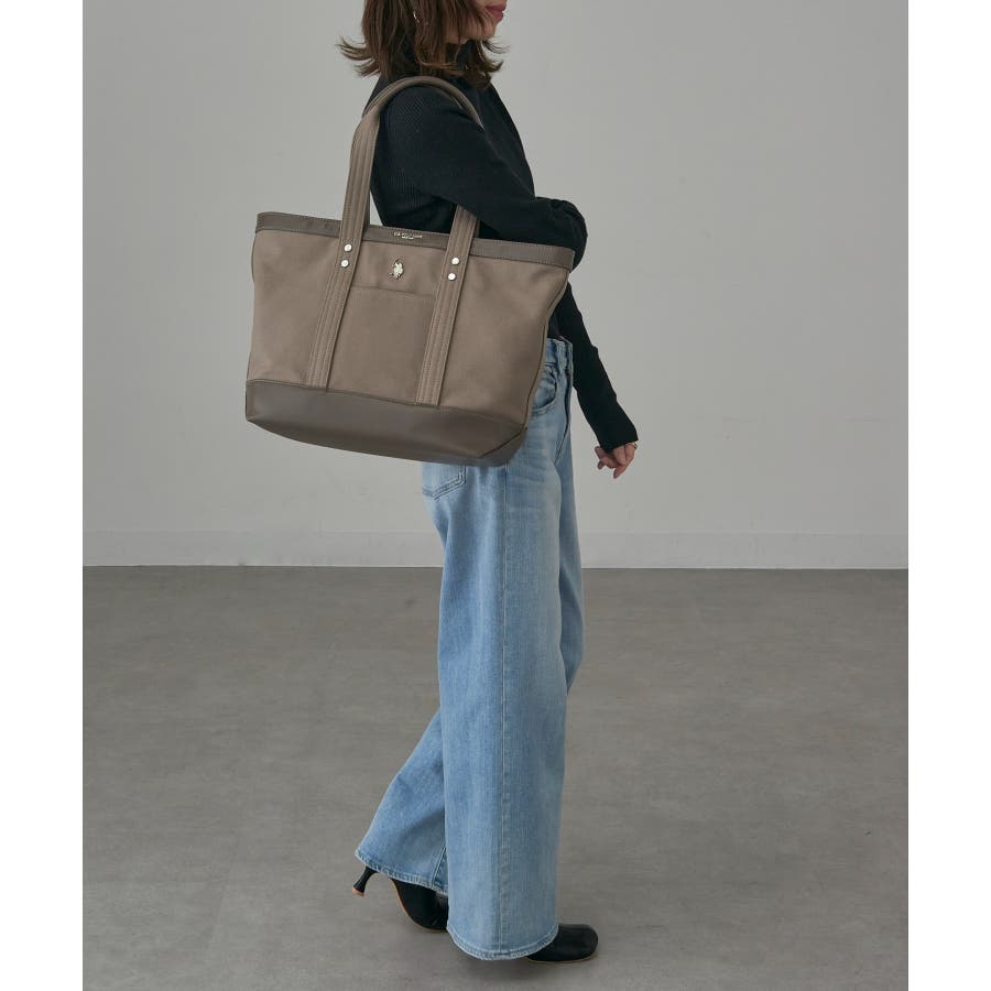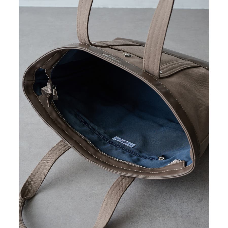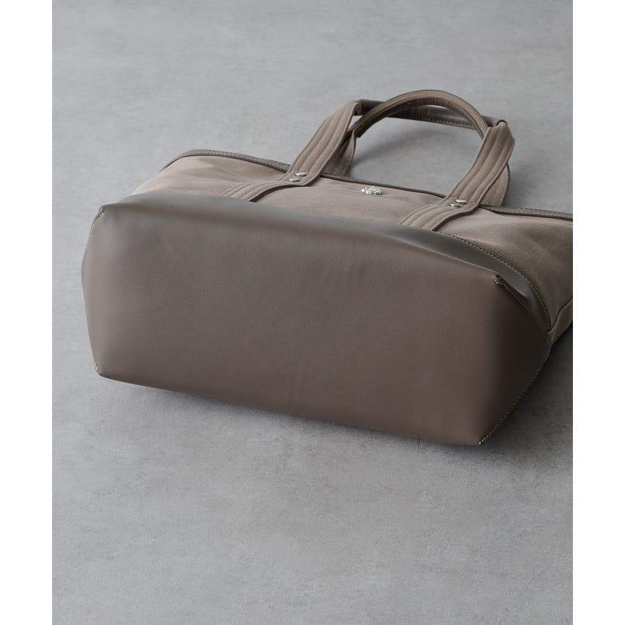 カジュアルな素材であるキャンバスに、レザー調の異素材を組み合わせることで、上品さと耐久性を両立させています。