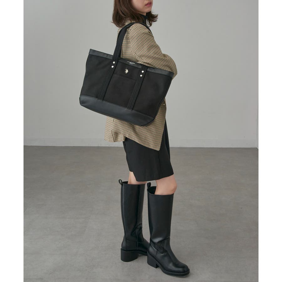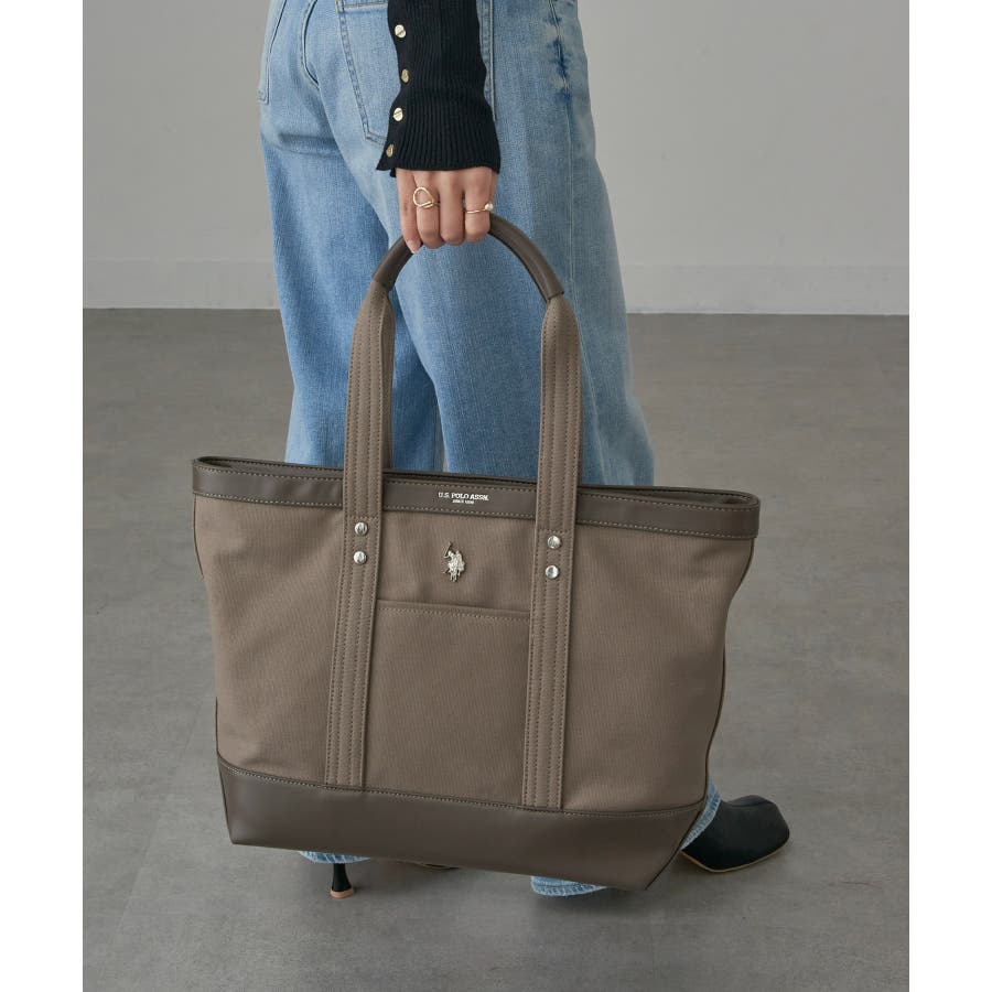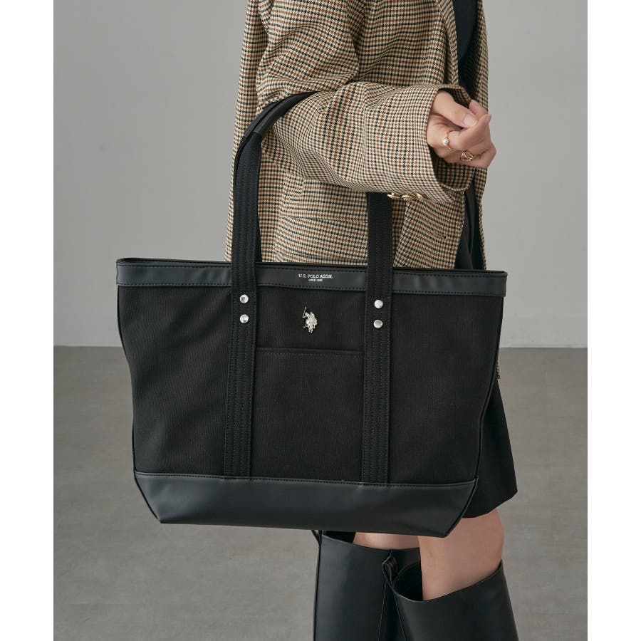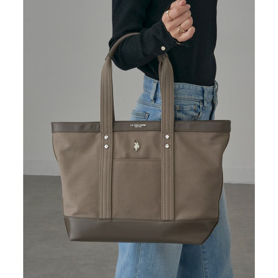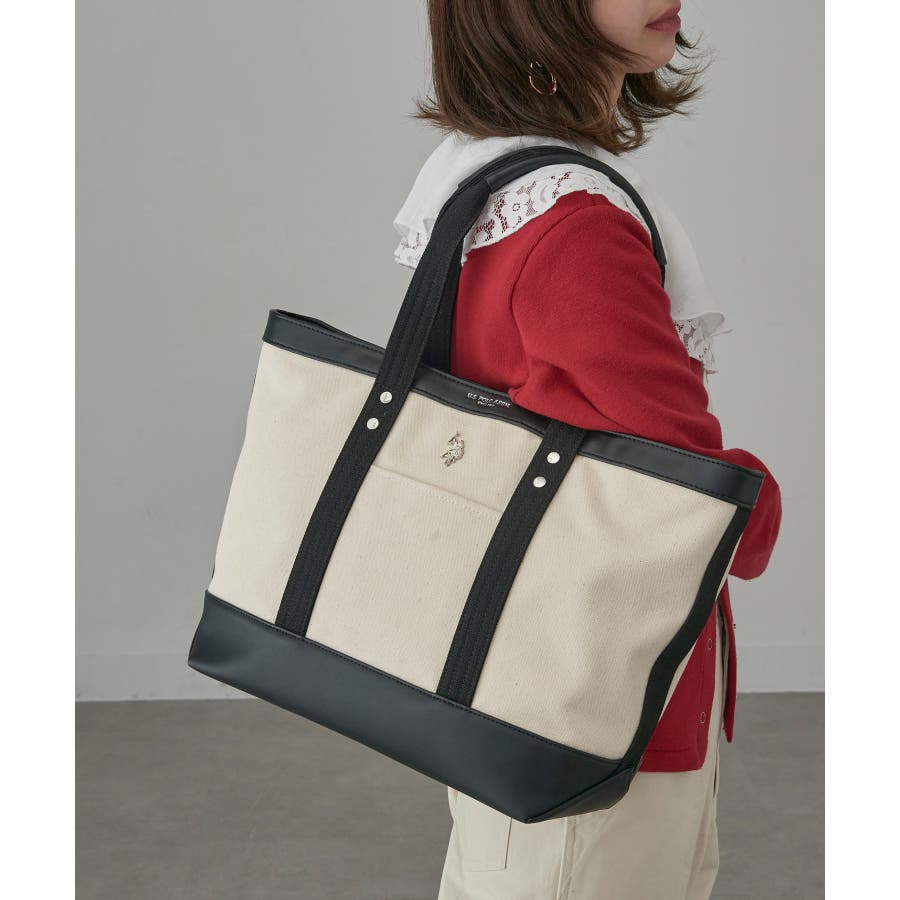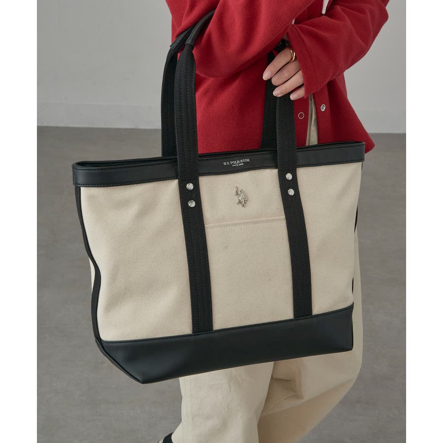 カジュアルな素材であるキャンバスに、レザー調の異素材を組み合わせることで、上品さと耐久性を両立させています。