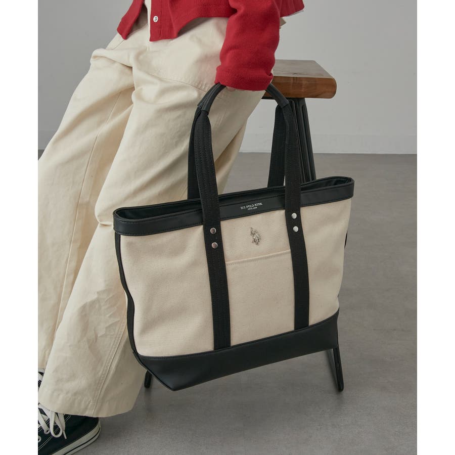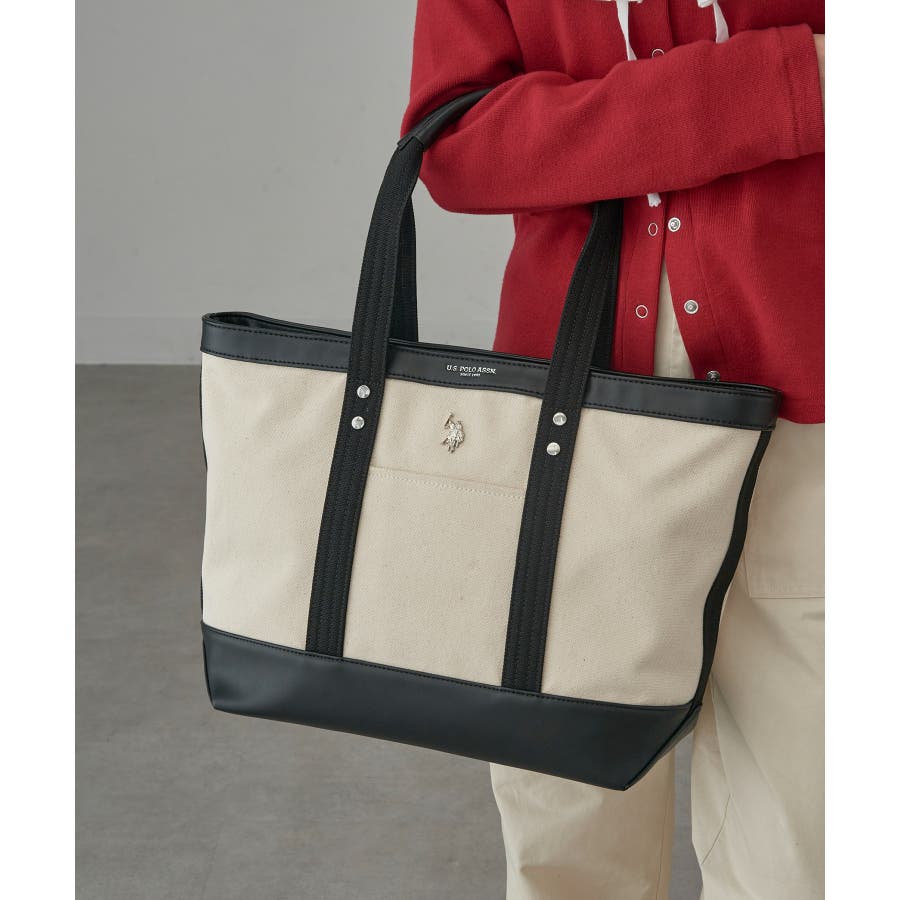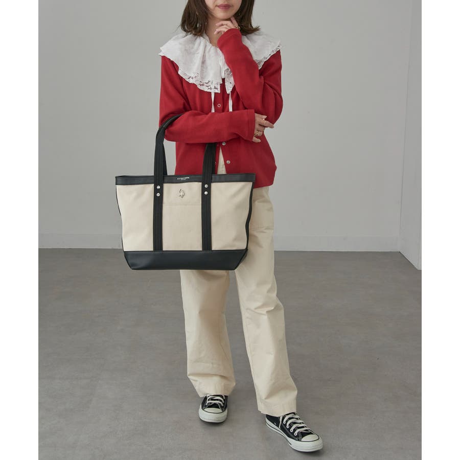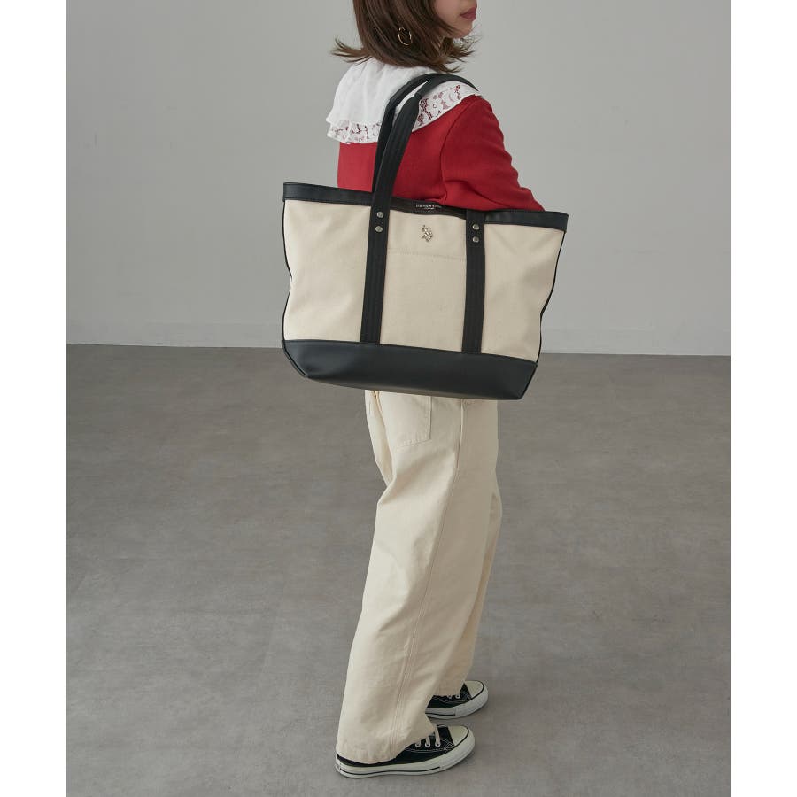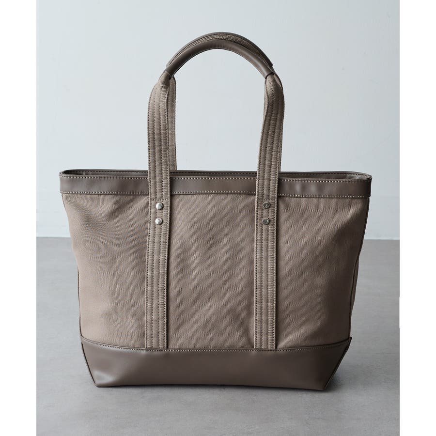 丈夫でハリのあるコットンキャンバス生地に、ハンドルやマチ部分へ合成皮革を組み合わせたバイカラーのトートバッグ。