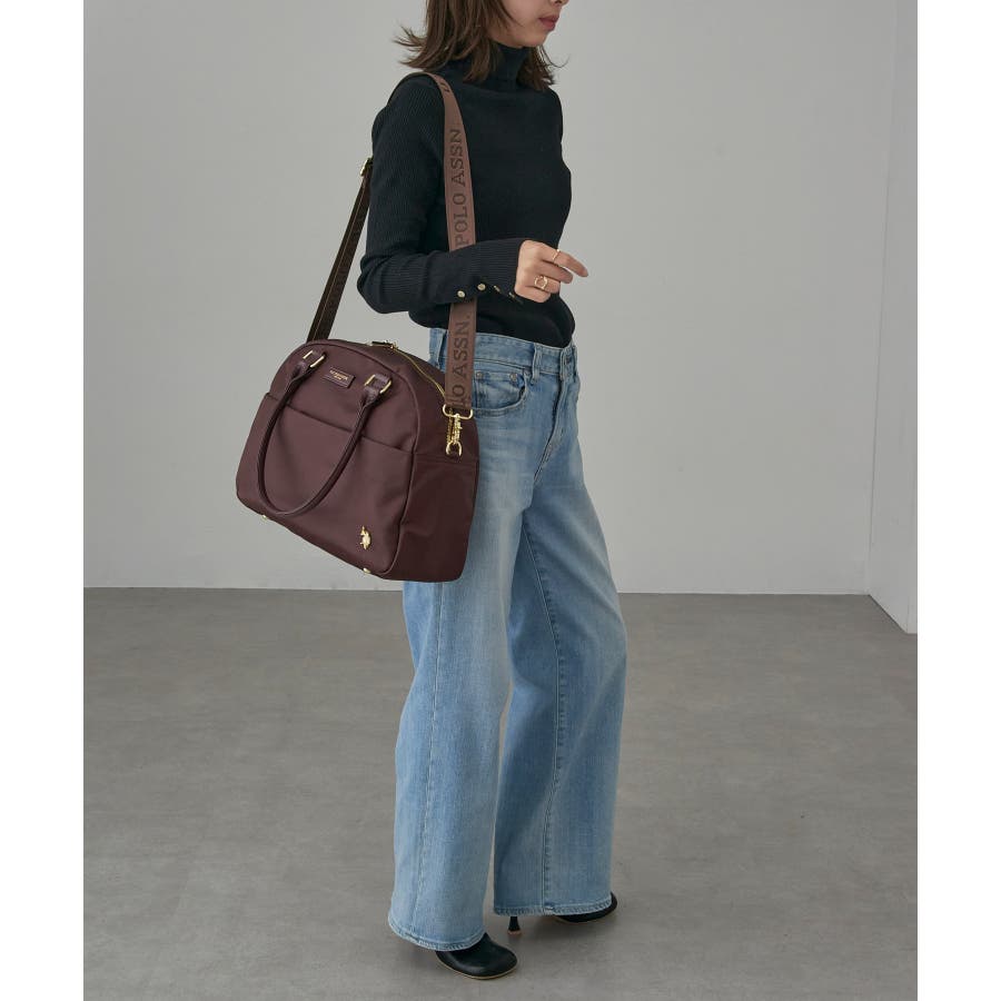 手持ち・肩掛けが可能な2WAY仕様で、付属のロゴ入りショルダーストラップでカジュアルに、合成皮革のハンドルでエレガントにと、シーンに合わせて持ち方を変更できます。