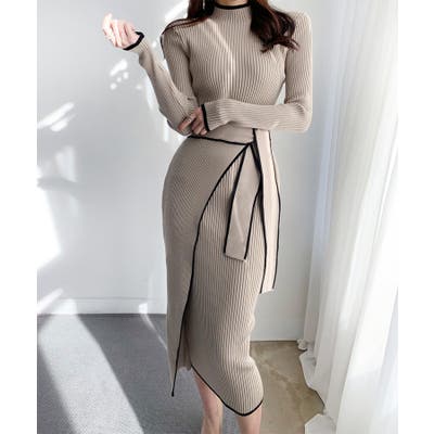 バイカラーパイピングラップニットワンピース 細身 秋冬