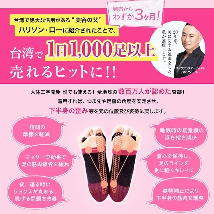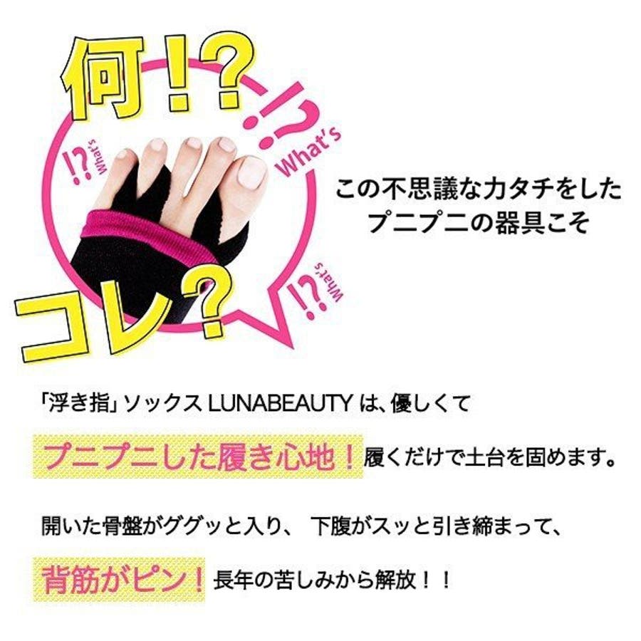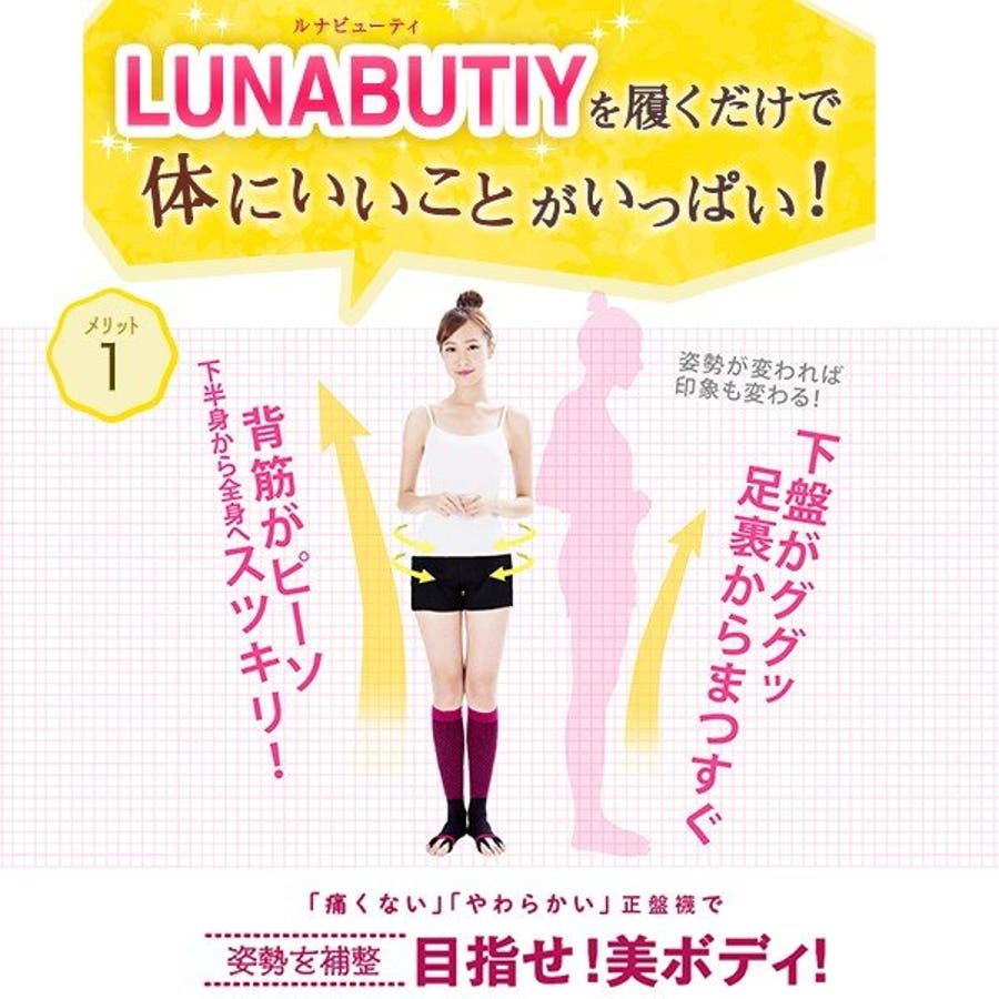 足の健康大国といわれる台湾で話題のアイテム「LUNABEAUTY(ルナビューティー)」が日本初上陸。台湾で絶大な支持を集めるメイクアップアーティスト・美容コンサルタント、ハリソン・ロー氏監修の特殊ダイヤ型3D編み織り(特許取得)の4段階加圧効果が心地よく足にフィット。血流を良くして、むくみも改善。姿勢改善・美脚効果も。足の親指と薬指にリングをっかけて履くだけで、浮き指改善! 就寝時・お家でのリラックスタイムに。 洗濯機で洗えます。・親指と薬指に輪っかをひっかけて履くだけで浮指改善が出来るソックスです。・歩行時、就寝時に履くことをお勧めしています。足指を広げることで全身の機能を活性化させ、効果を加速させます。・4段加圧効果で心地よく足にフィット。血流を良くして、むくみも改善。姿勢改善・美脚効果も。 ・産後のむくみにもお勧めです。・遠赤外線ゲルマニウムを織り込んだ特殊加工布地で体内の電子バランスを維持します。