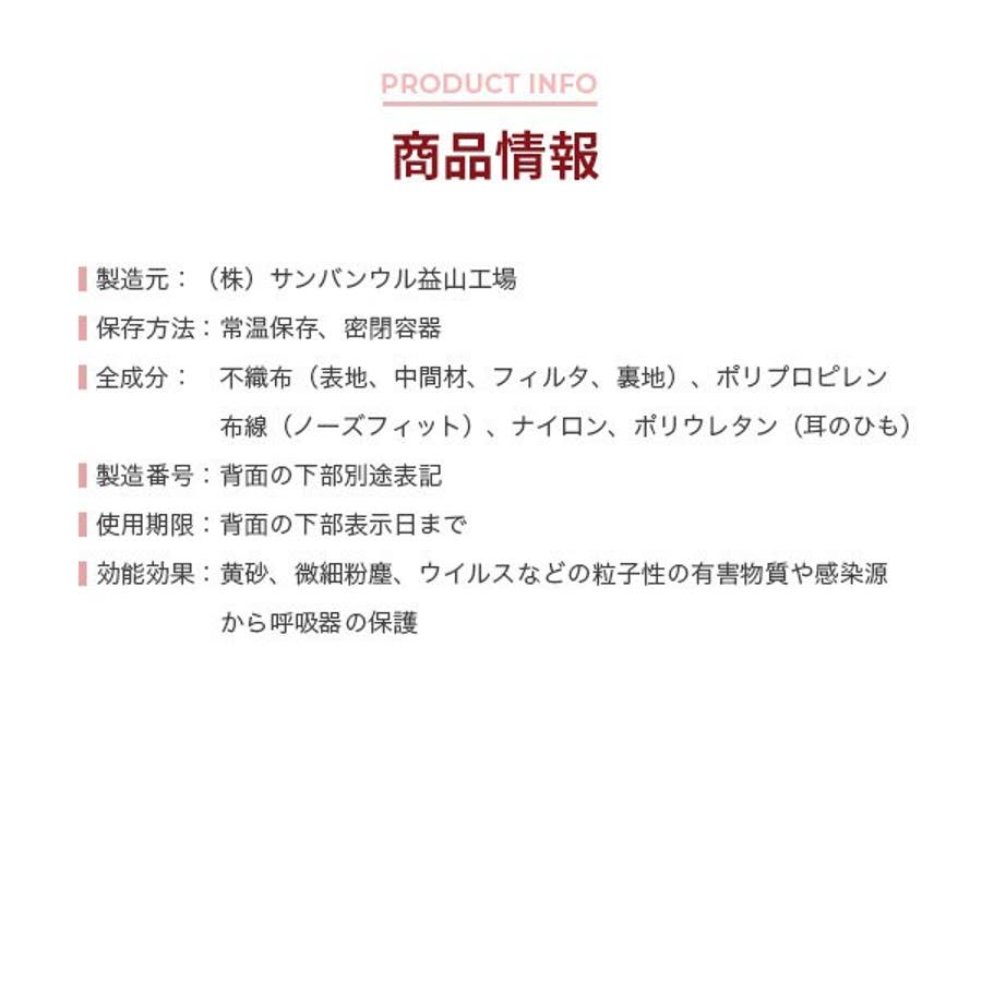 | 素材 | 本体・フィルター:ポリプロピレン不織布 ノーズフィッター:ポリプロピレン布線 耳ひも:ナイロン、ポリウレタン |
