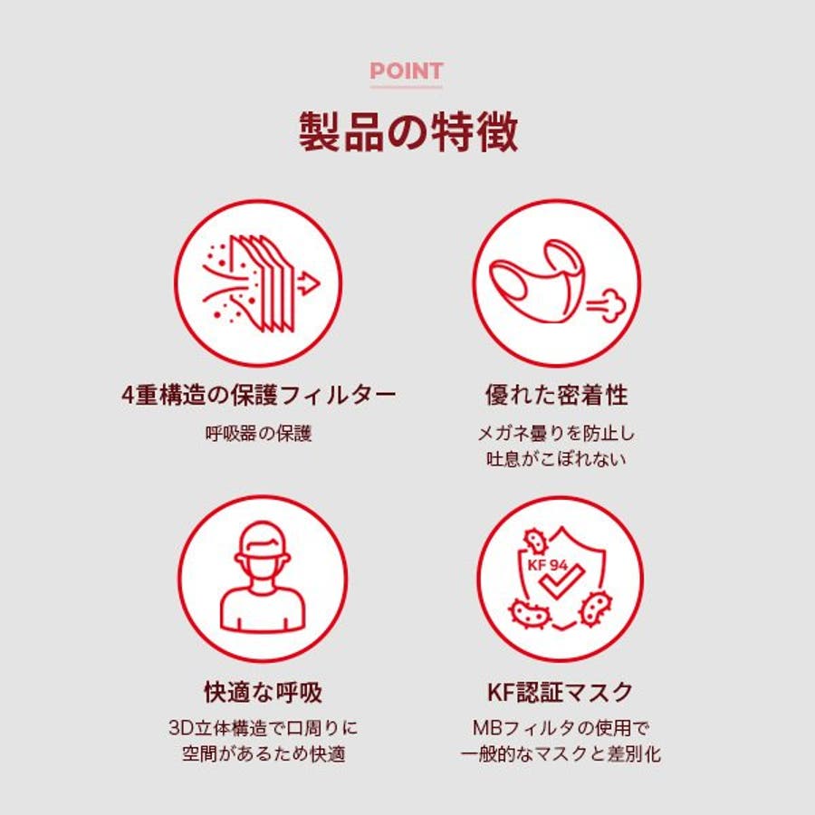 MFDS(韓国食品医薬品安全庁)認証KF94規格(0.4マイクロメートルの粒子を94%以上遮断できる)の防疫用マスクです。