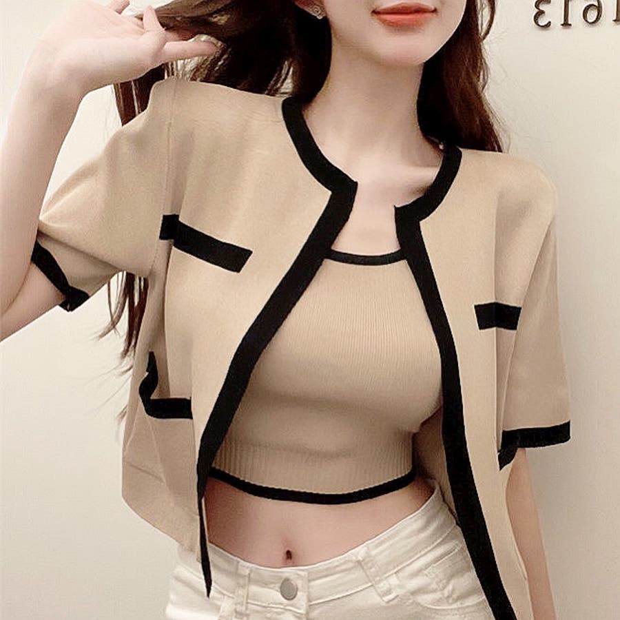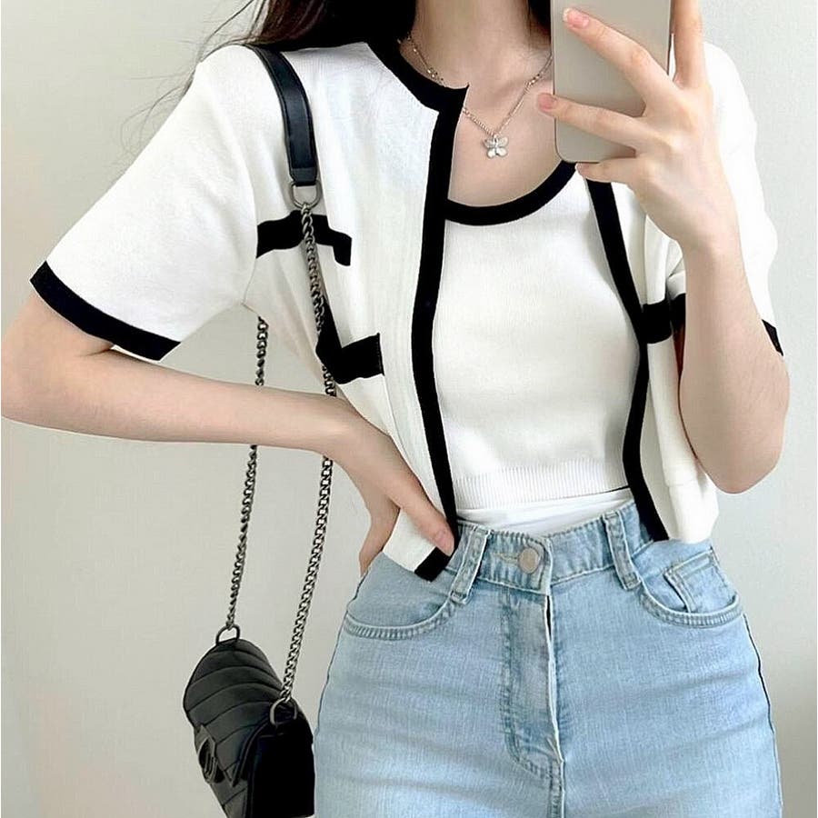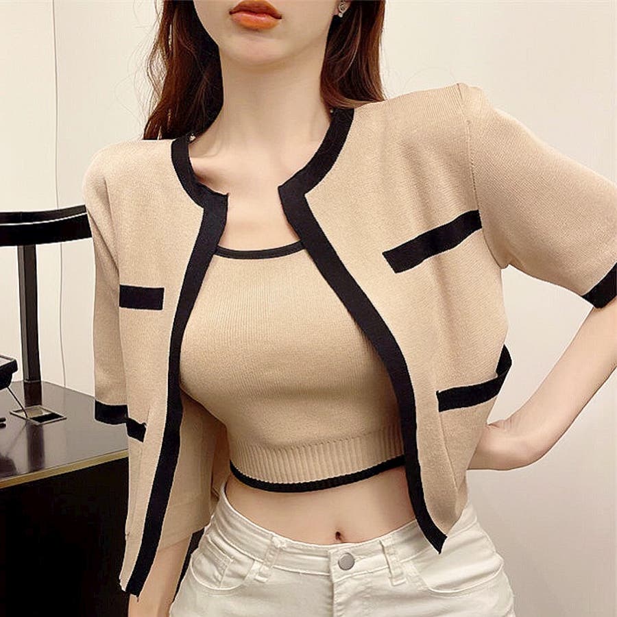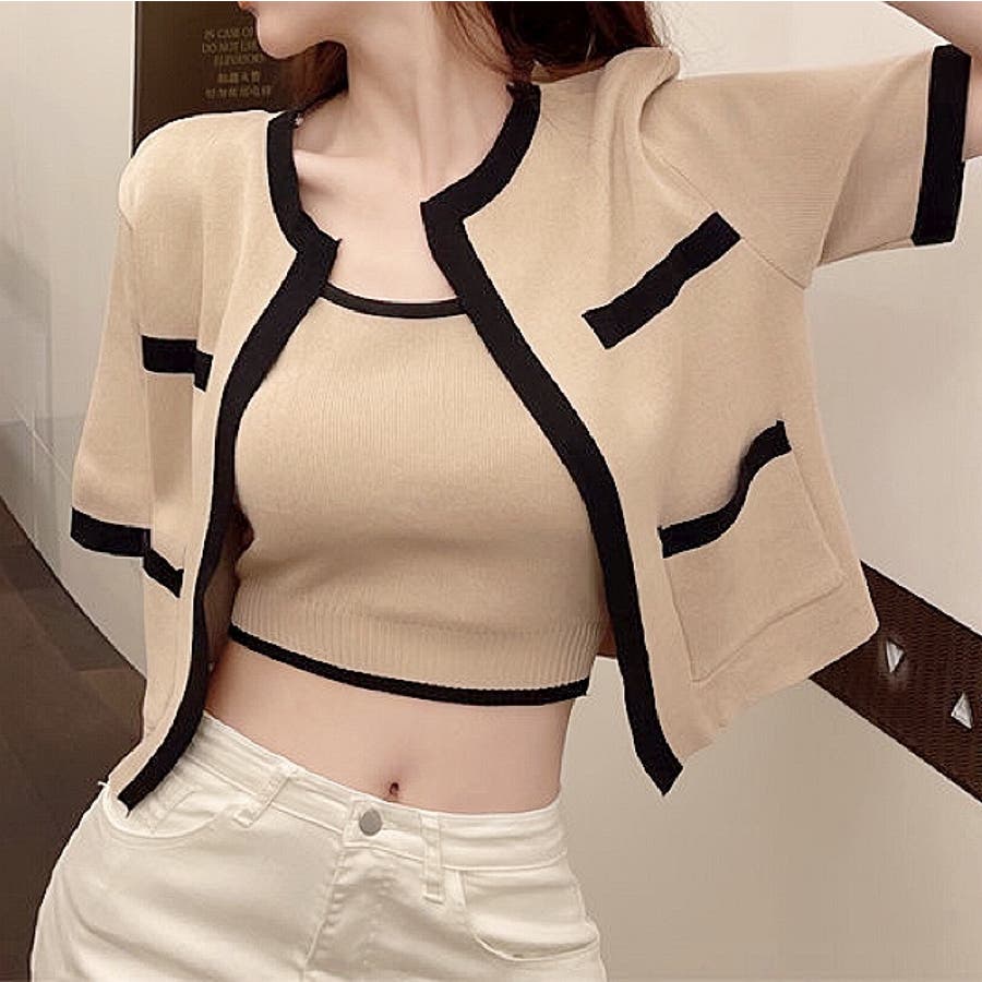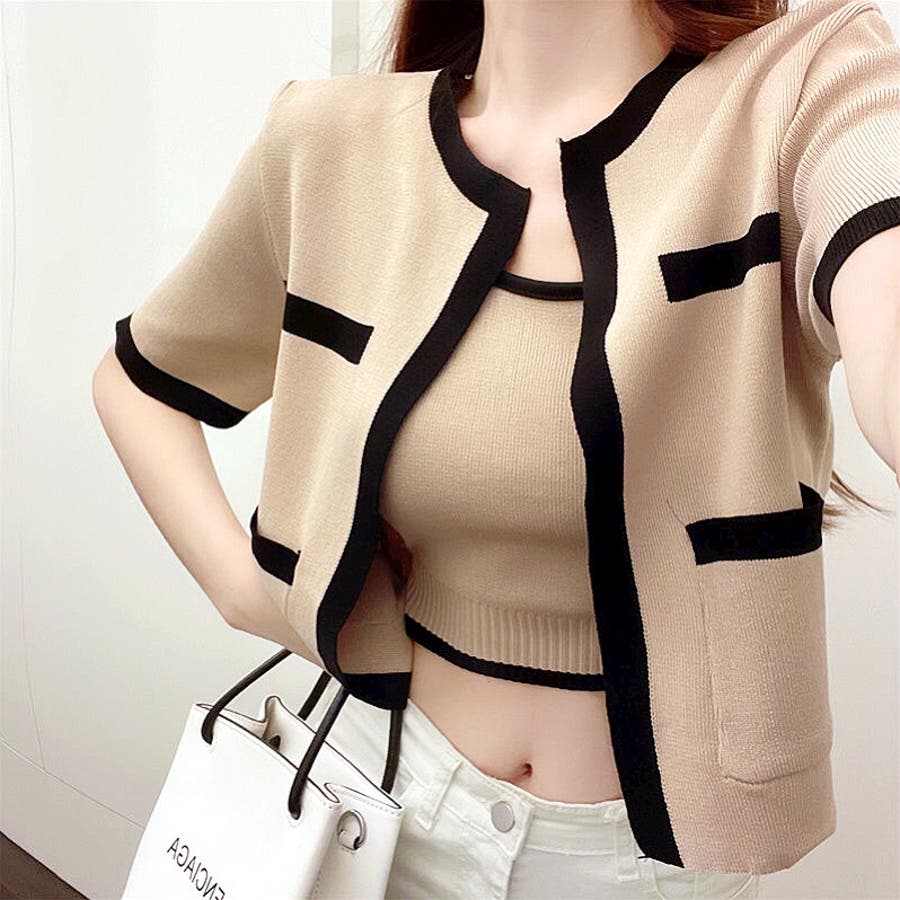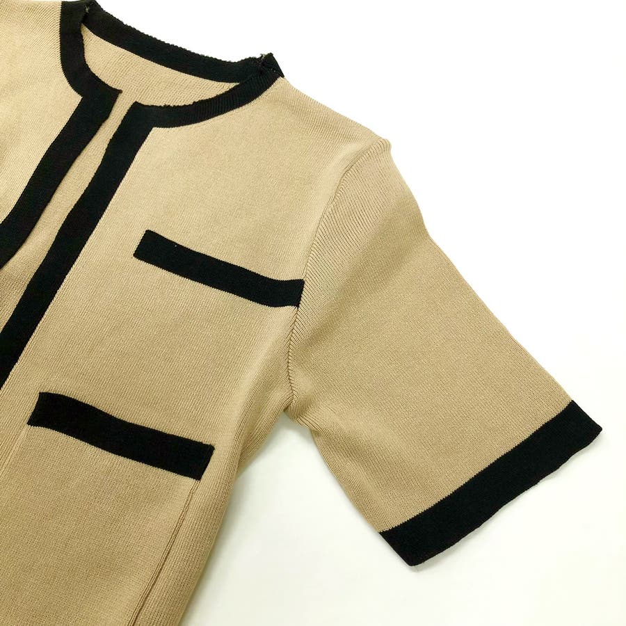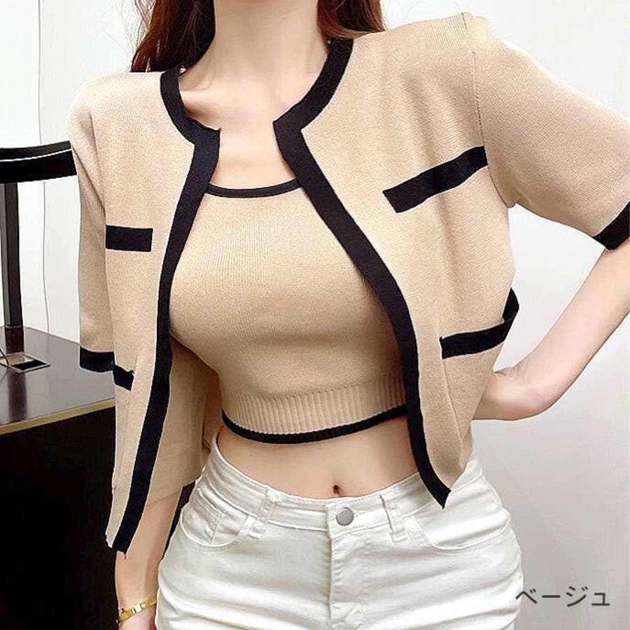 【ベージュ】バイカラー半袖サマーニットアンサンブル 夏 韓国