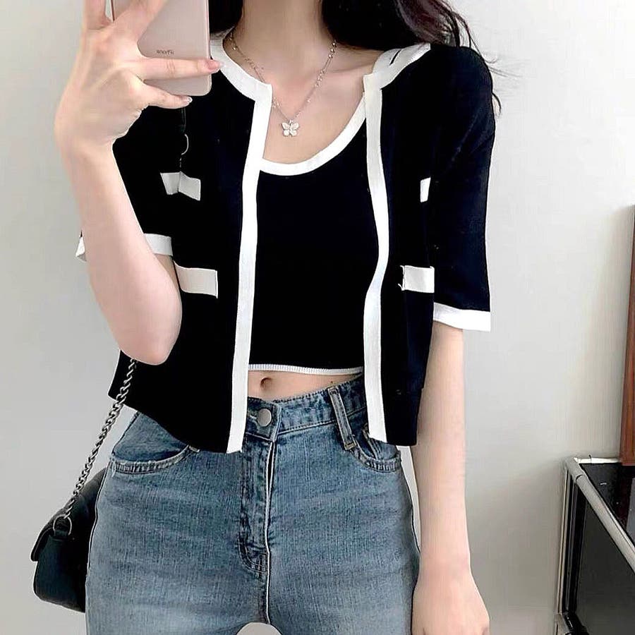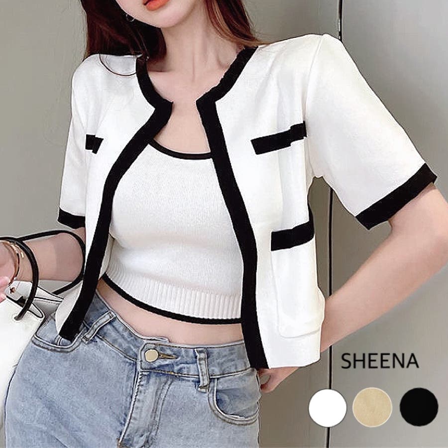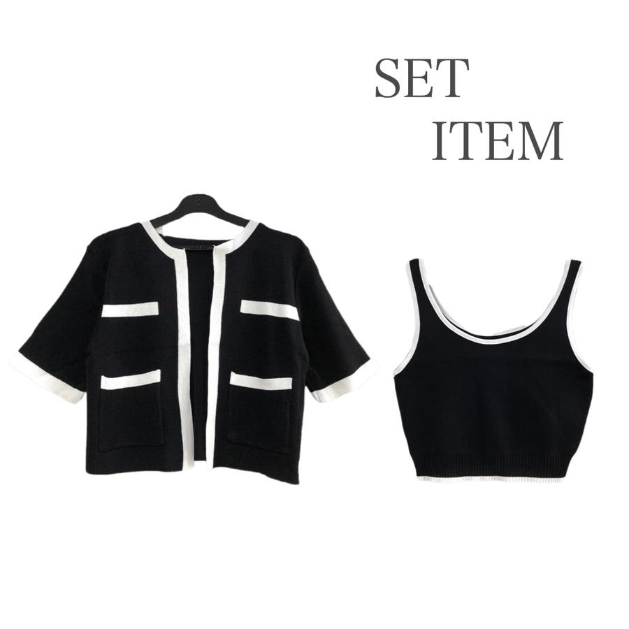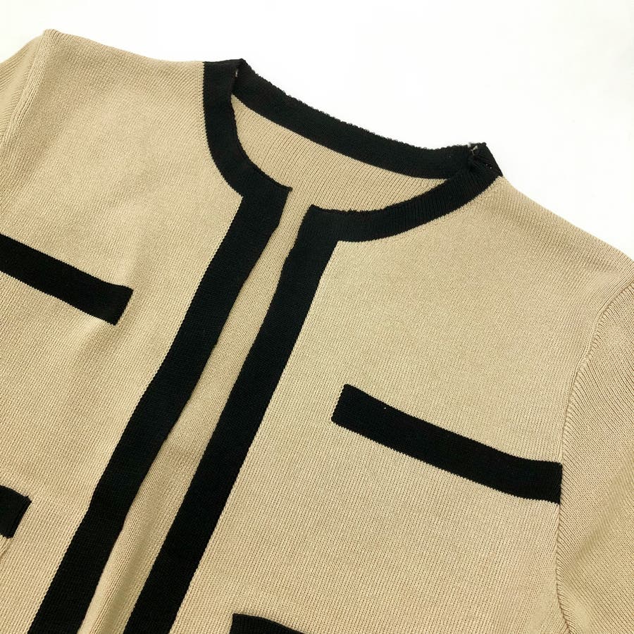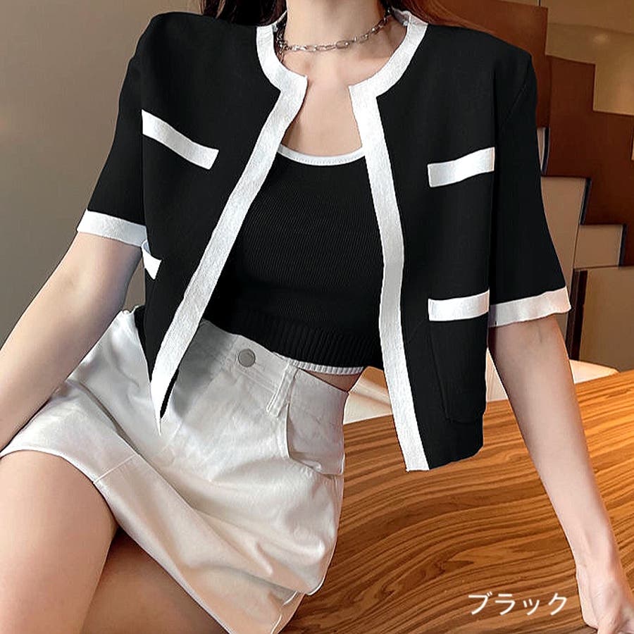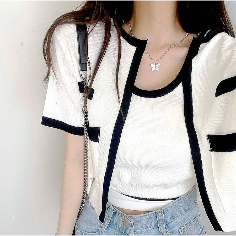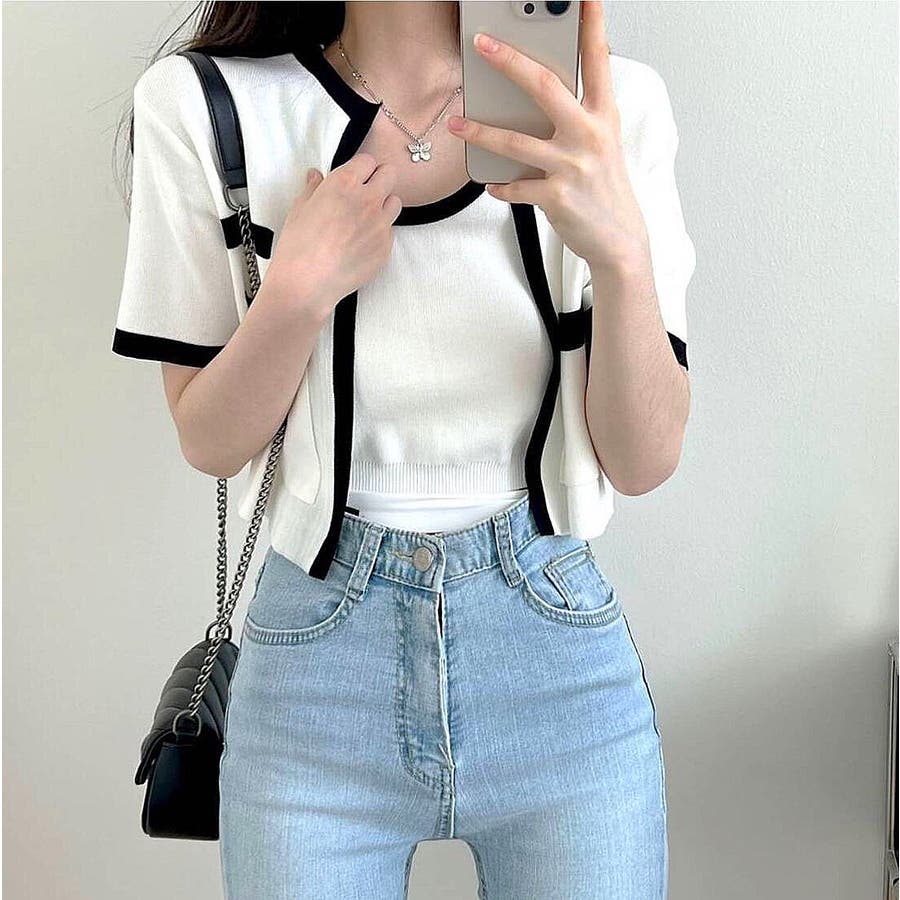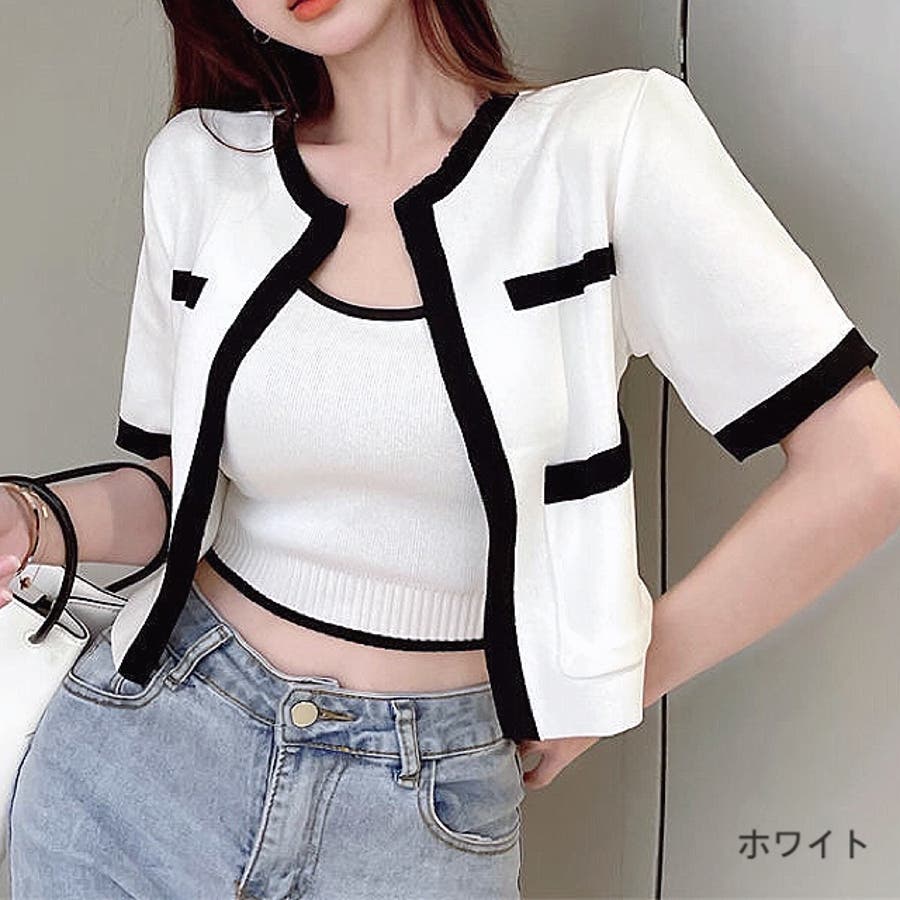【ベージュ】バイカラー半袖サマーニットアンサンブル 夏 韓国