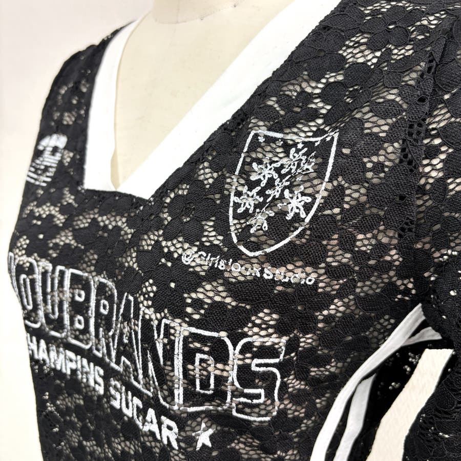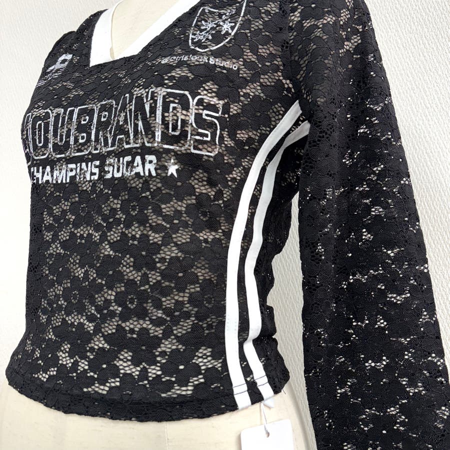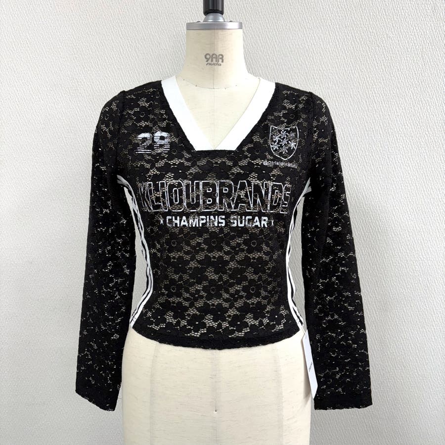 フロントのロゴデザインがアクセントになって、レーストップスながらに甘すぎずカジュアルな印象に。