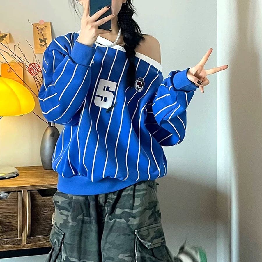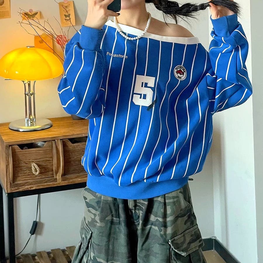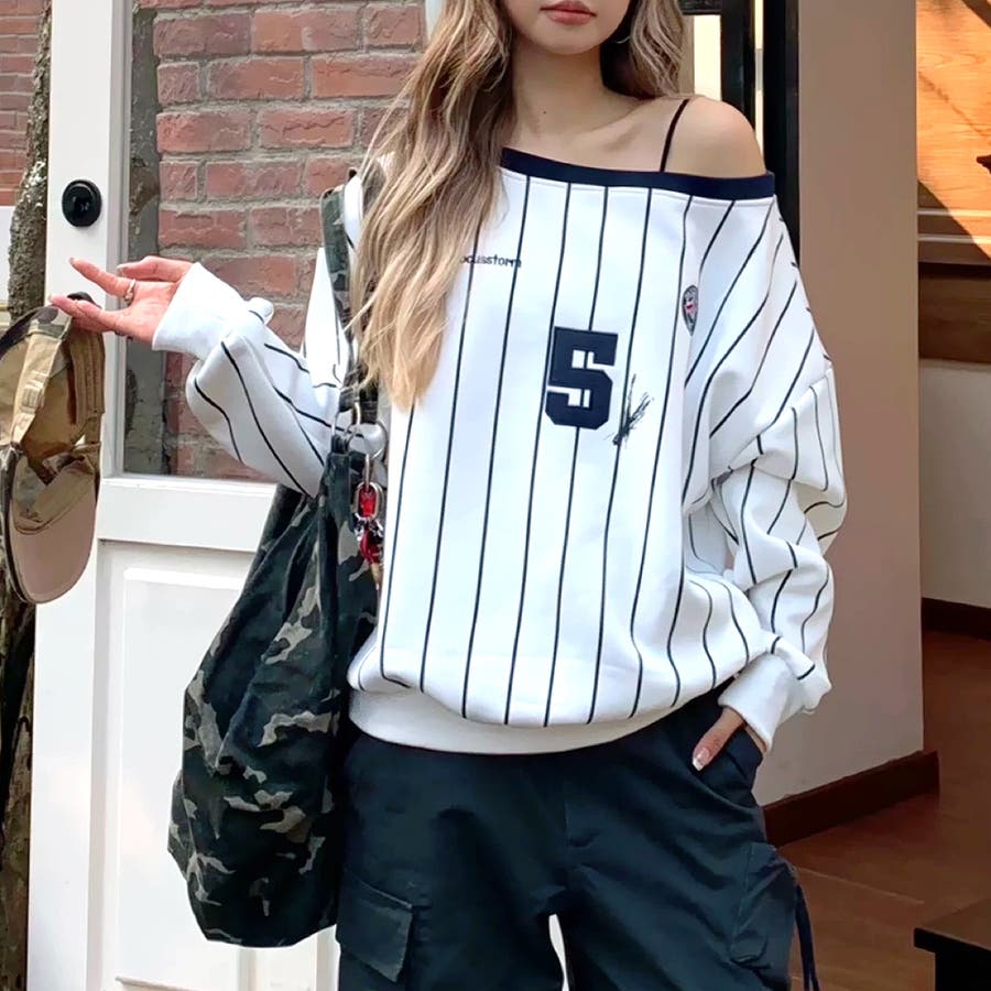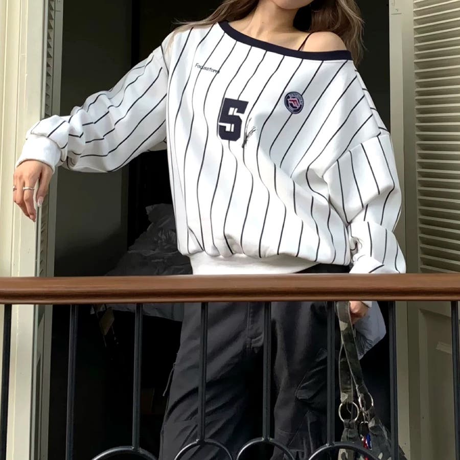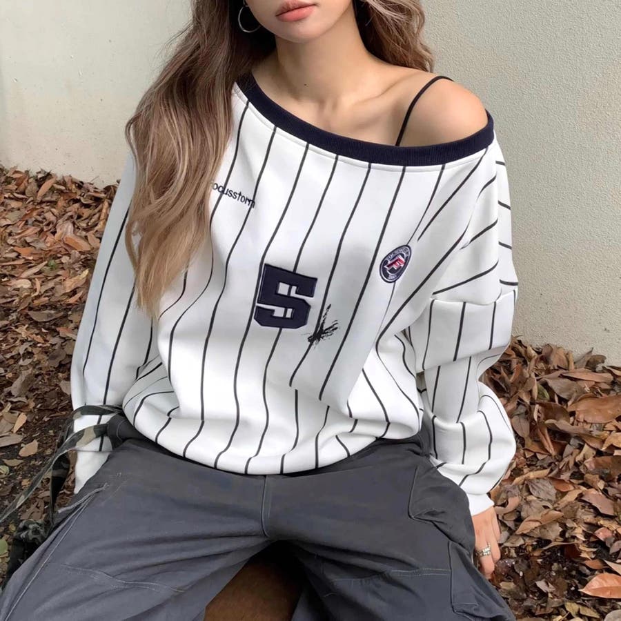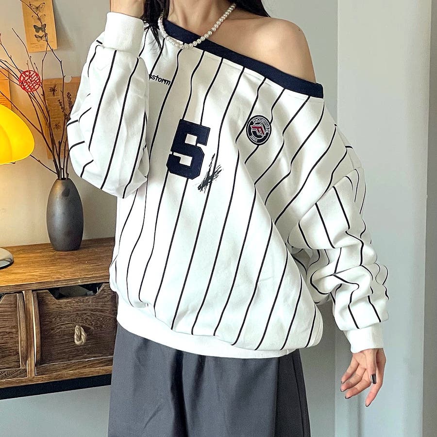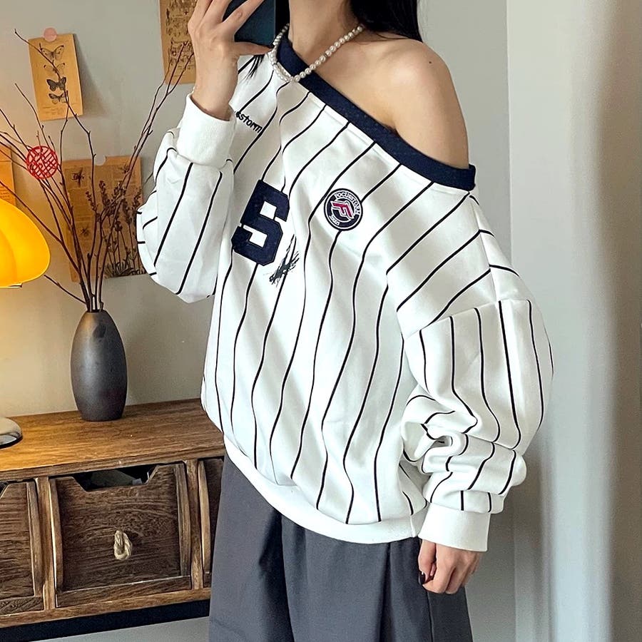 ピンストライプワンショルダーゲームシャツトレーナー 春 秋